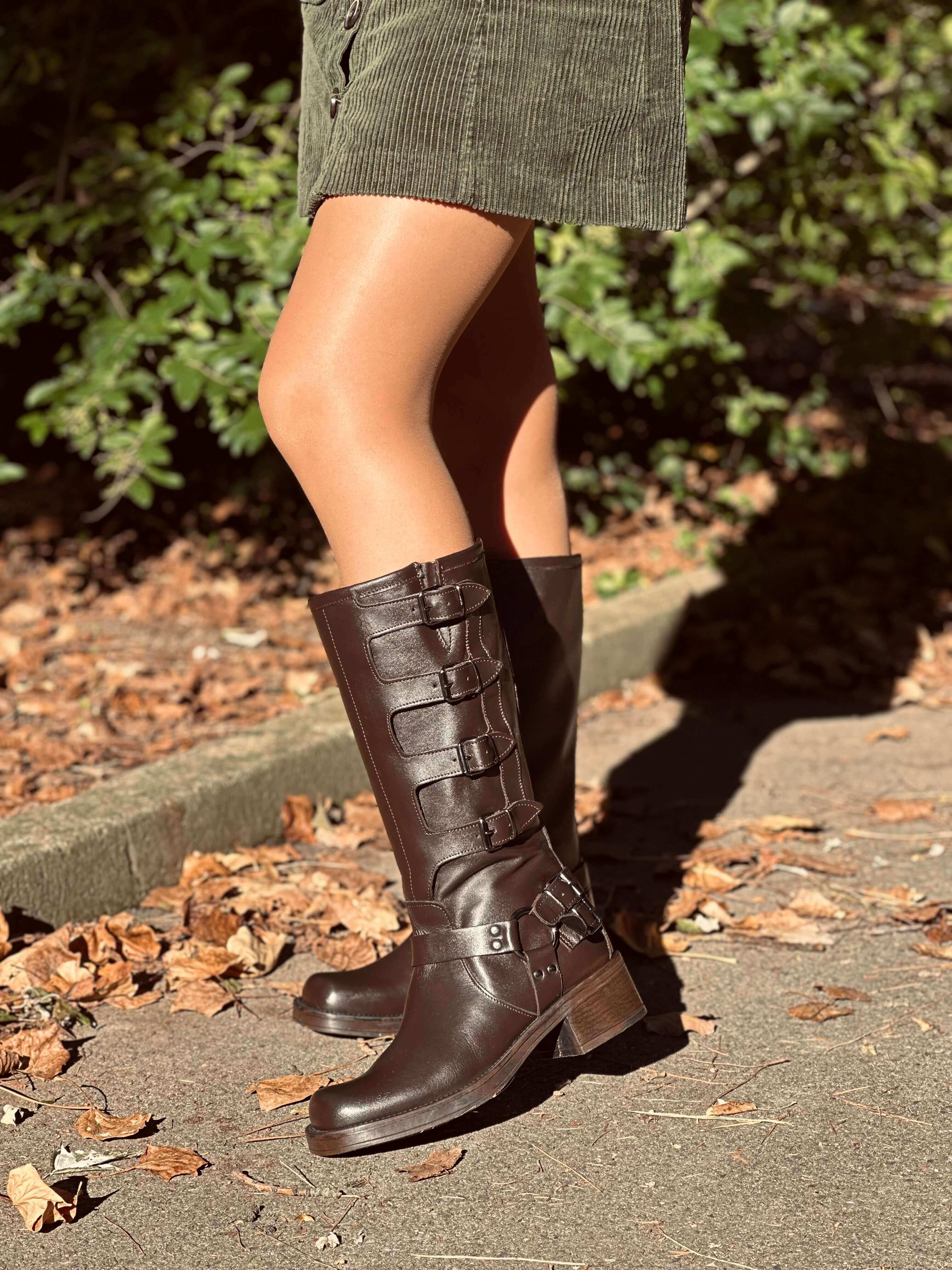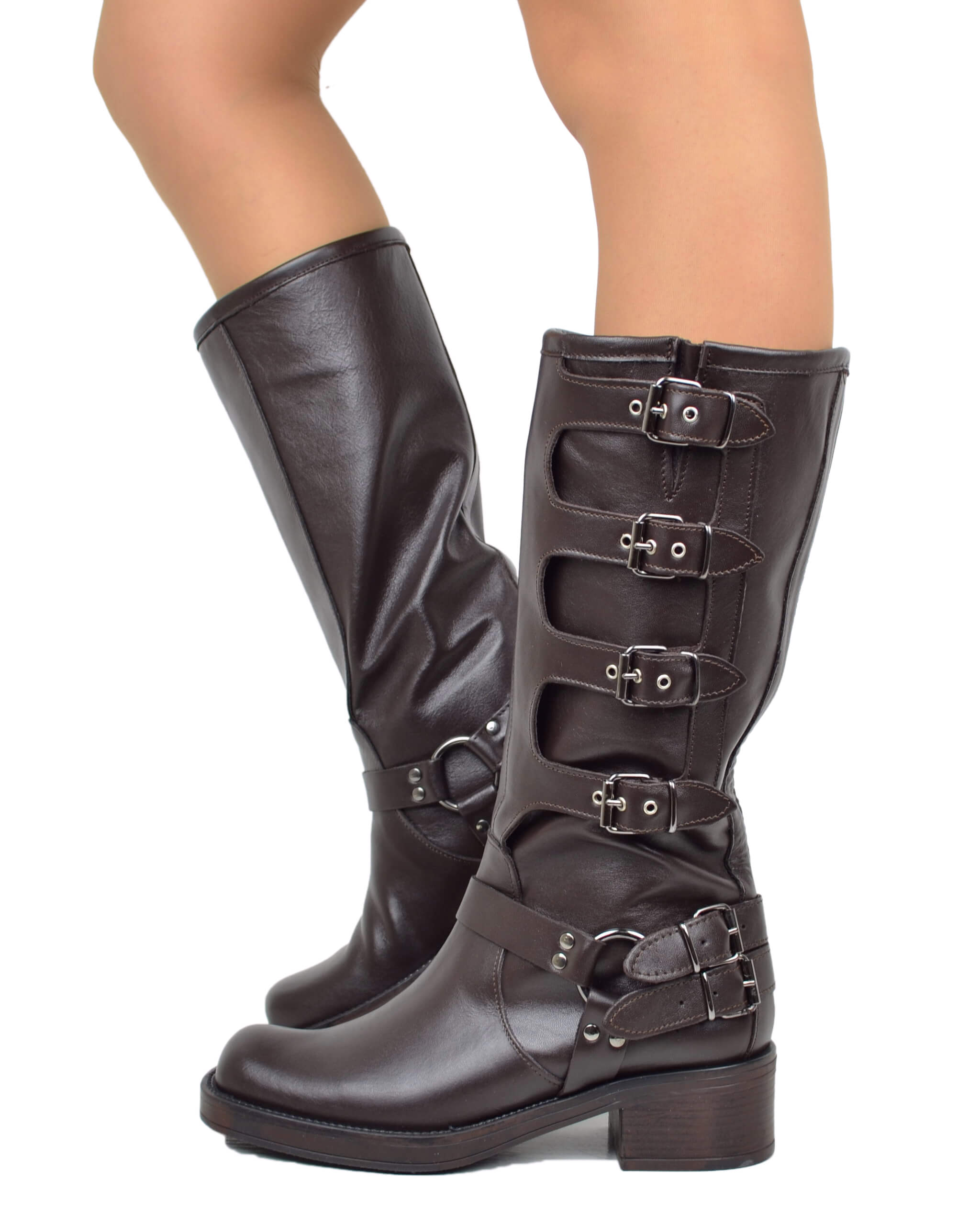 Biker-Stiefel Damen aus braunem Leder mit 5 Schnallen und eckiger Spitze – Made in Italy