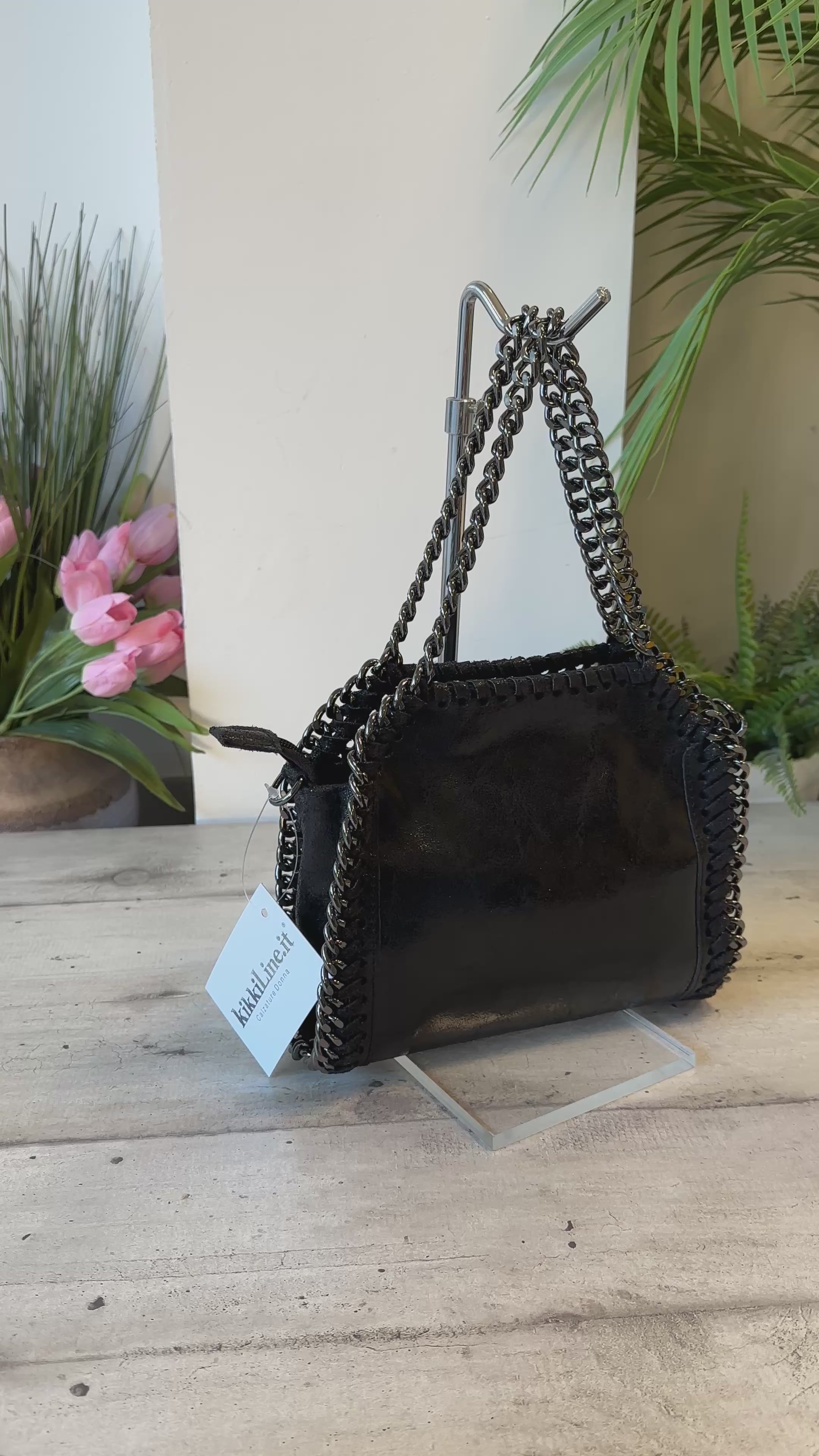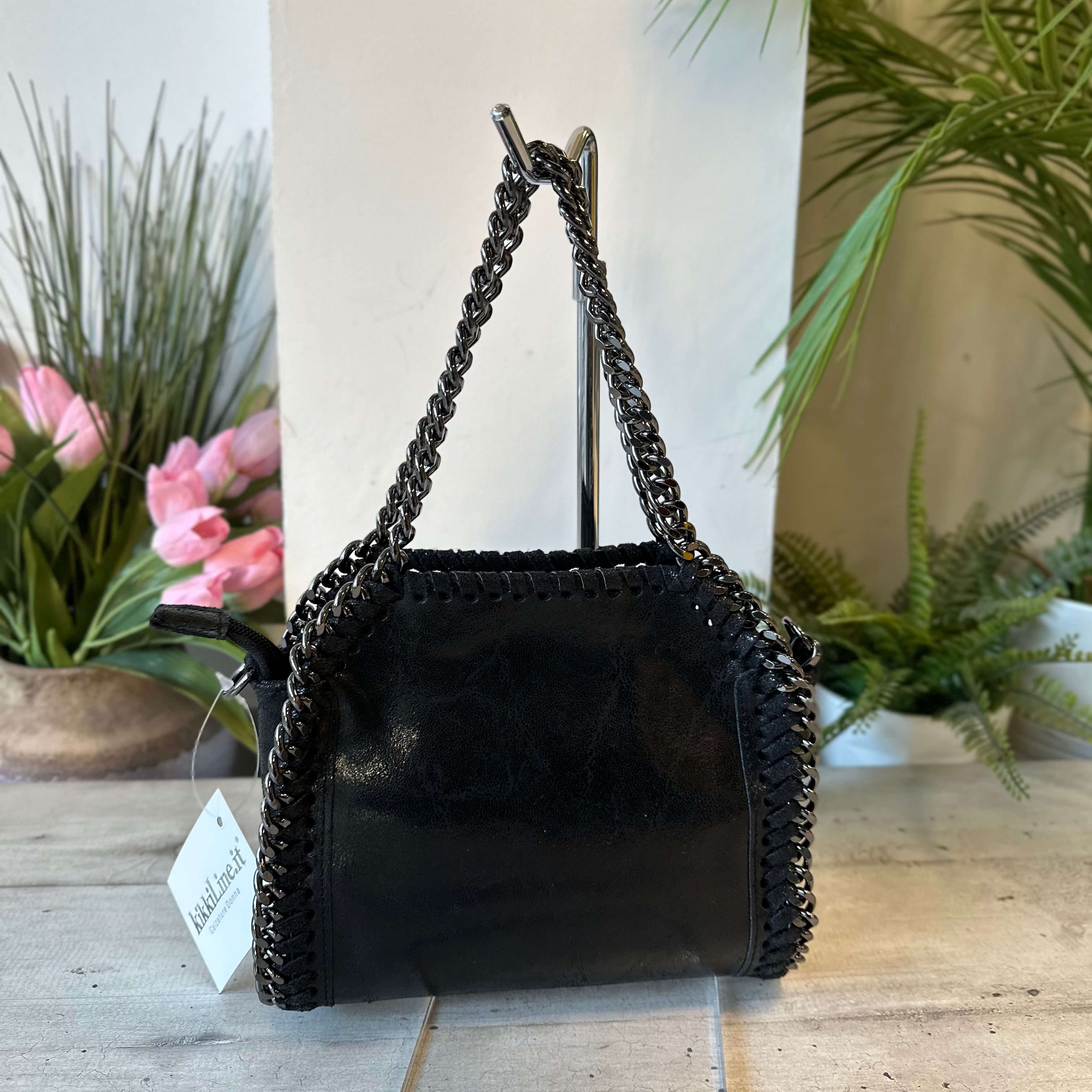 Tasche mit goldener Kette aus schwarzem Metallic-Leder