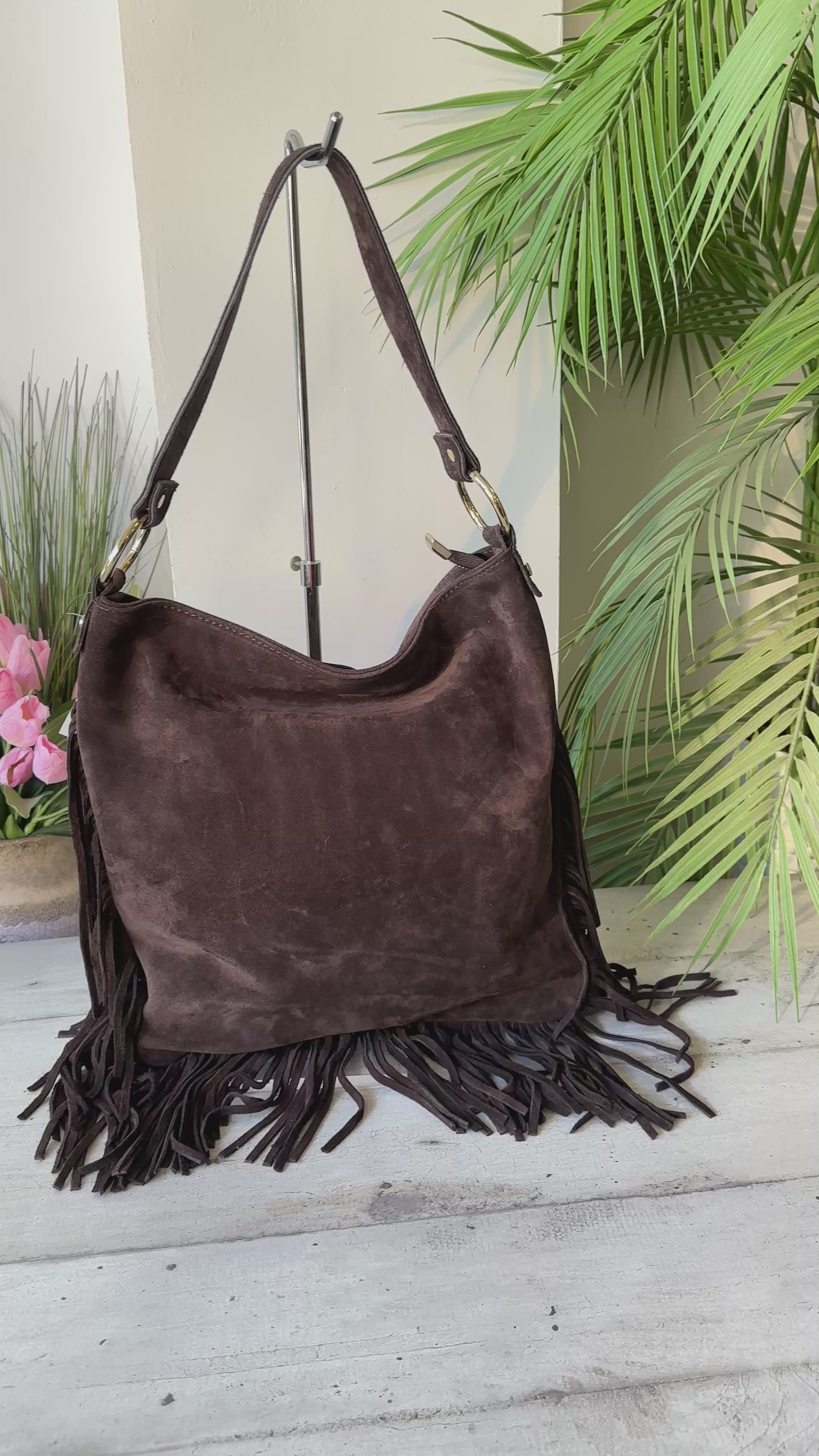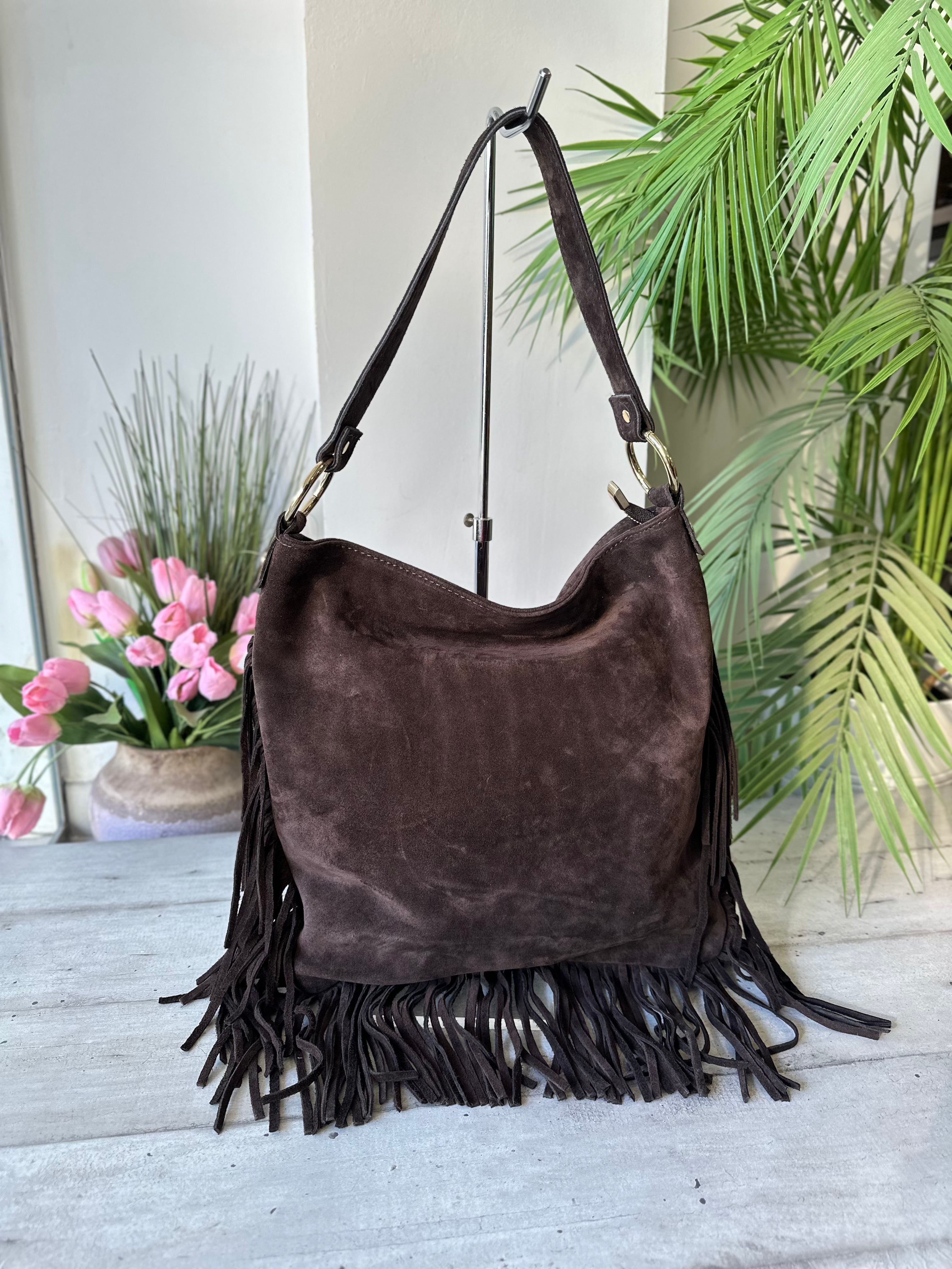 Borsa Grande Frange Pelle Scamosciata Marrone Rettangolare con Anelli e Tracolla