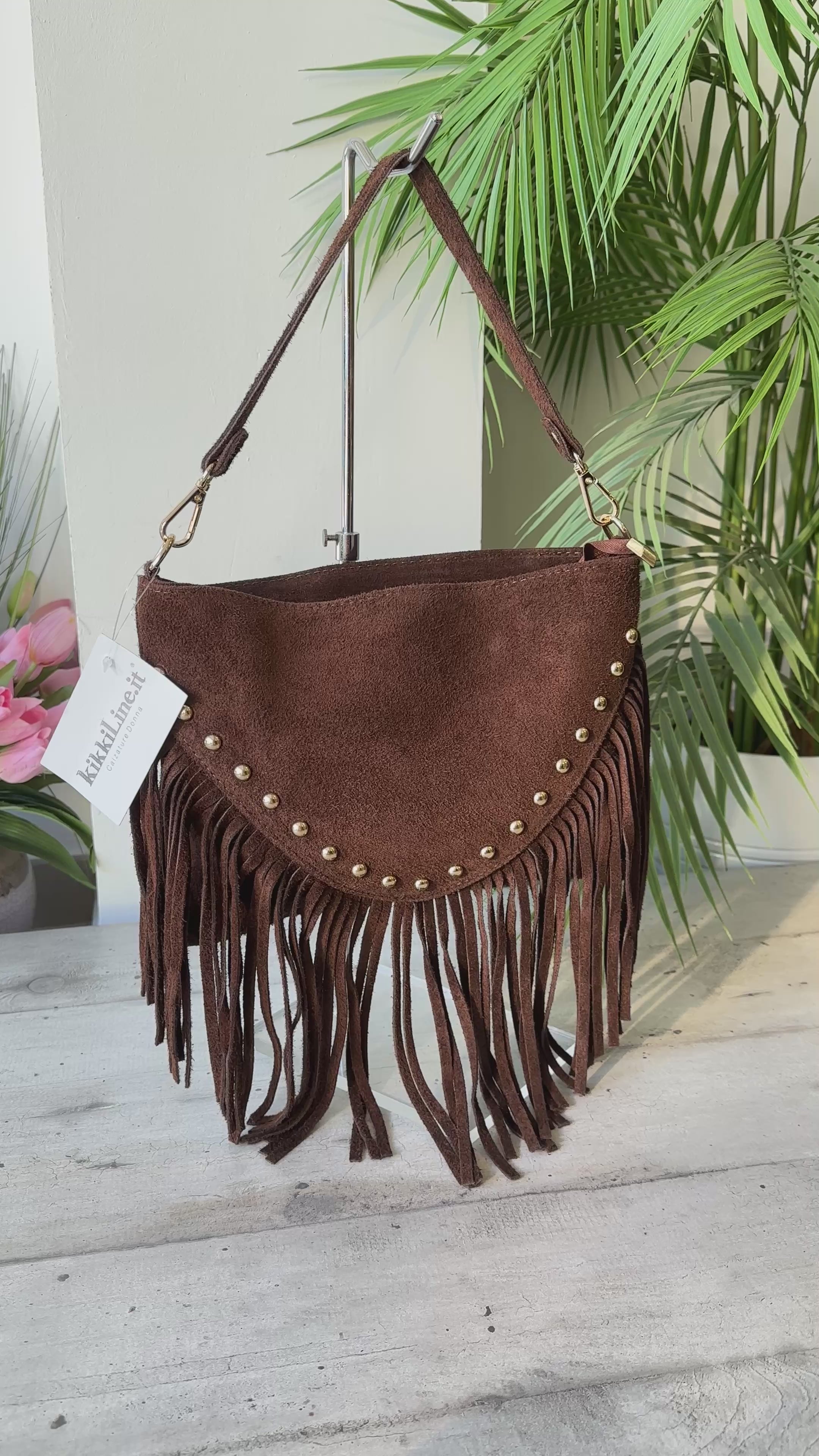 Braune Rechteckige Schultertasche mit Fransen und Goldnieten – VIOLA