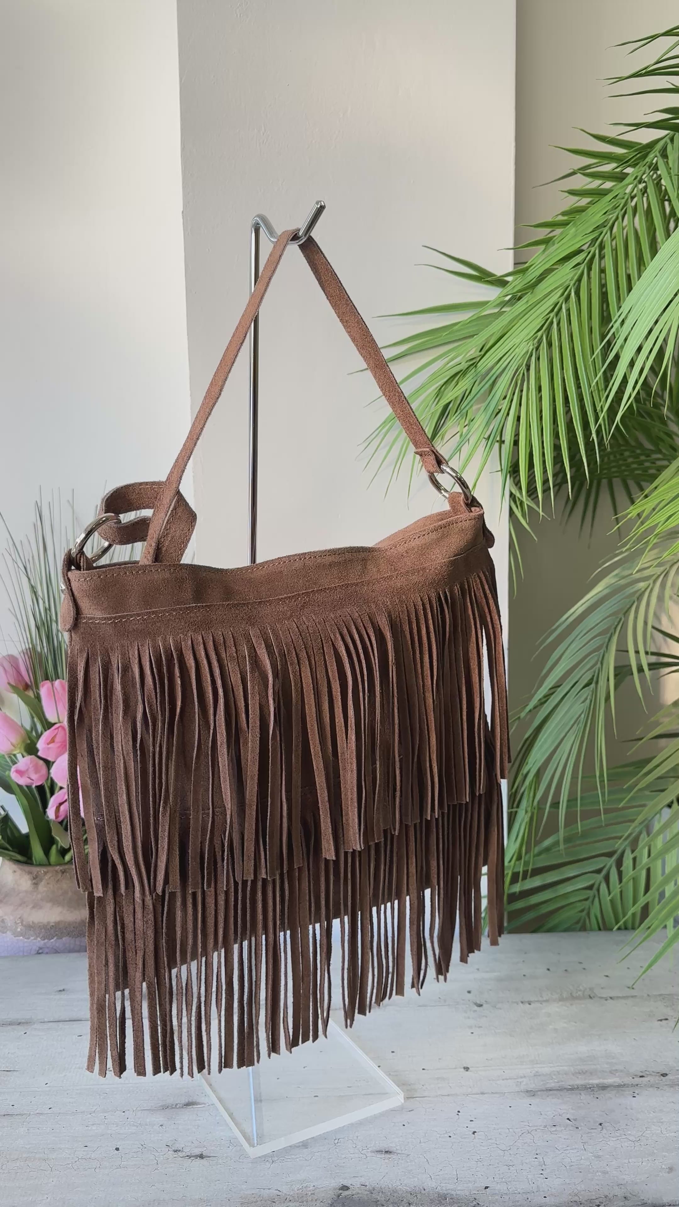Braune Wildleder-Tasche mit Fransen und Silberringen – Cowboy Style FENICE