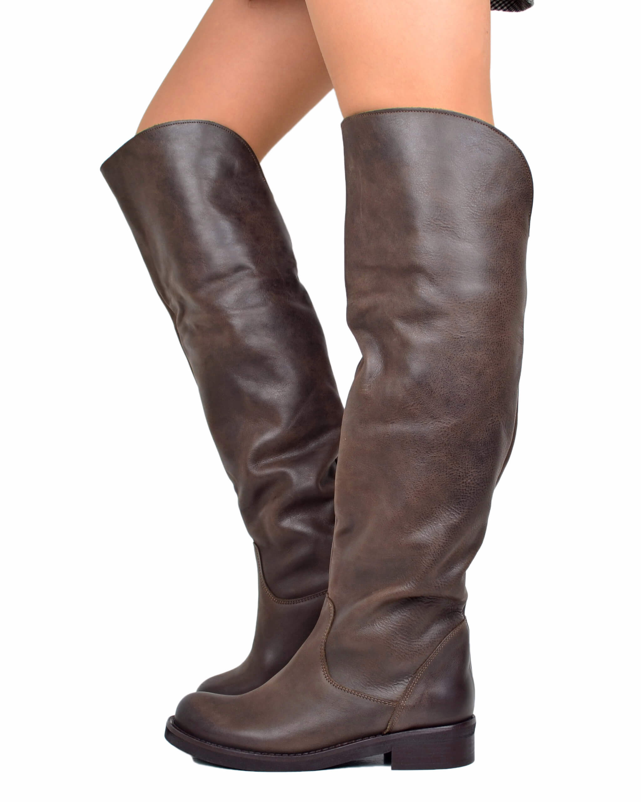 Kniehohe Stiefel aus dunkelbraunem Leder mit niedrigem Absatz