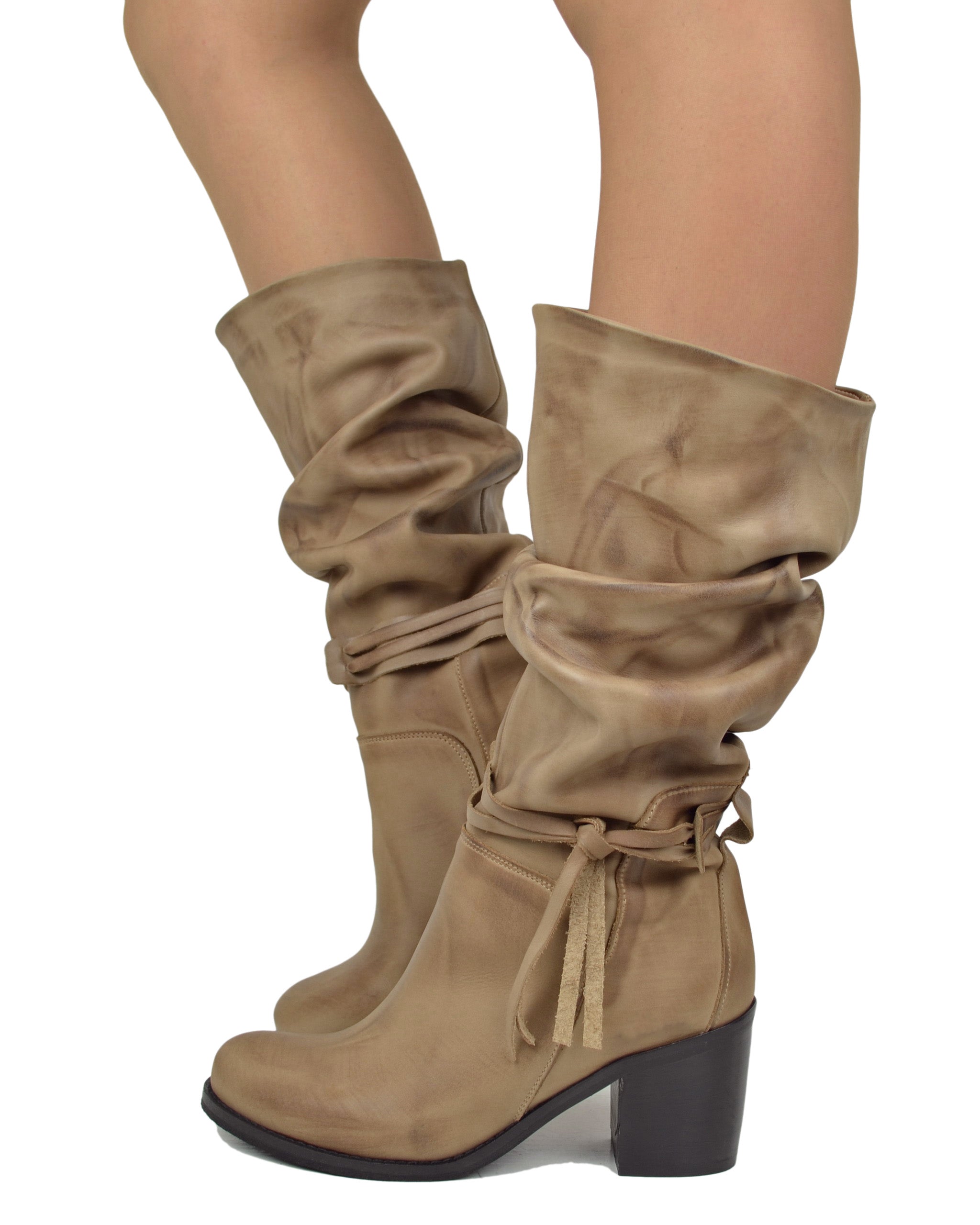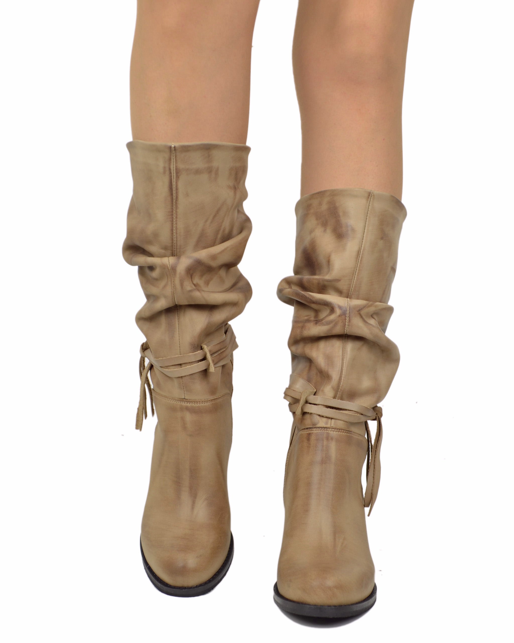 Mittelhohe Stiefel aus Veloursleder in Taupe mit konischem, gefaltetem Schaft