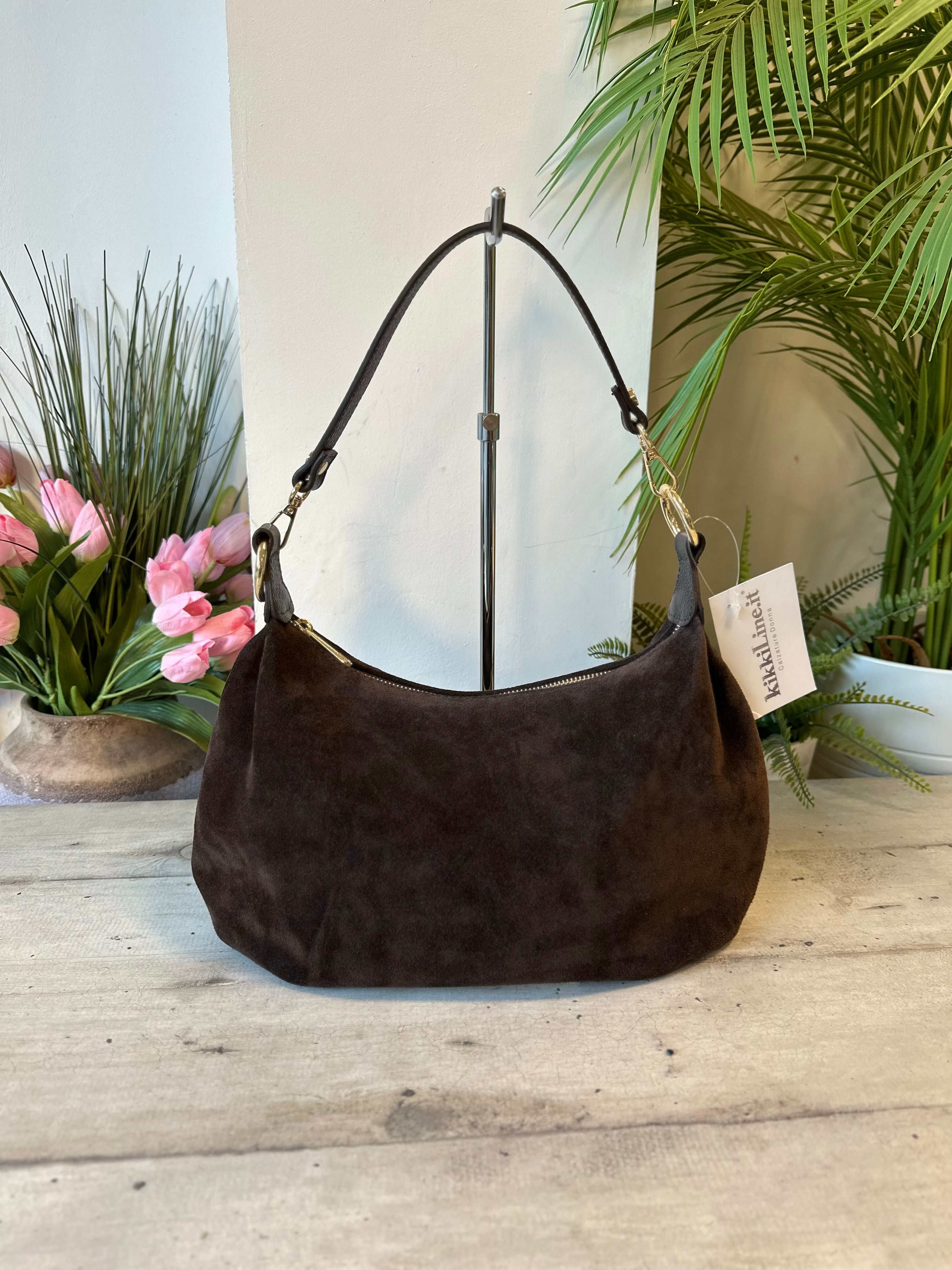 Elegante Schultertasche aus weichem Wildleder in Schokoladenbraun, mit plissiertem Design und goldfarbenen Ringen.