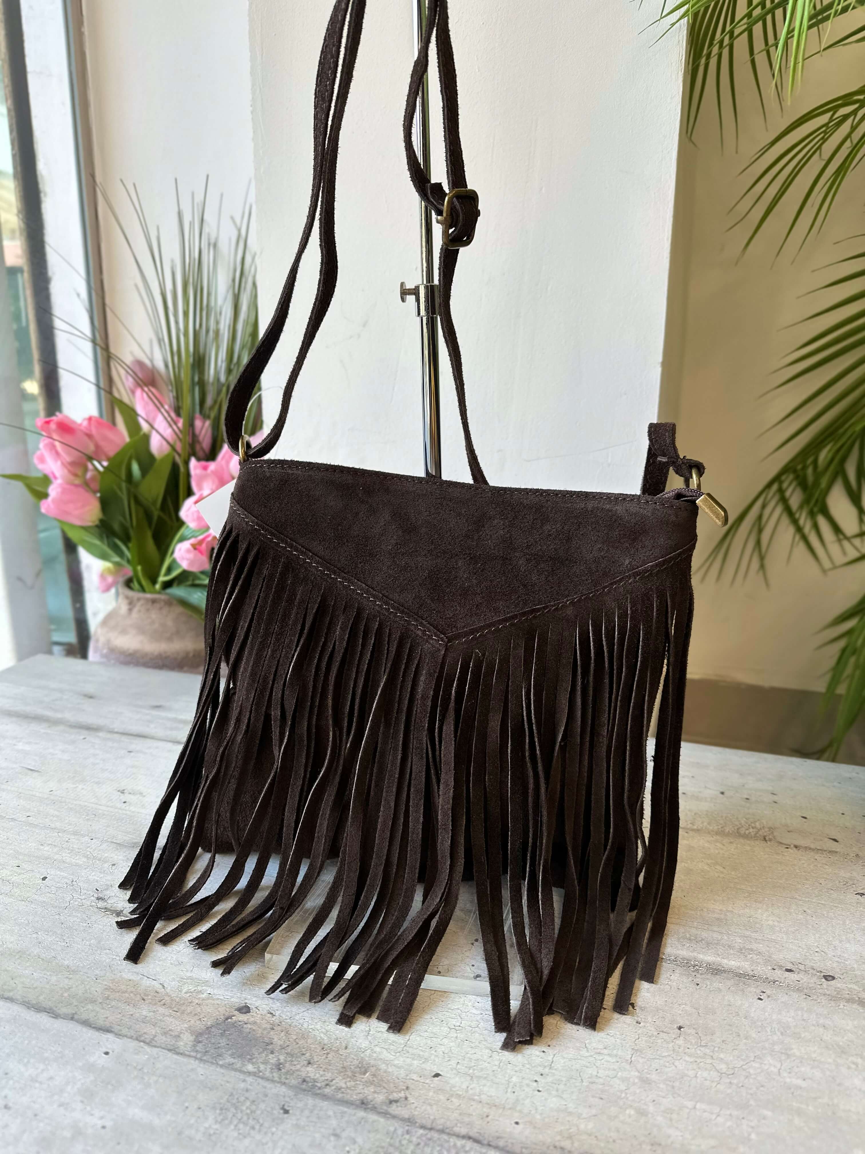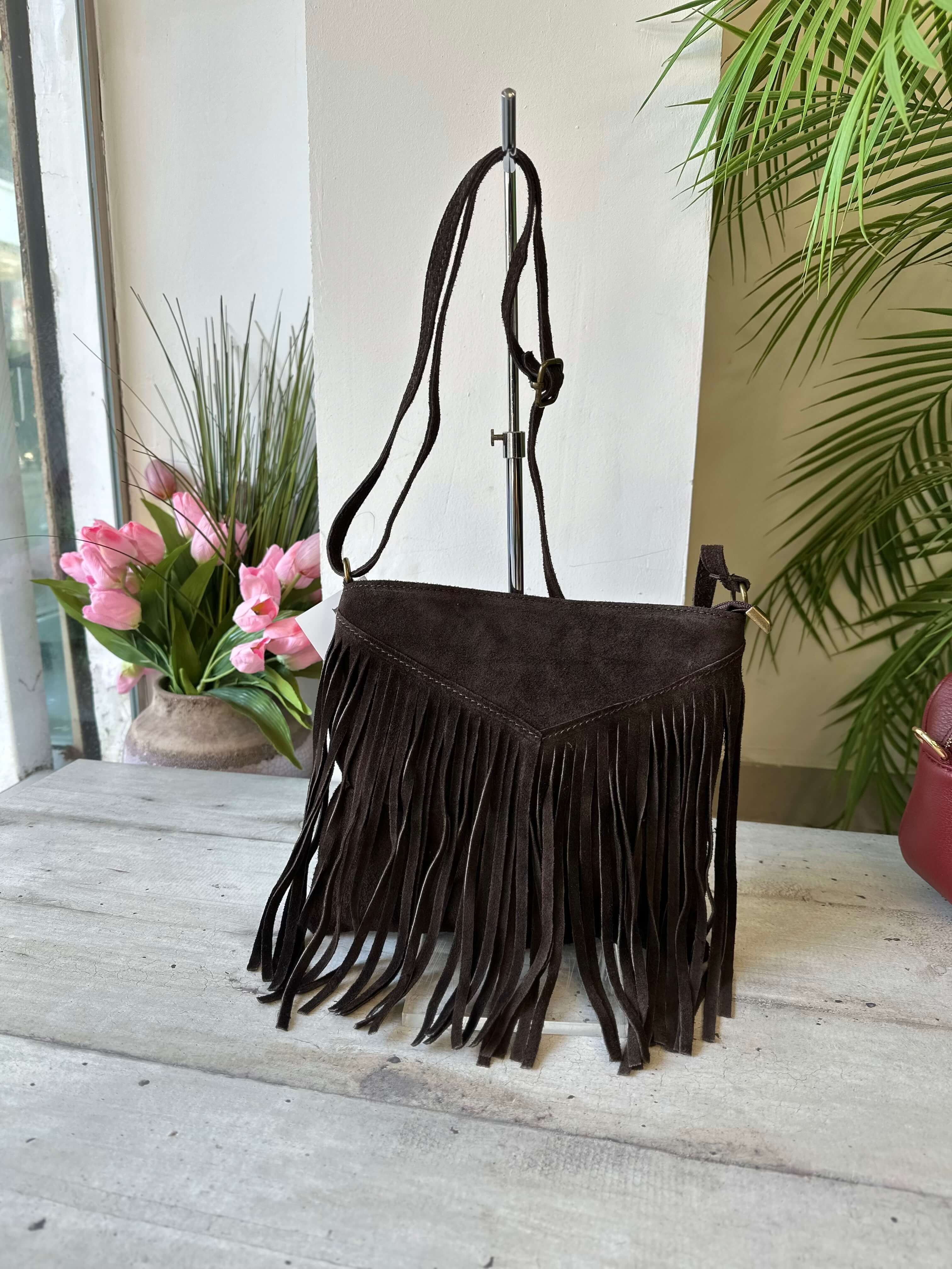 Umhängetasche aus echtem Wildleder mit Fransen – Schokoladenbraun