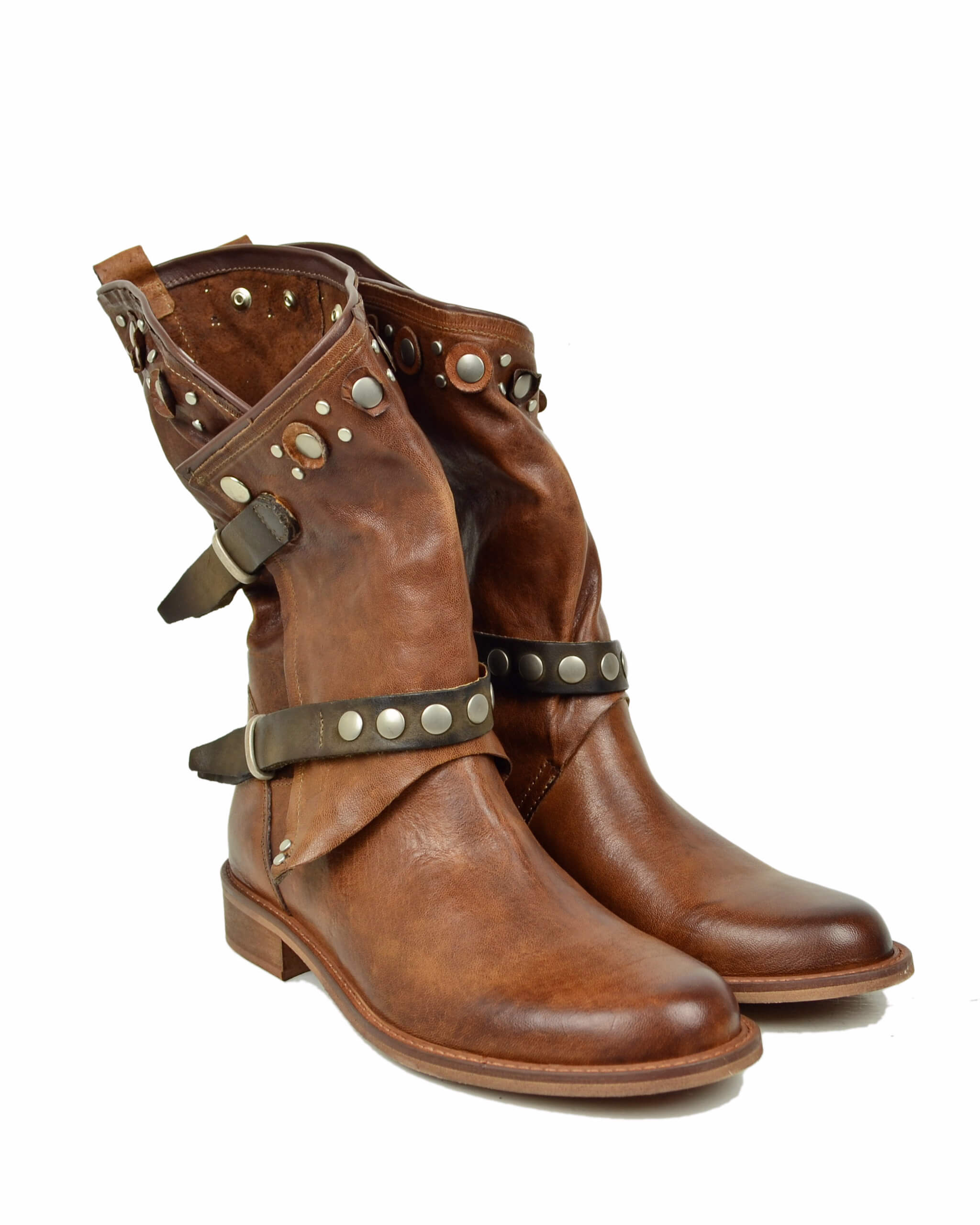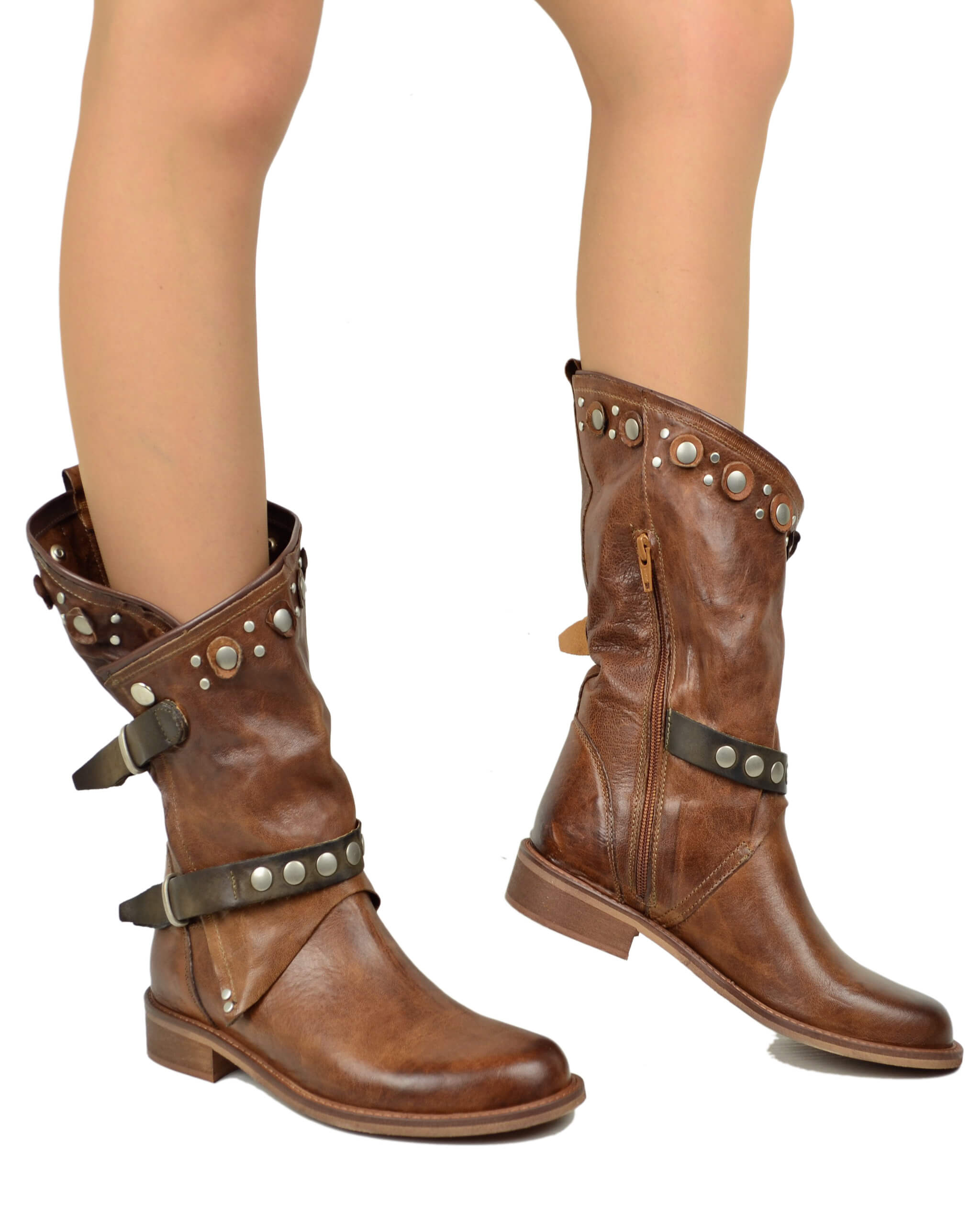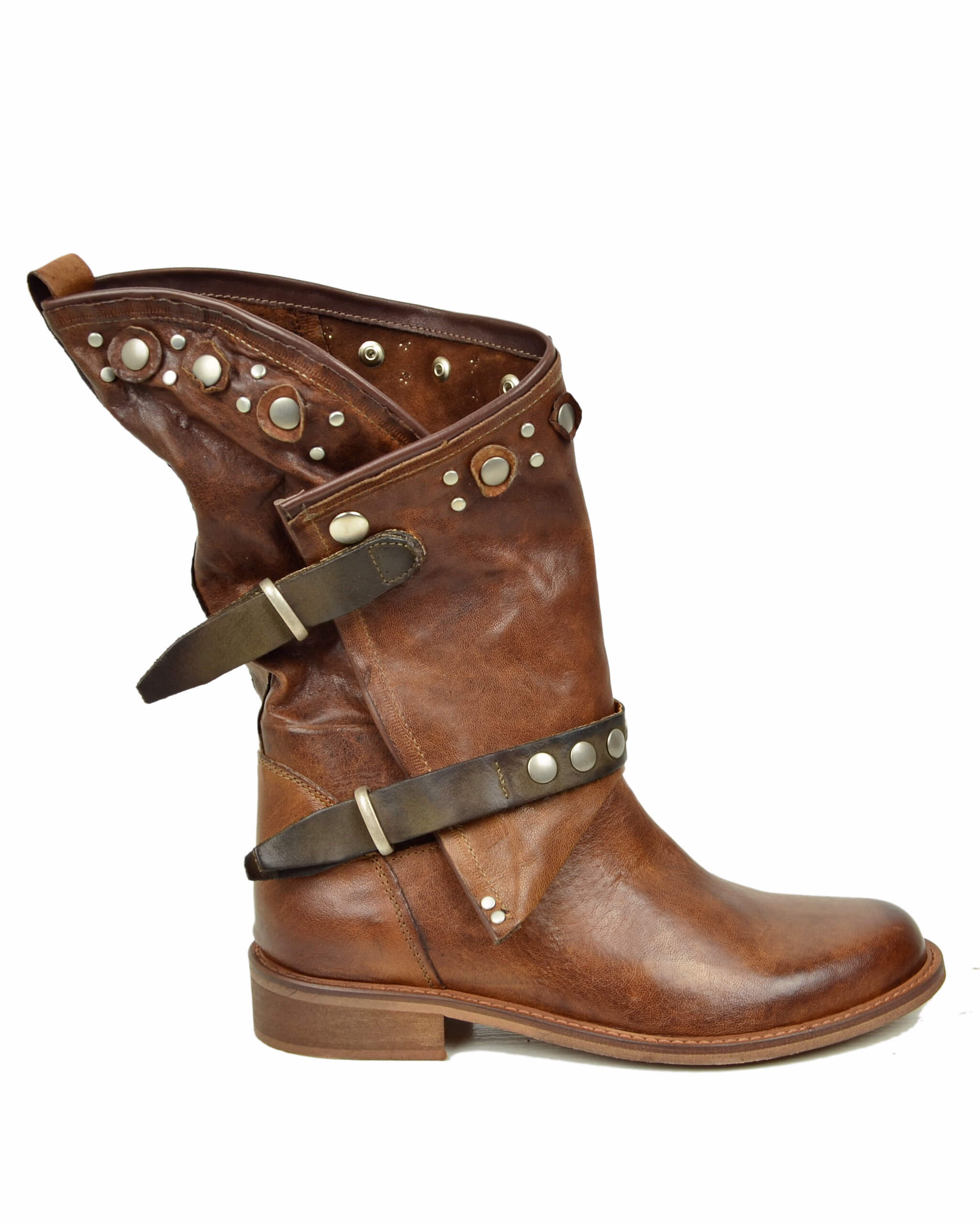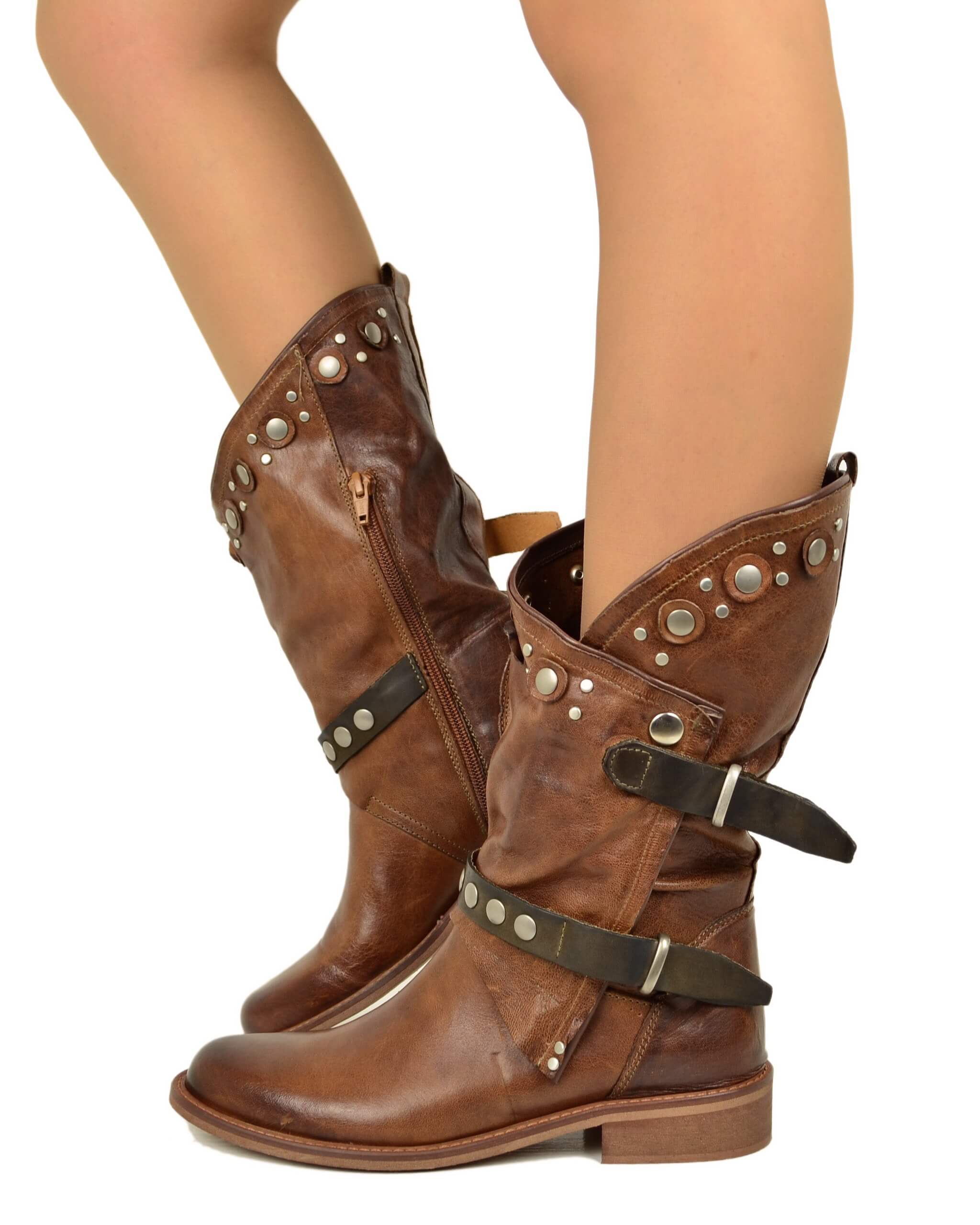 Biker Cacao in Pelle Sfumata con Gambale Largo e Sfoderato Stivali Borchiati