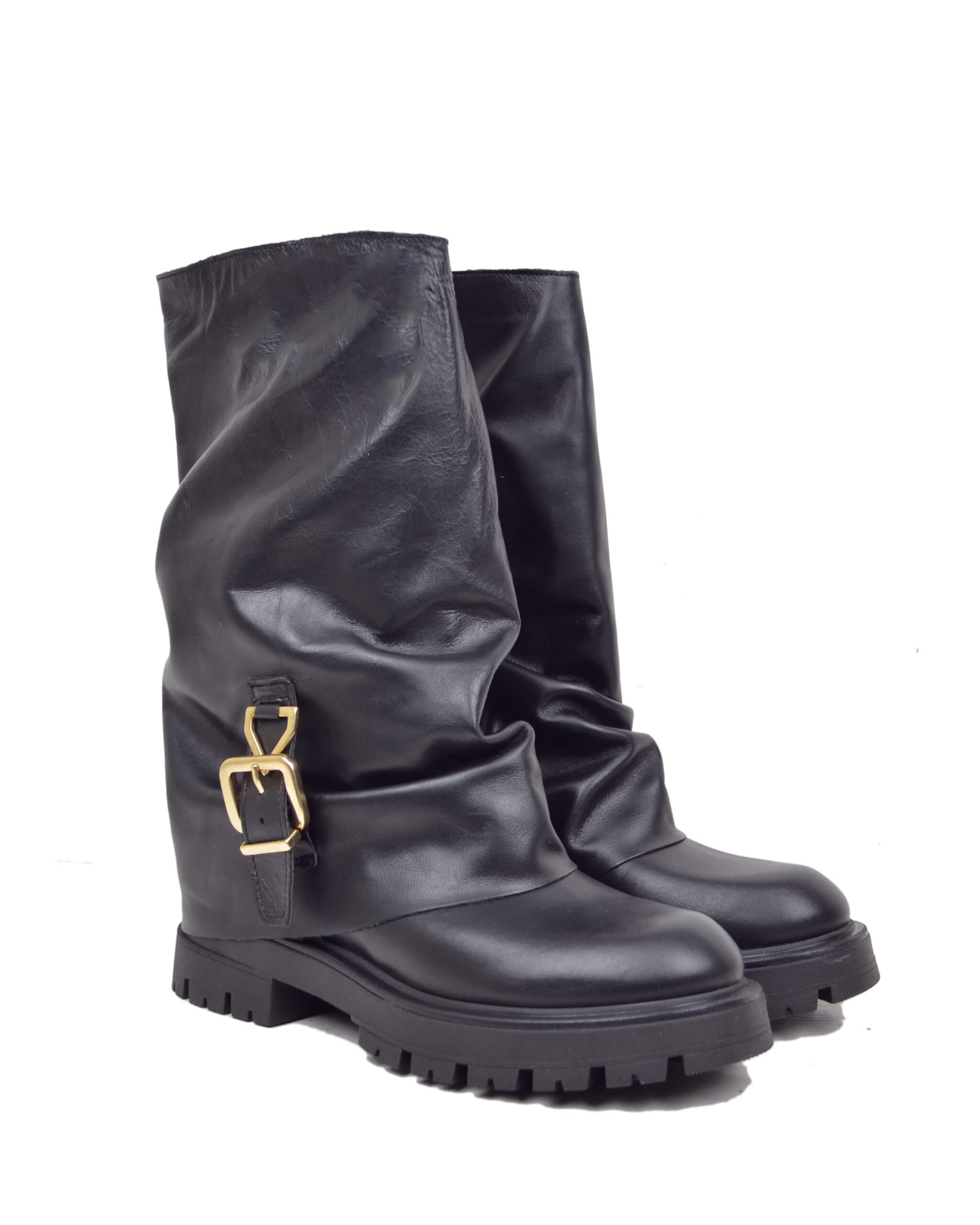 Black Leather Biker Boots with Gaiter and Buckle – Made in Italy