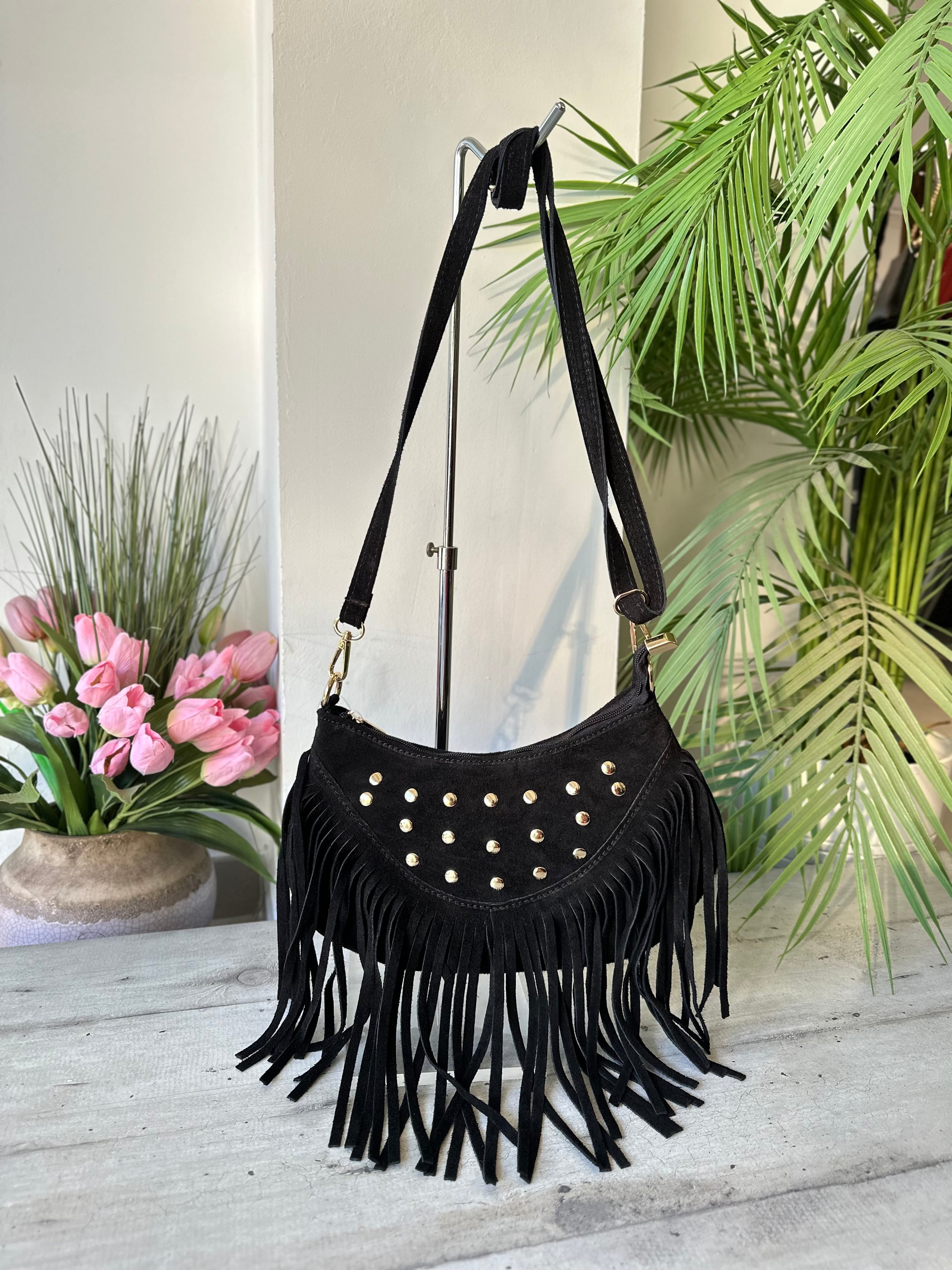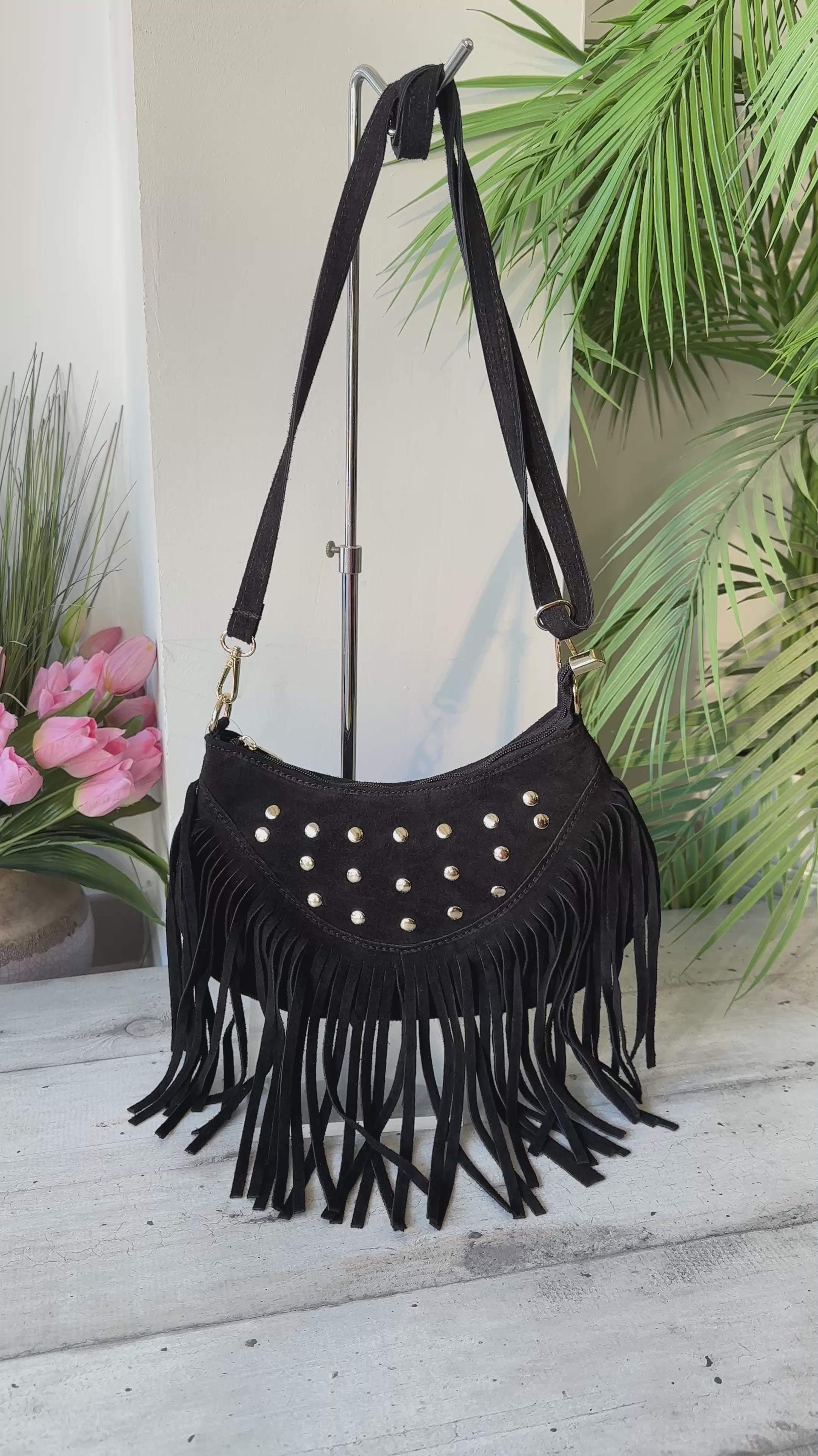 Crossbody bag in genuine black suede leather, inspired by boho-Indian style. Featuring decorative studs and long fringes, handcrafted in Italy. Lightweight, practical, and perfect to add a bold and stylish touch to any outfit.