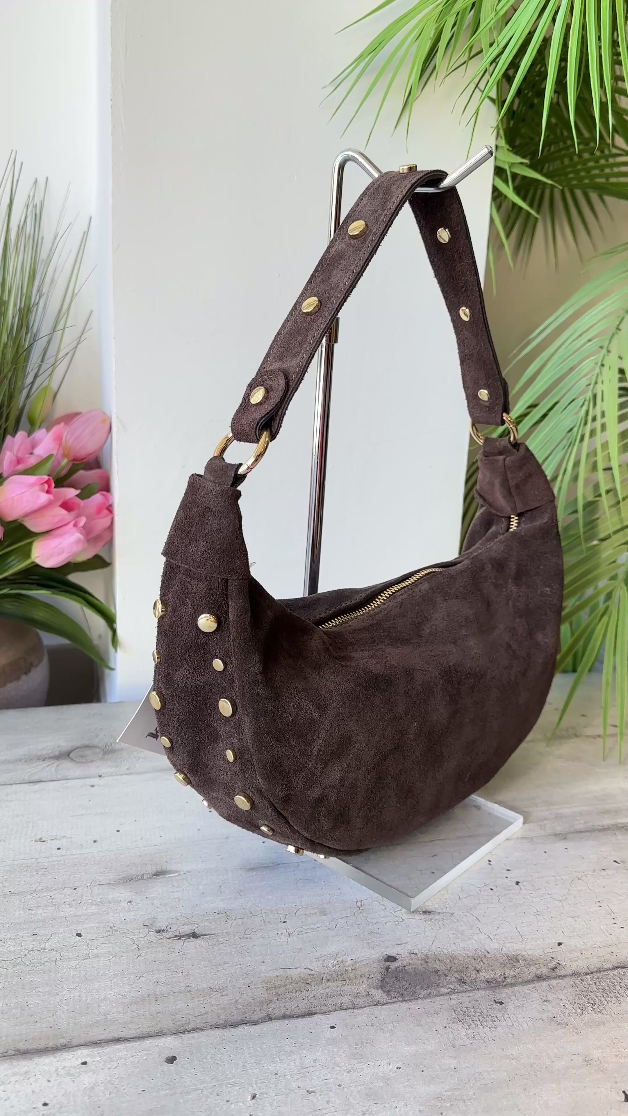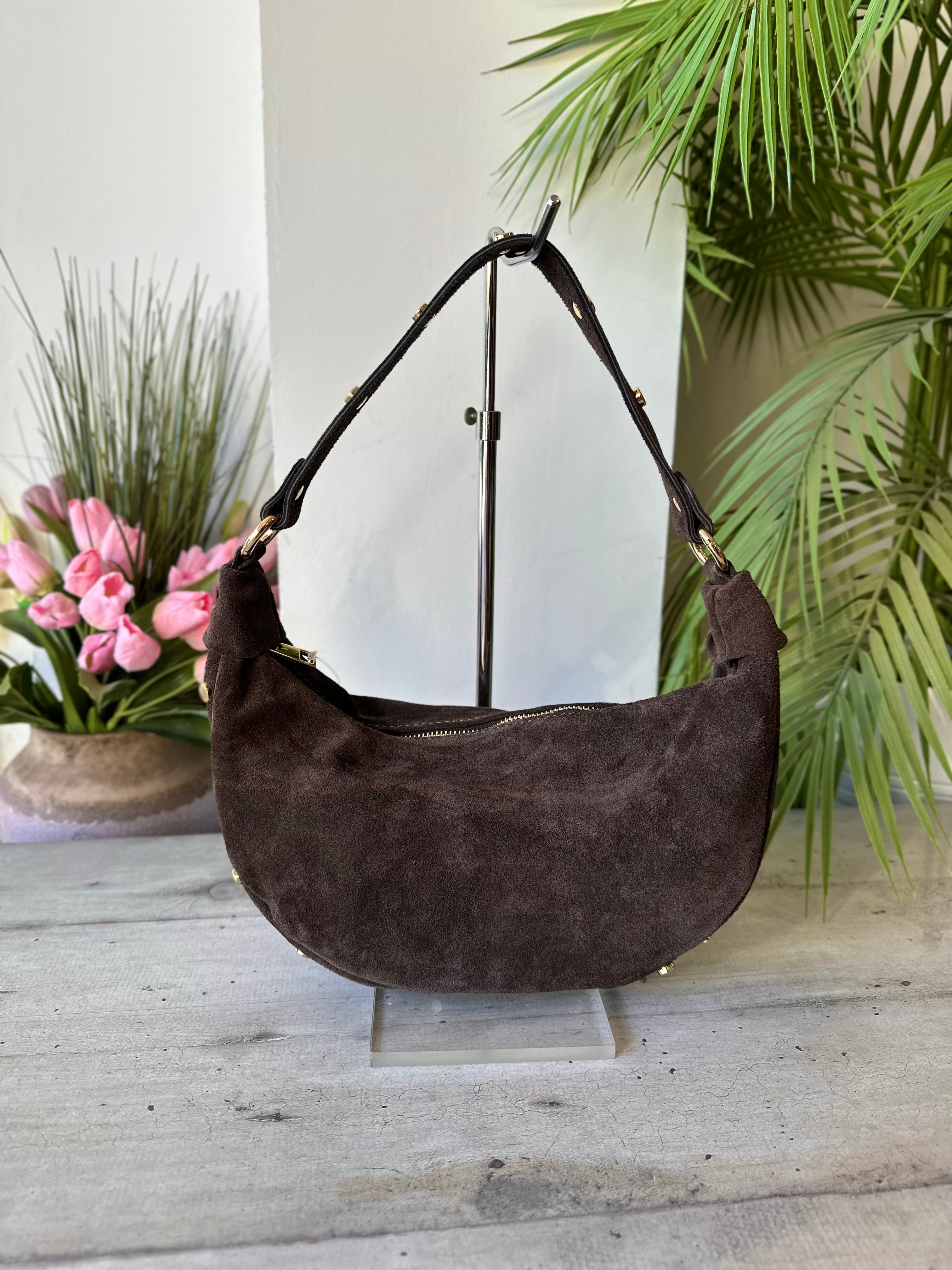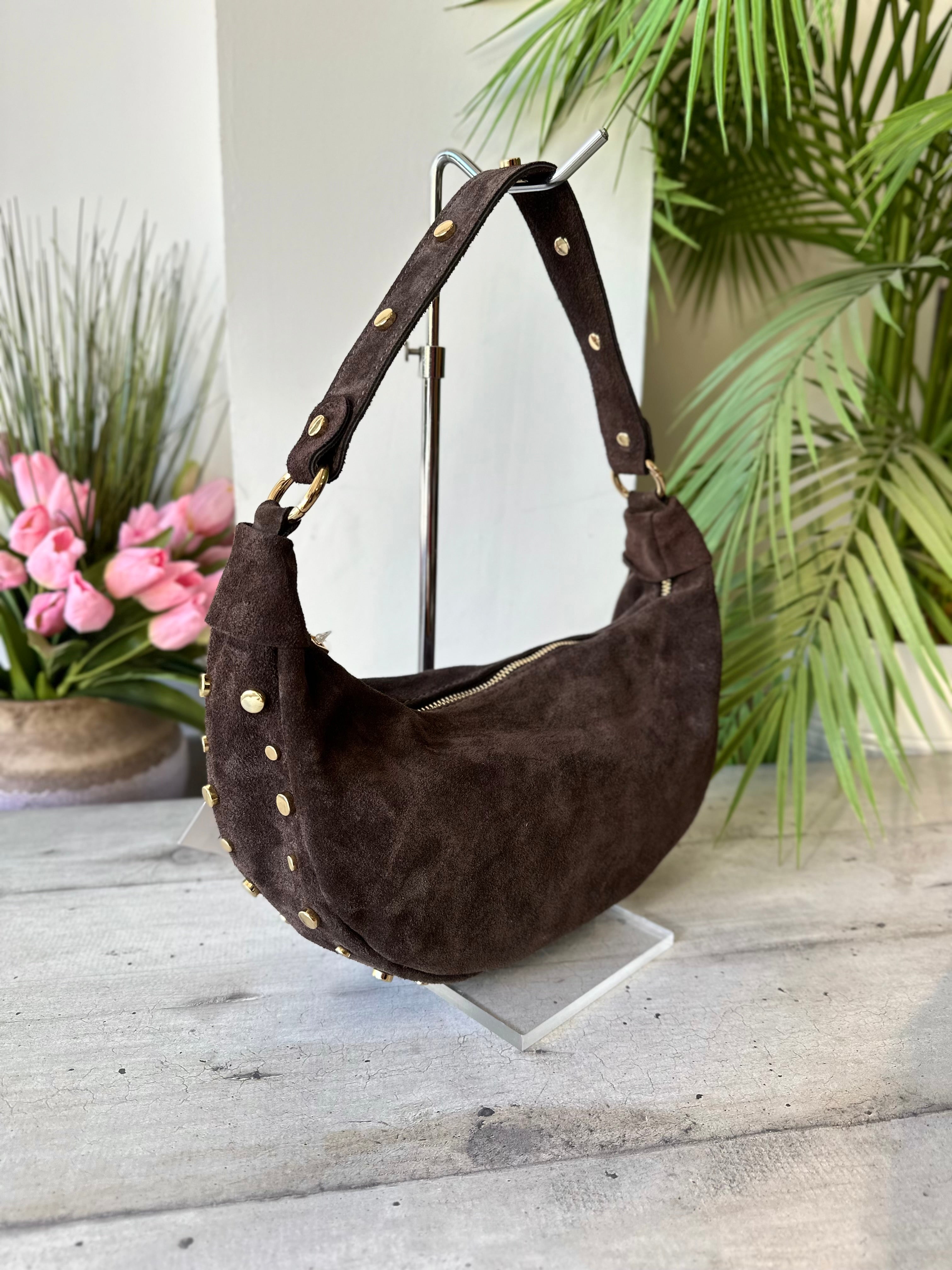 Elegant half-moon shoulder bag decorated with small golden studs. Handcrafted in Italy from premium leather, it combines charm and functionality. Lightweight and stylish, perfect to complete any outfit with a chic, confident touch.