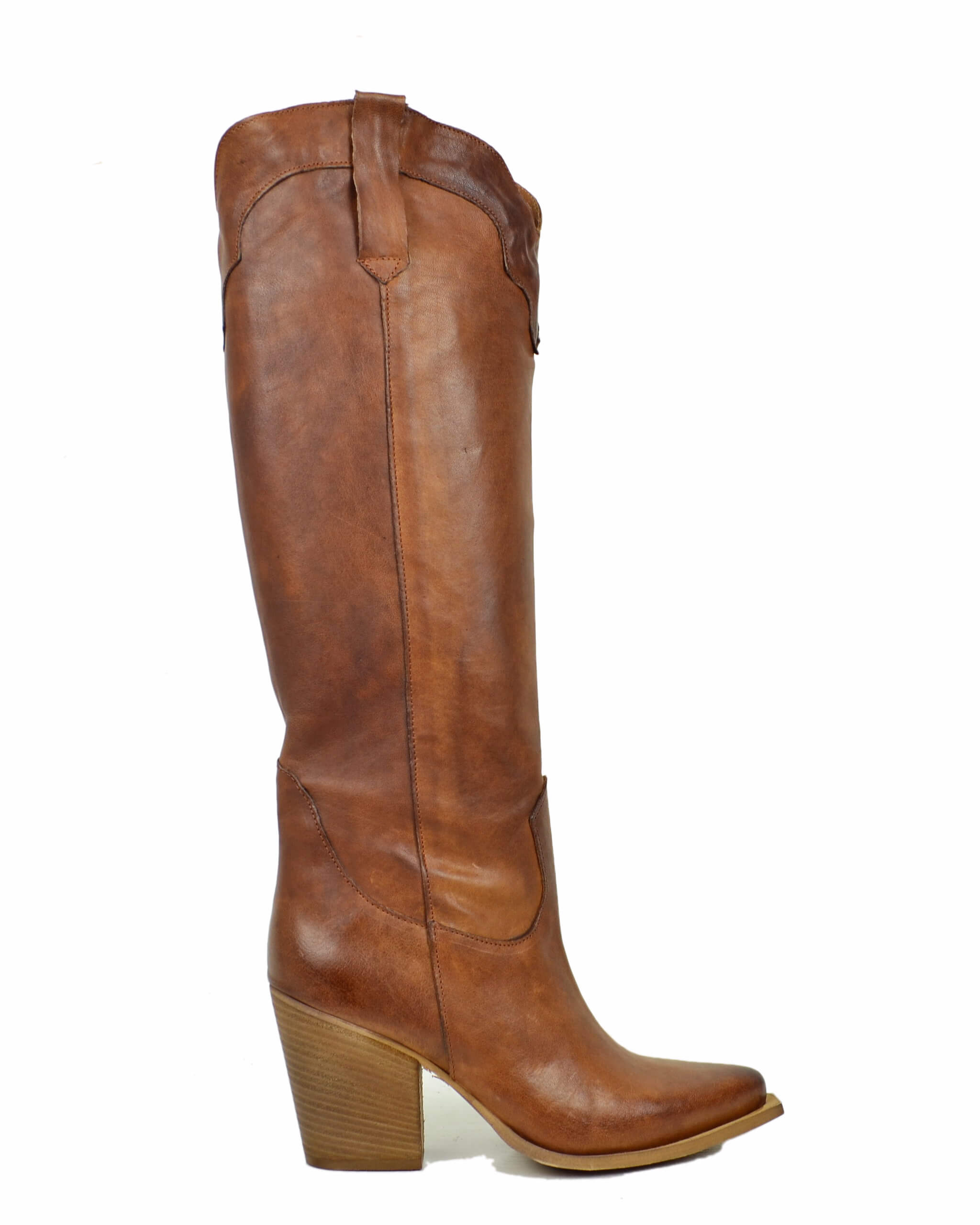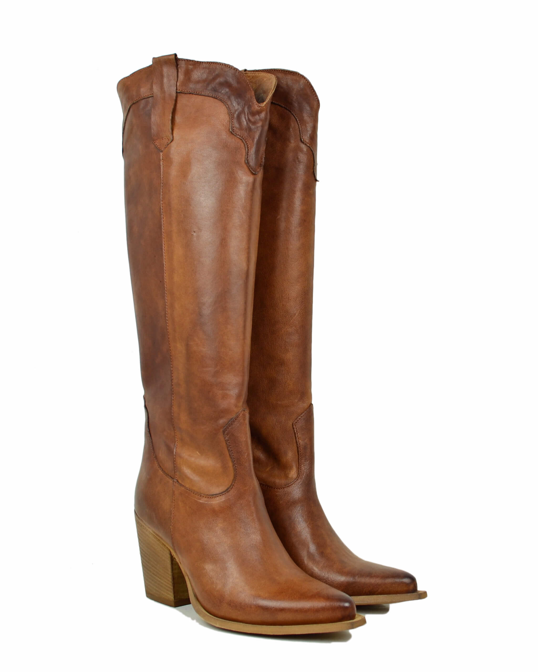 Discover our timeless western boots! These elegant knee-high cowboy boots in genuine vintage tan (Cuoio) leather capture the true cowboy spirit with authentic style. The 9 cm heel creates a flattering silhouette and a confident stride—perfect if you love to make an impact. Crafted from quality materials, they combine comfort and character for a look that won’t go unnoticed