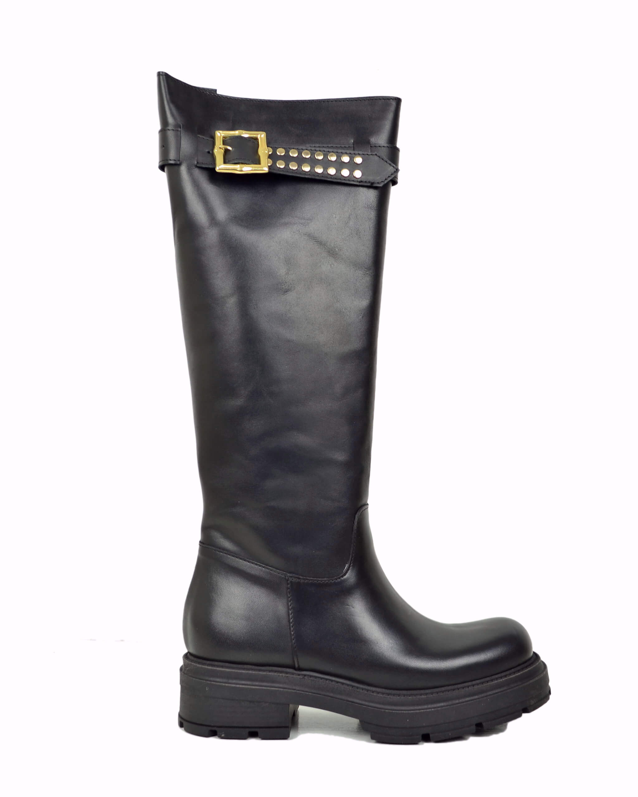 Long-Shaft Leather Boots with Gold Buckle and Studs – Square Toe & Platform