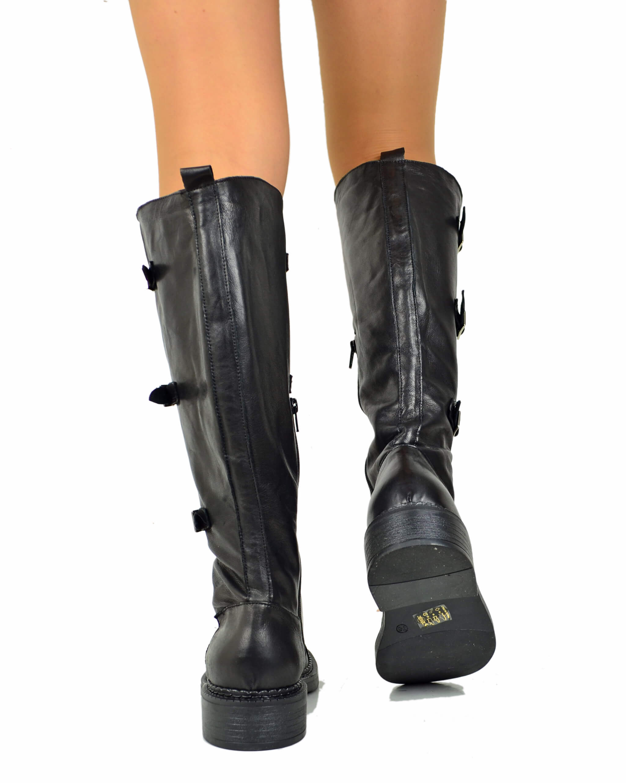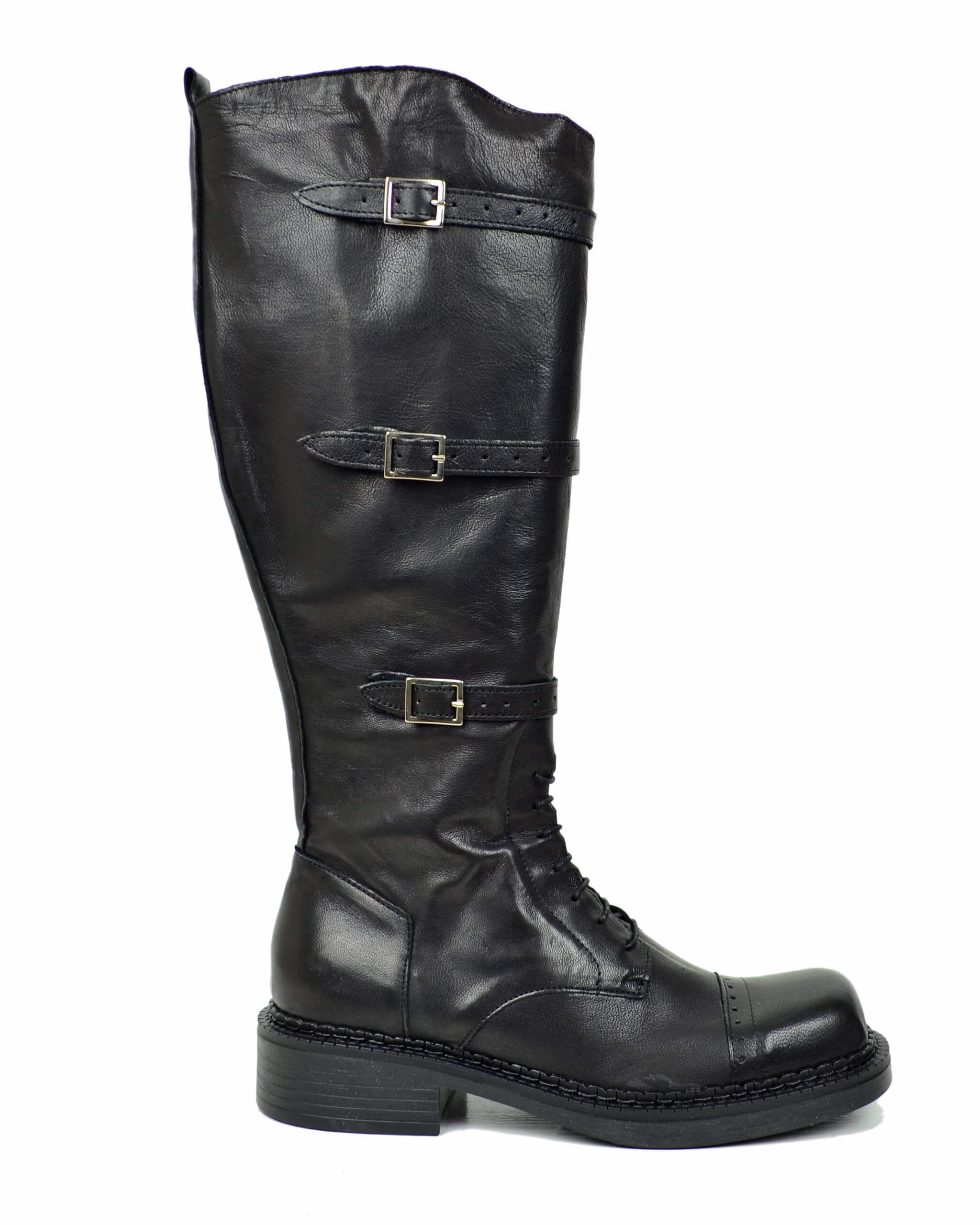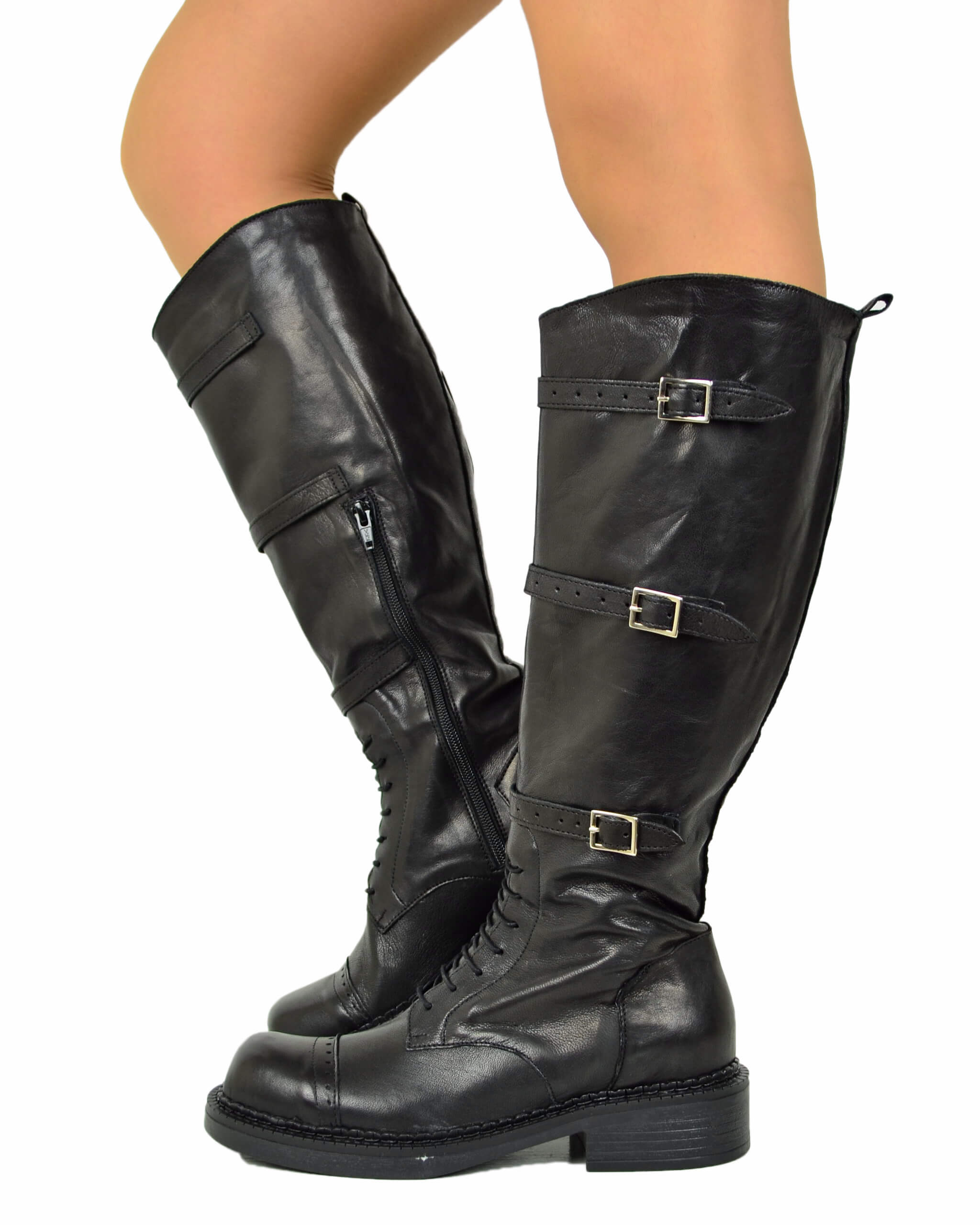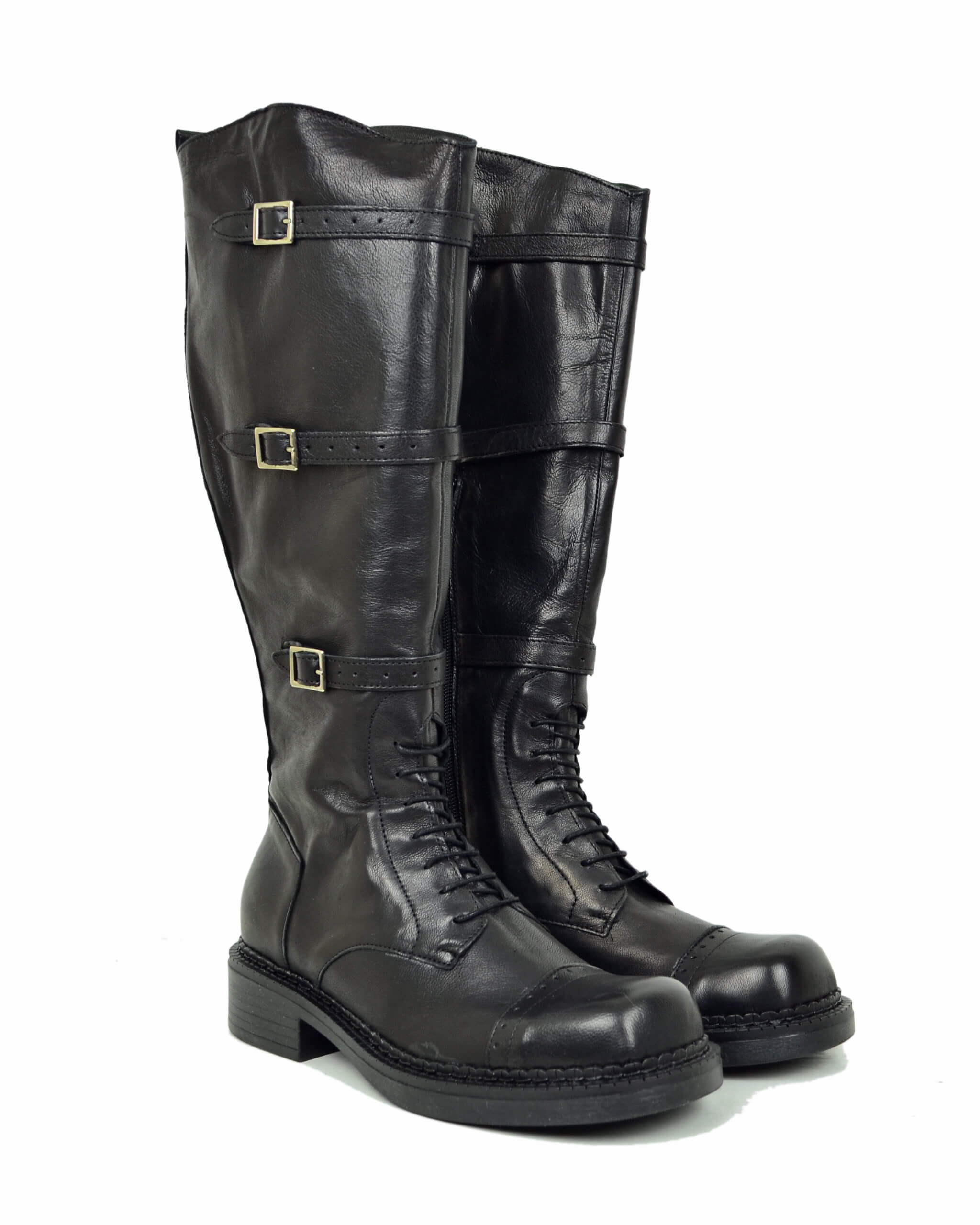 Stivali Biker Alti con Lacci Punta Quadrata Vera Pelle Coda di Rondine