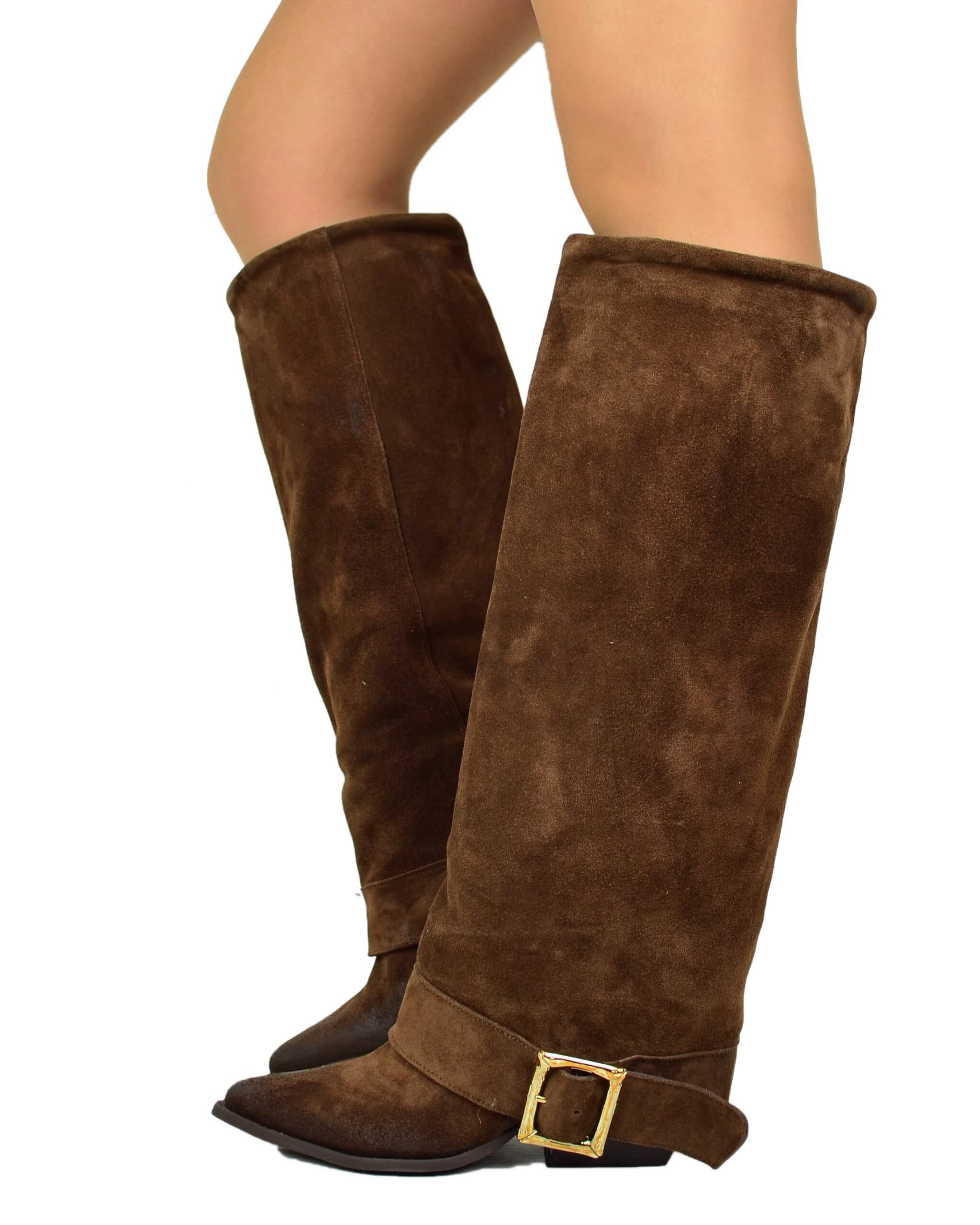 Stivali Texani Alti Overknee Scamosciati Marrone con Fibbia Made in Italy