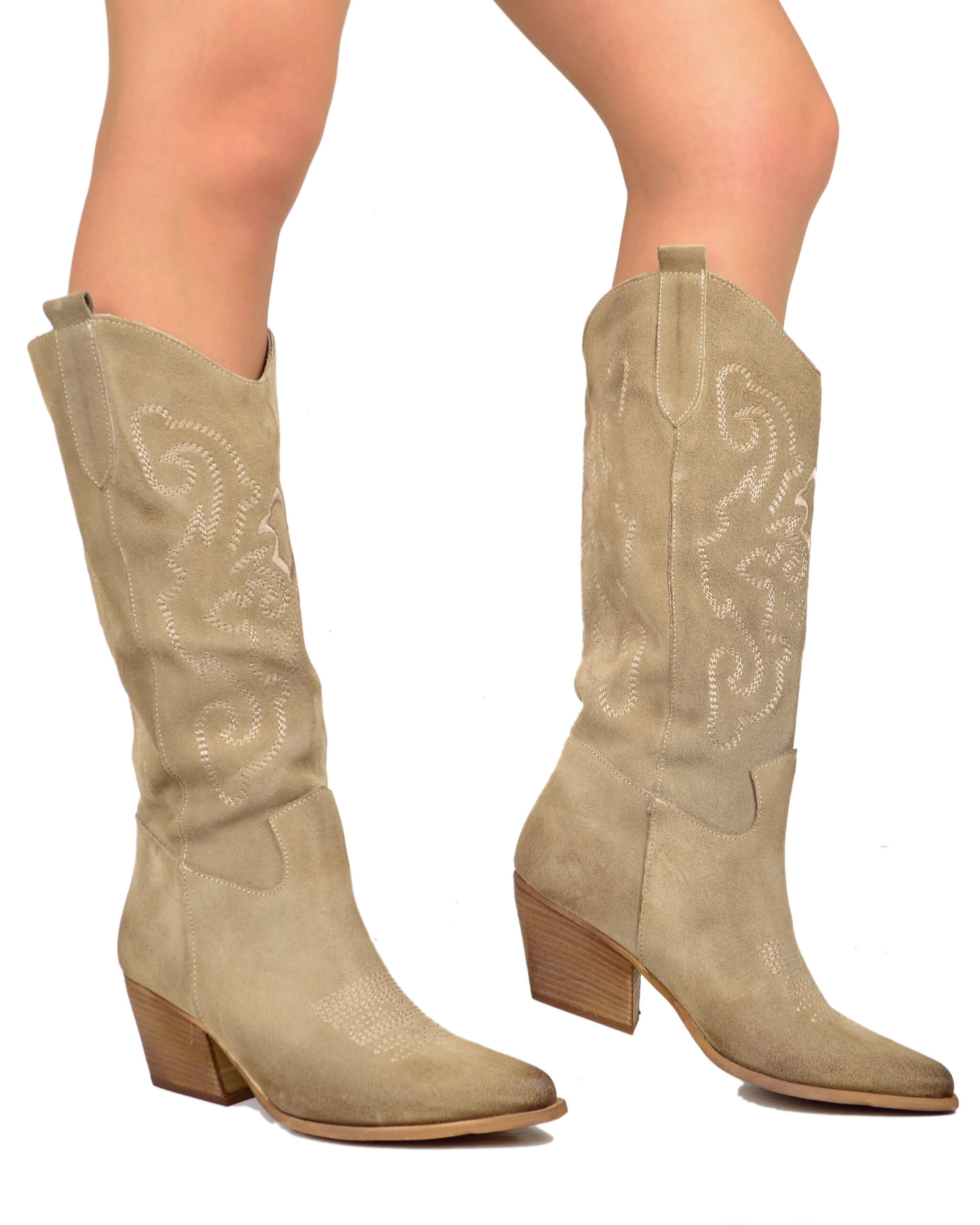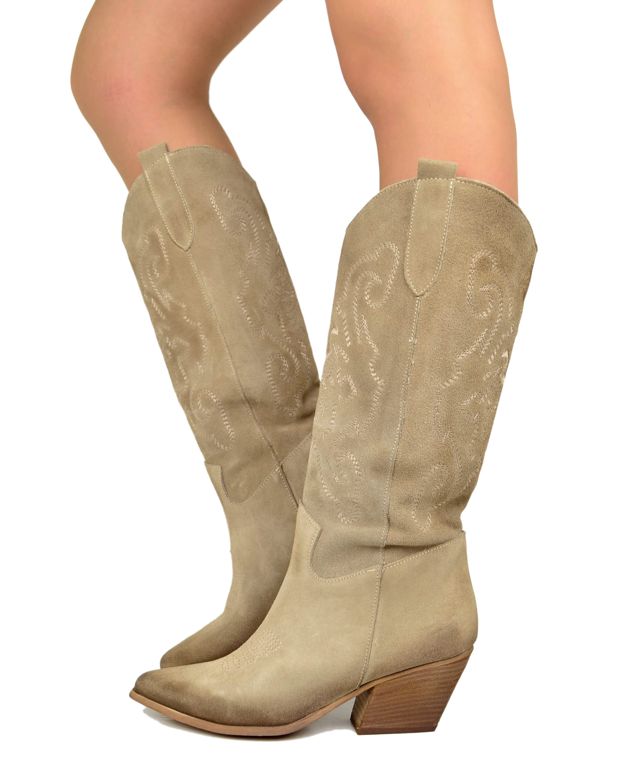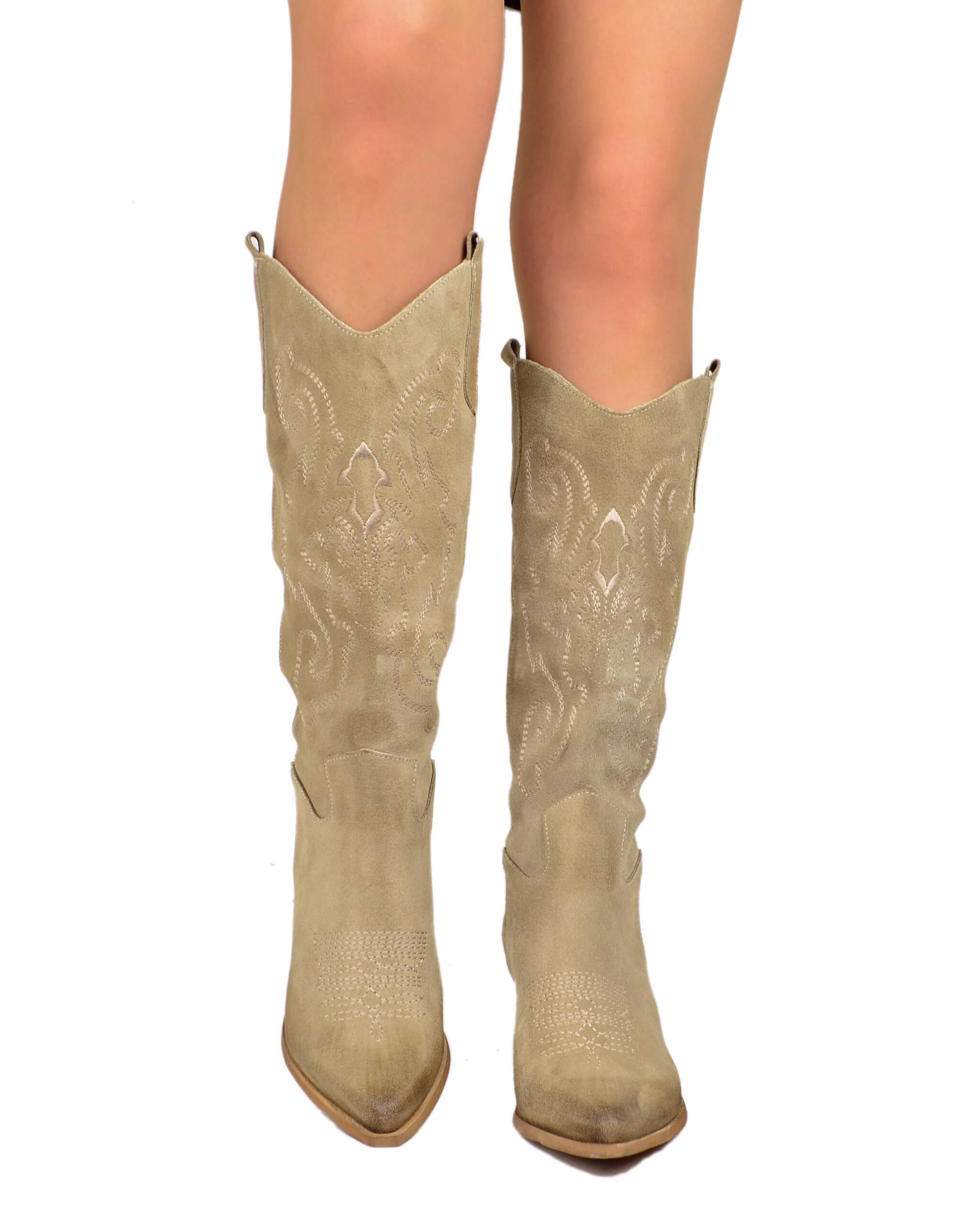 Lasciati ispirare da questo classico stile Texano! I nostri stivali Texani in pelle scamosciata con tacco medio sono comodi ed eleganti. La loro tomaia trapuntata unisce comfort e stile, rendendoli una scelta perfetta per qualsiasi occasione.