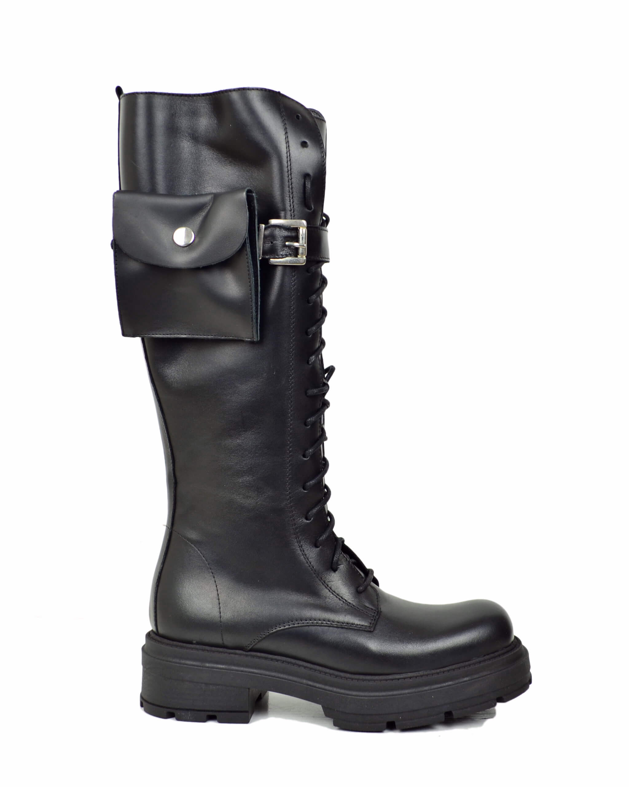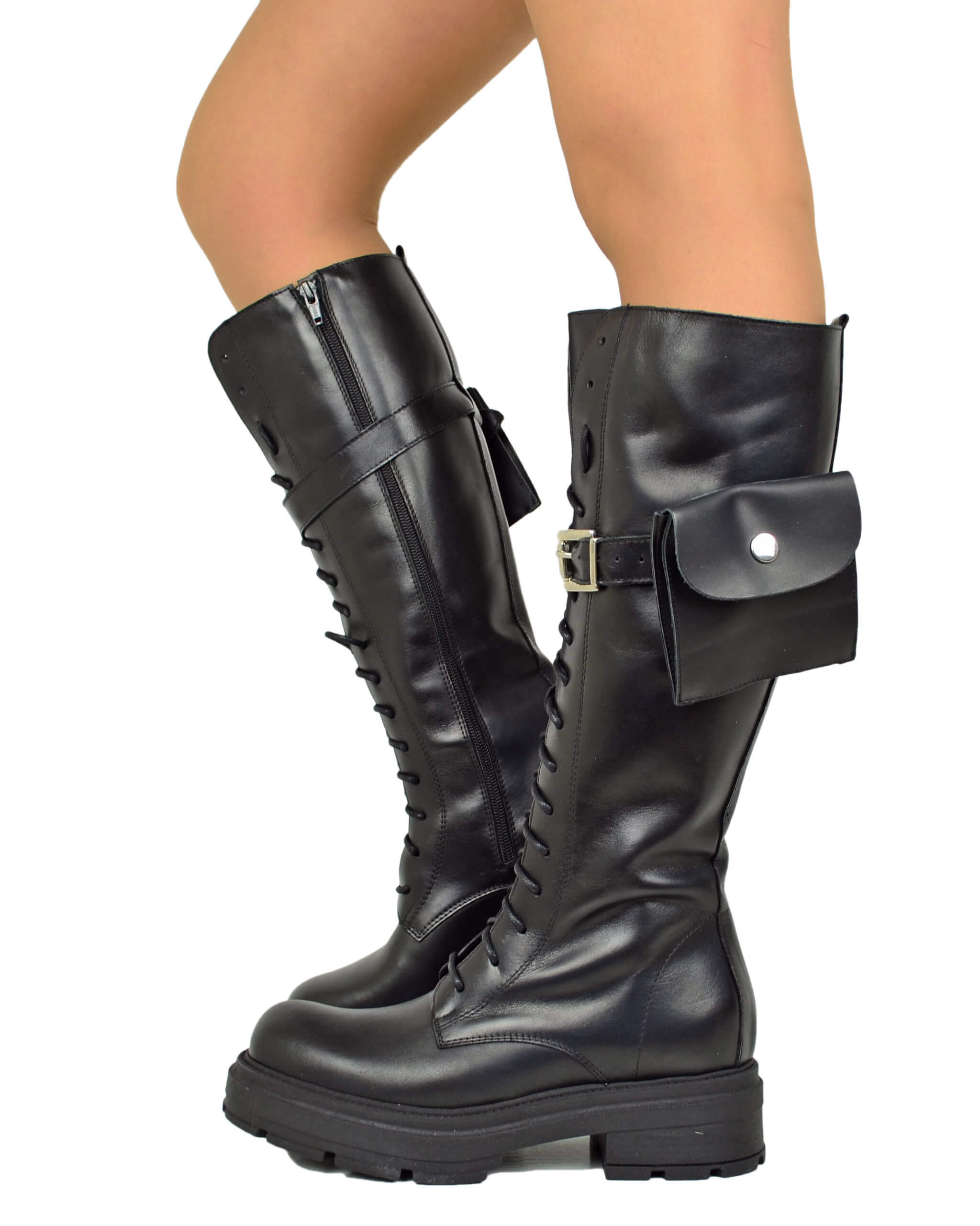 Bottes Biker Hautes Lacées en Cuir Véritable – Style Underground avec Pochette