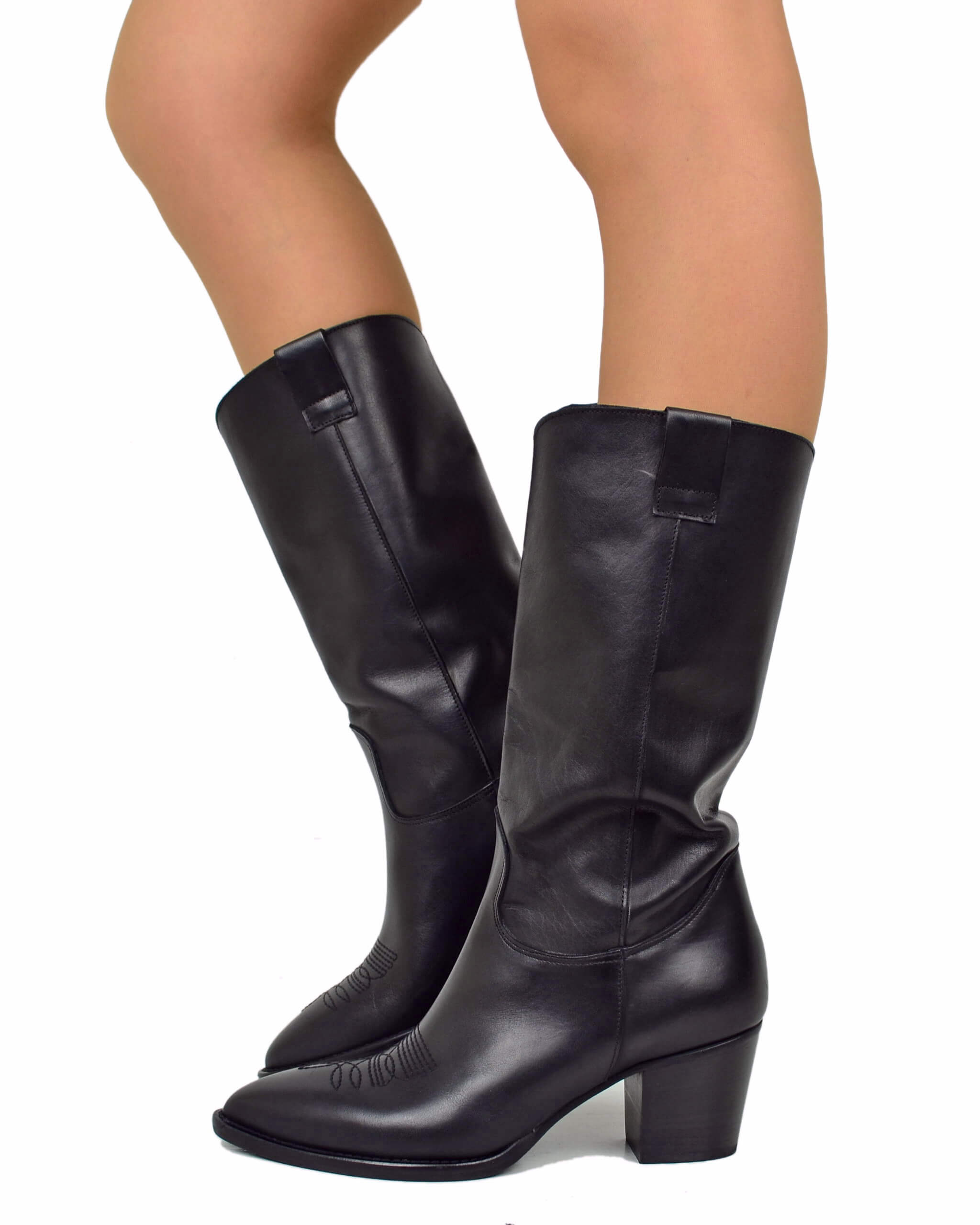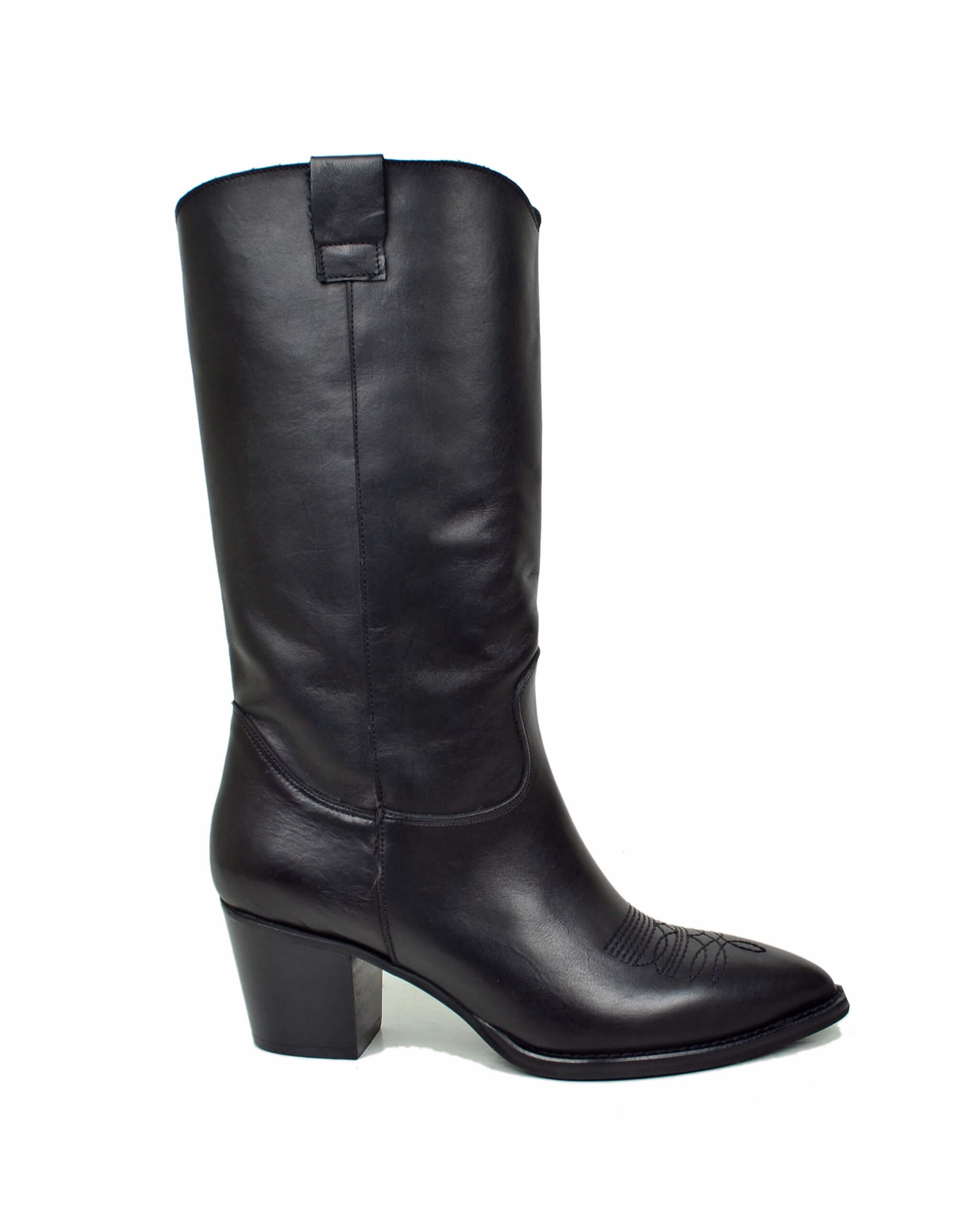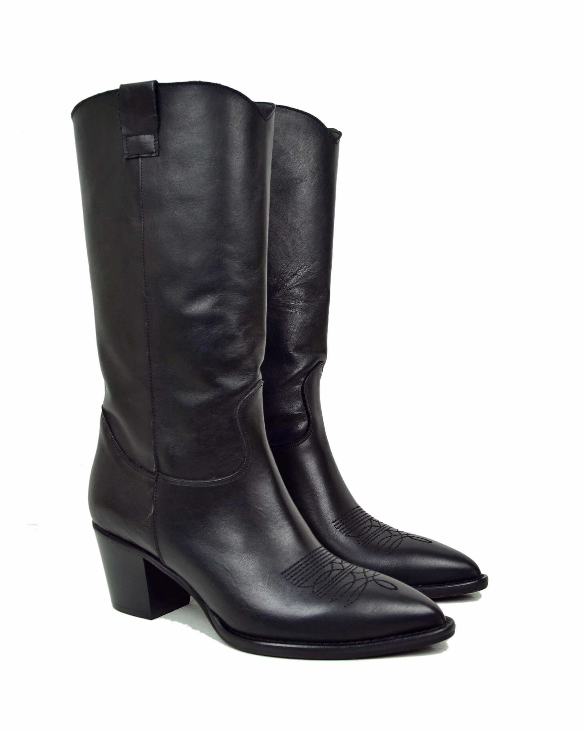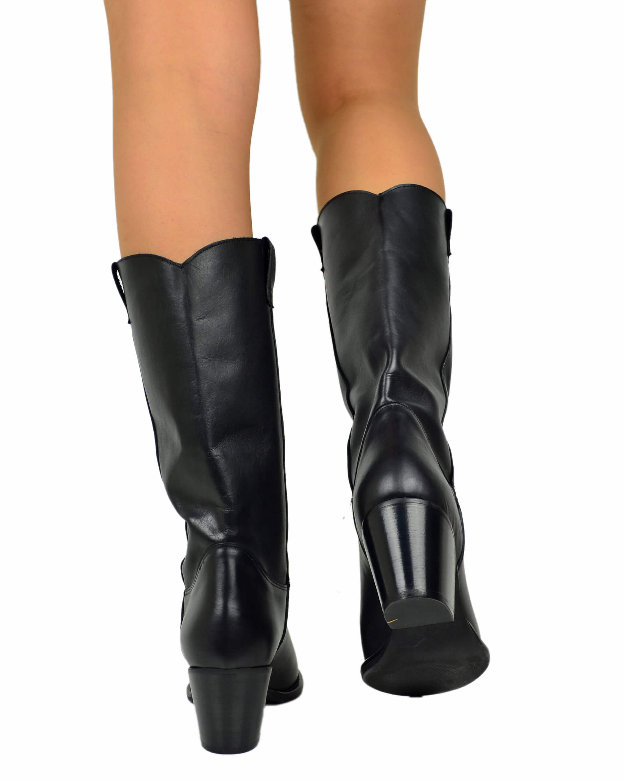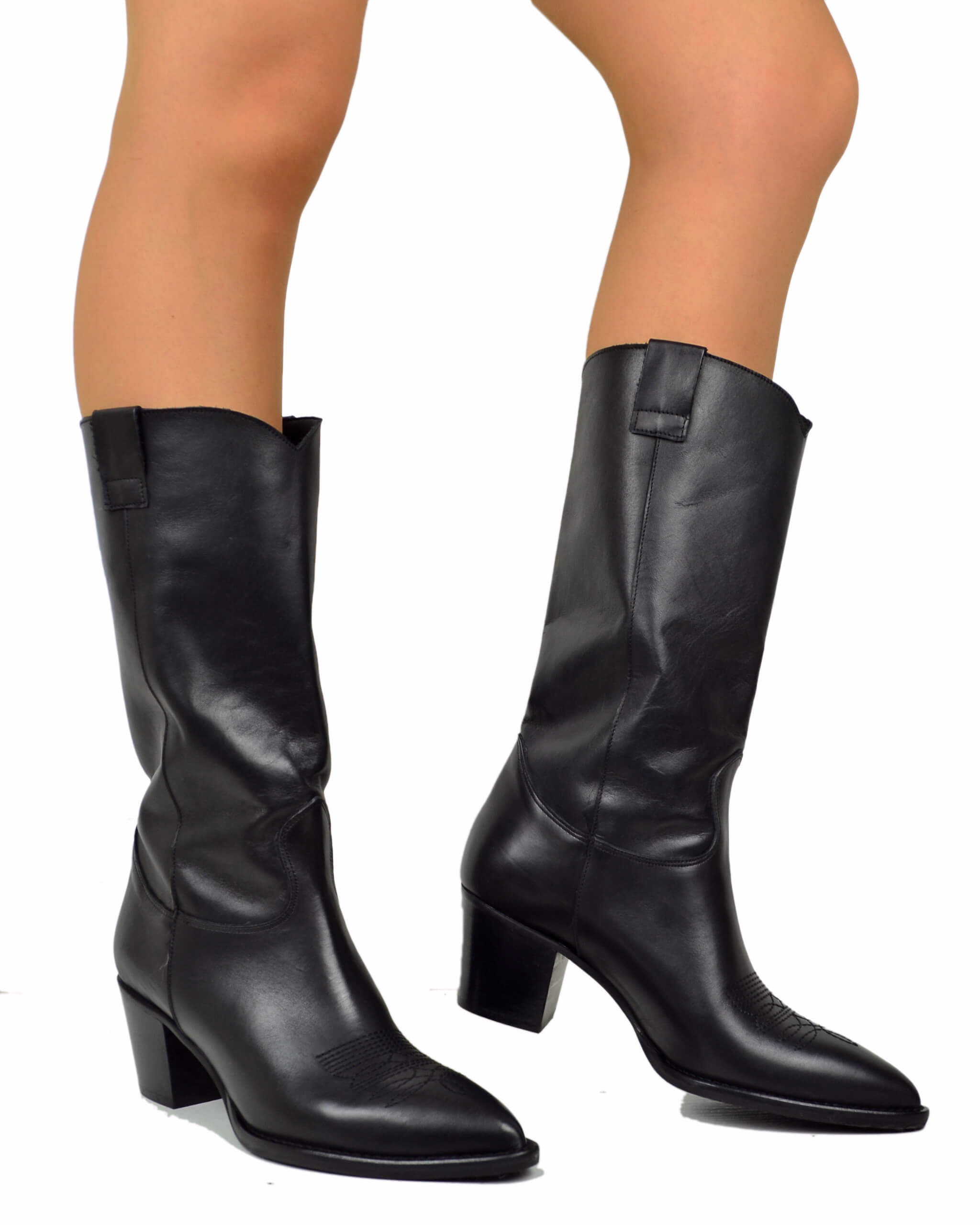 Bottes western total black style vintage sixties en cuir noir, talon 7 cm