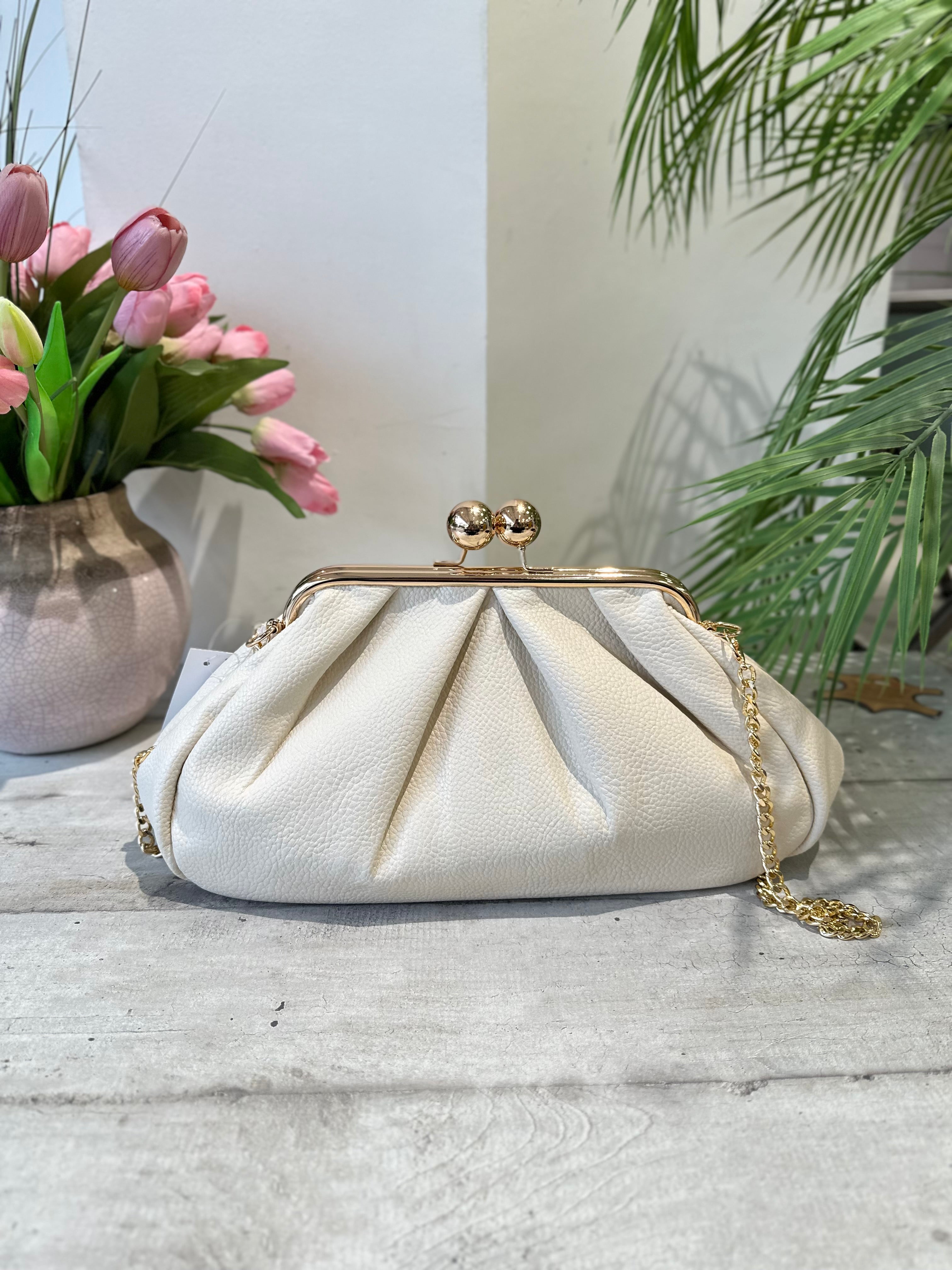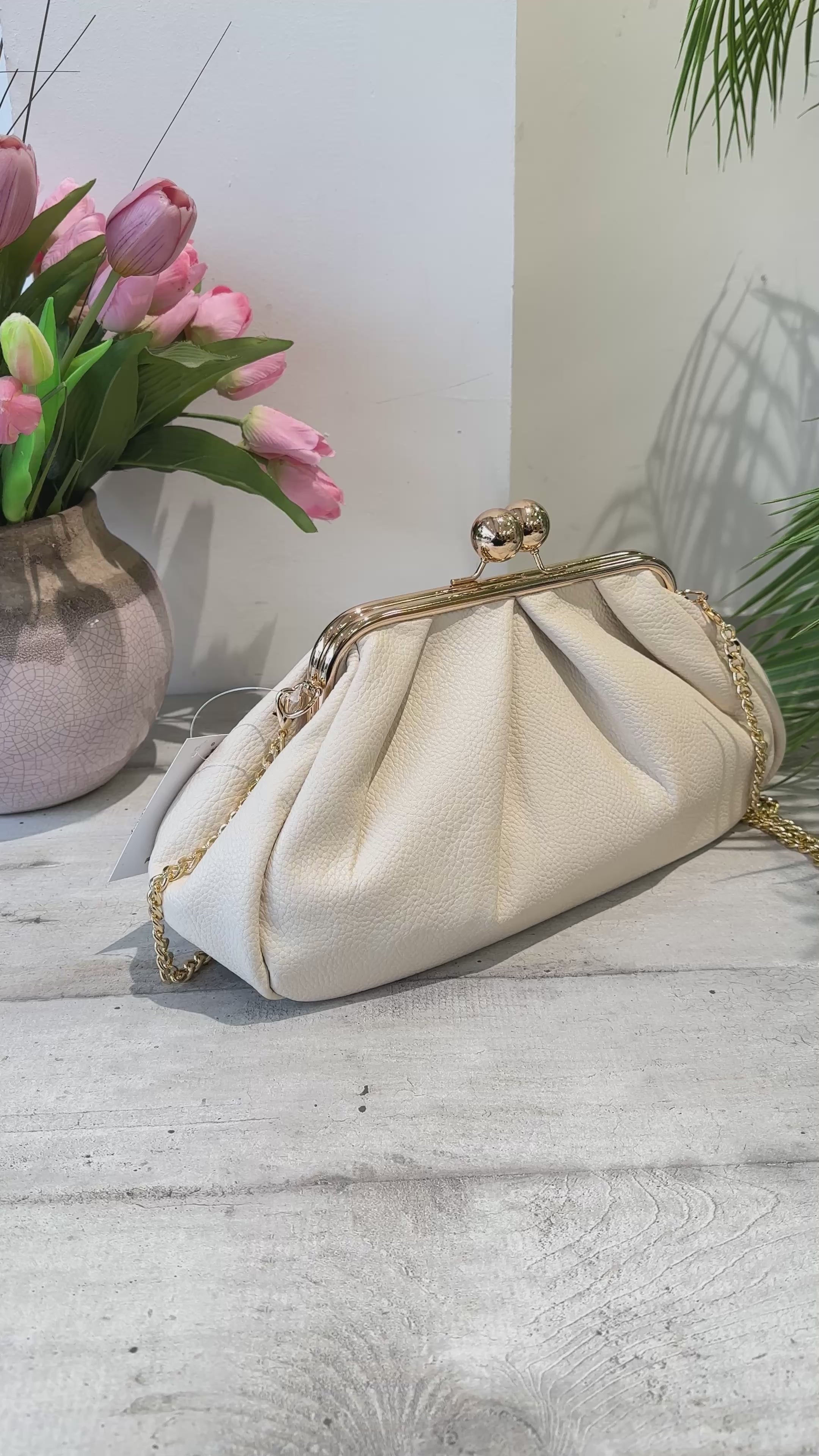 Sac à bonbons en similicuir beige clair avec bandoulière ou chaîne.
