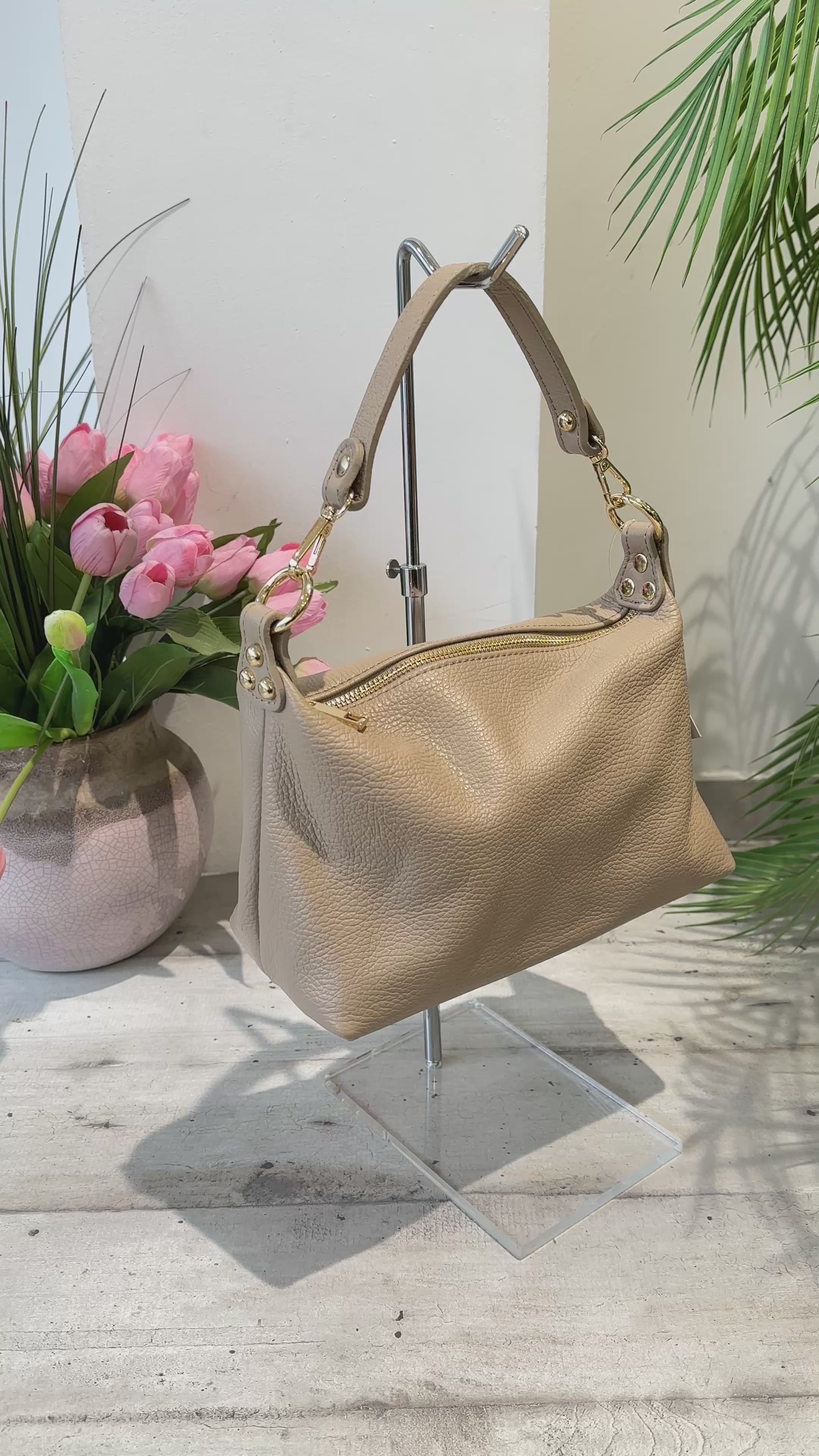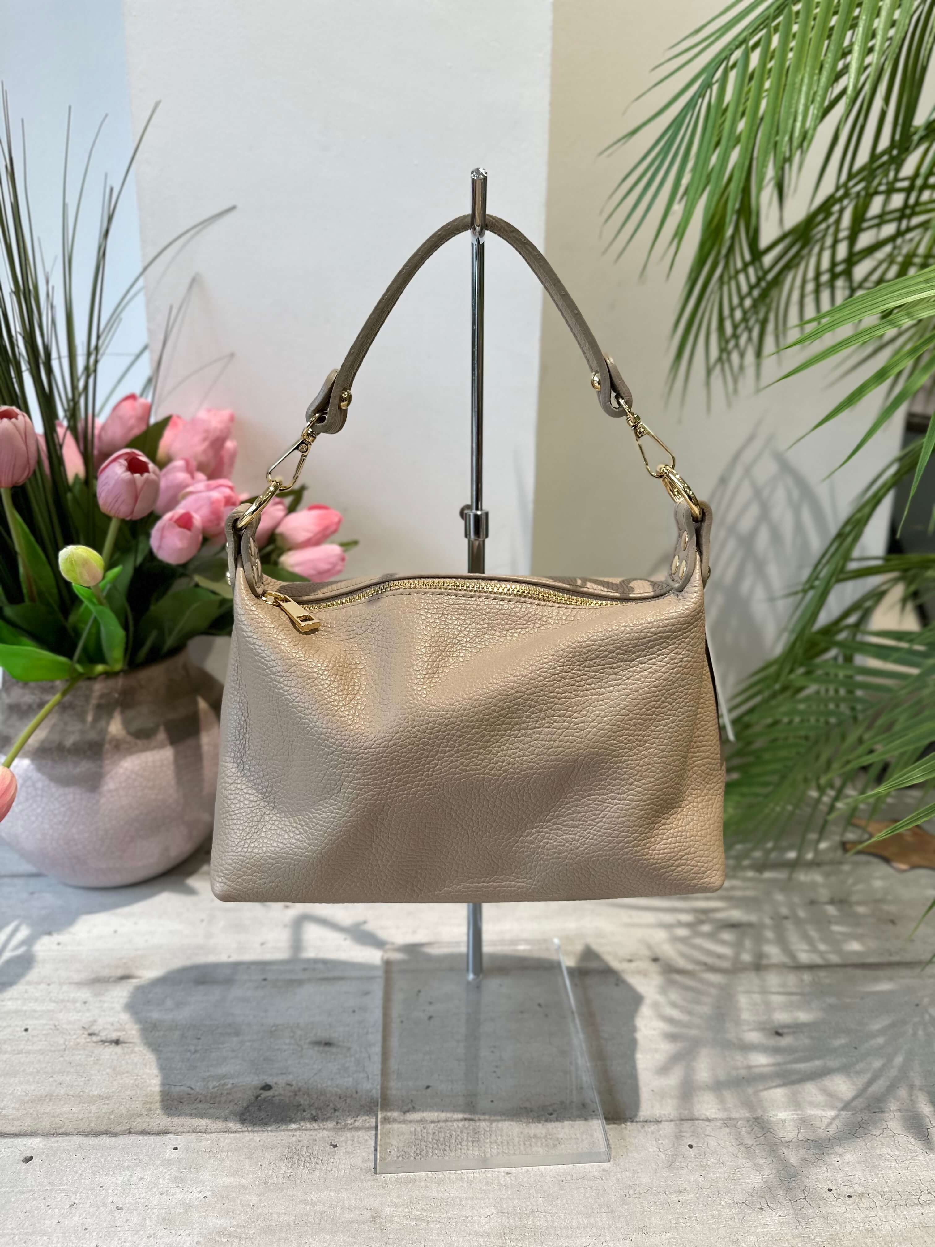 Sac souple en cuir véritable coloris fango, porté épaule, avec longue bandoulière – forme bowling Poppy