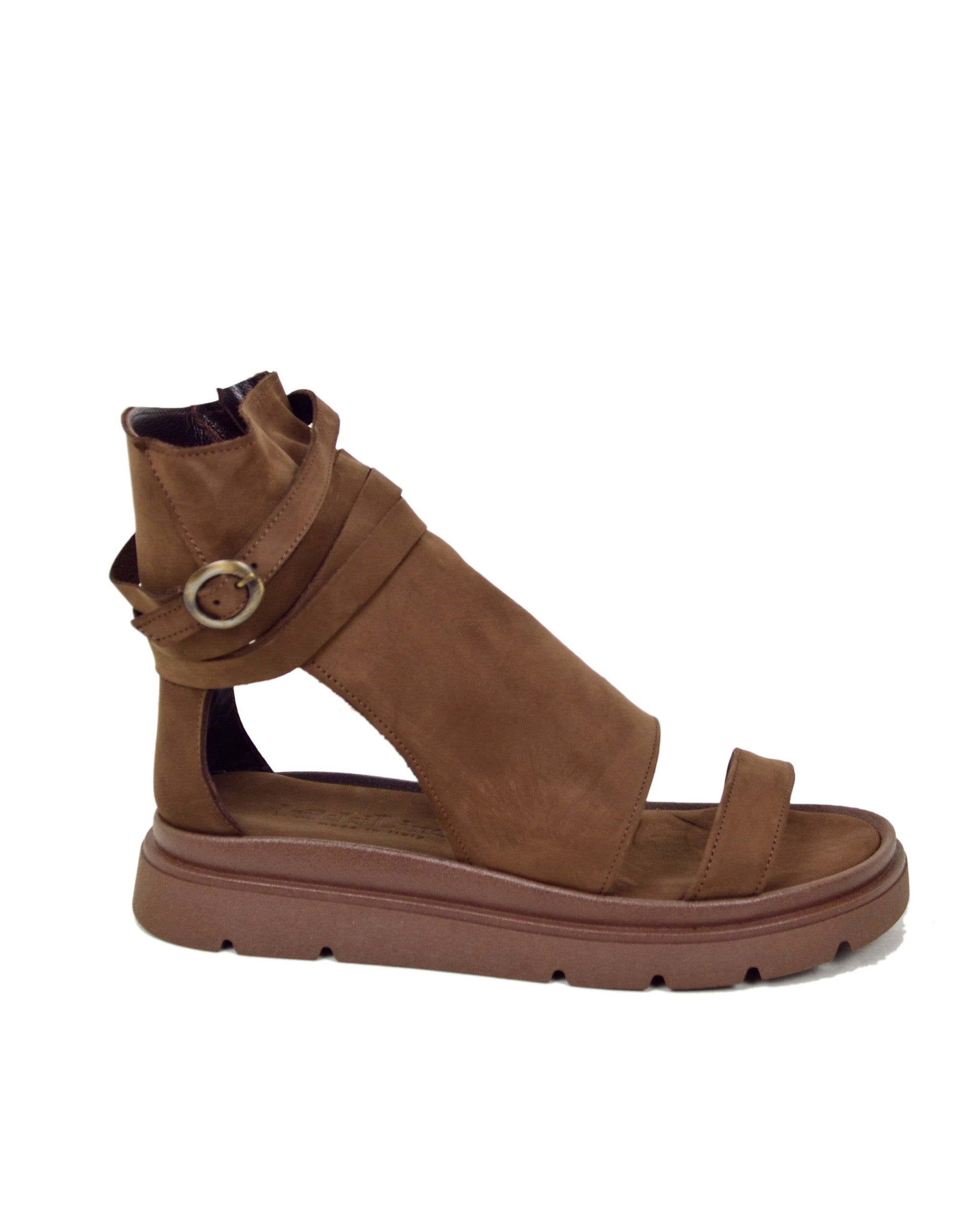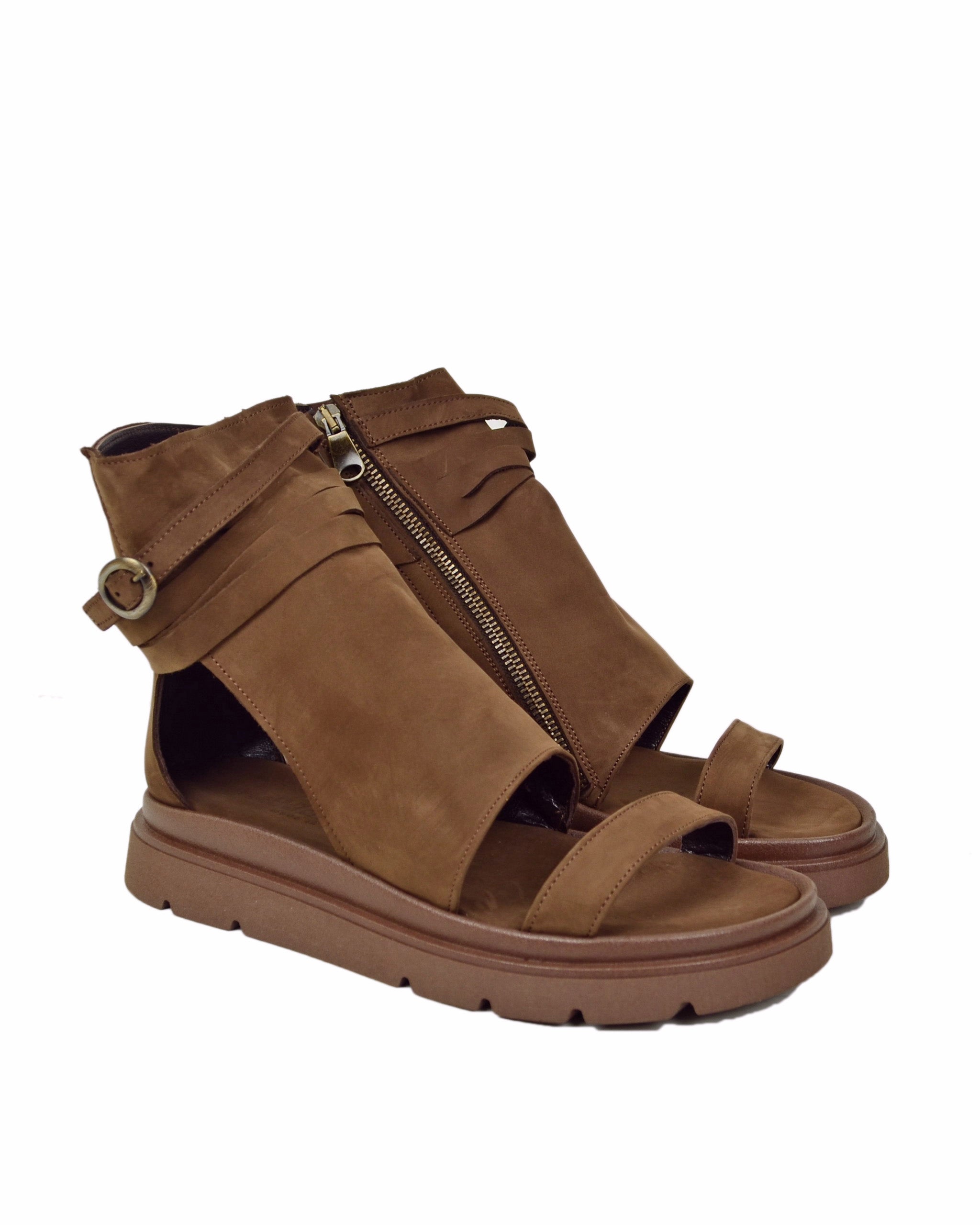 Sandales platform style bottine en nubuck cacao, bout ouvert, zip latéral