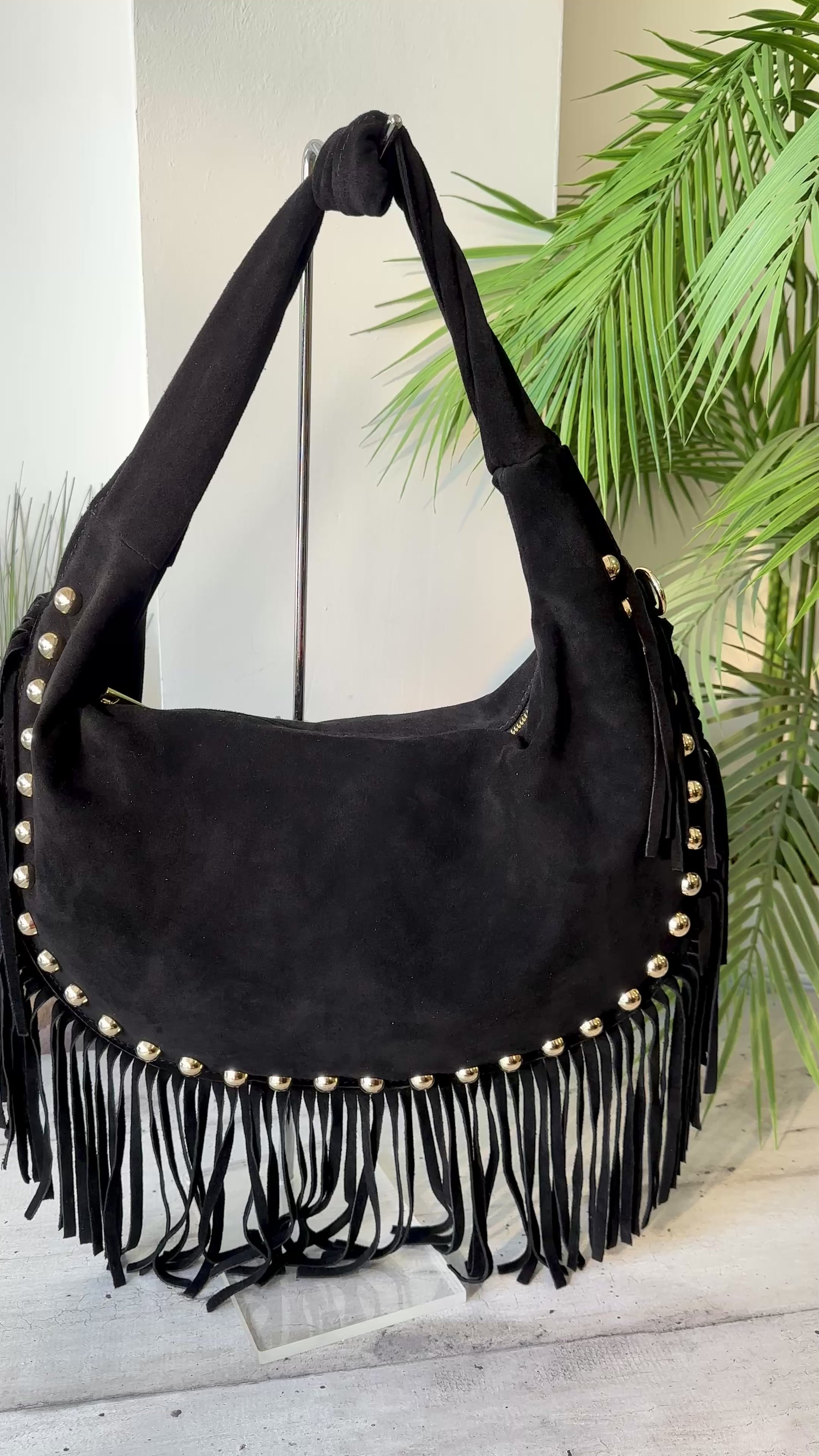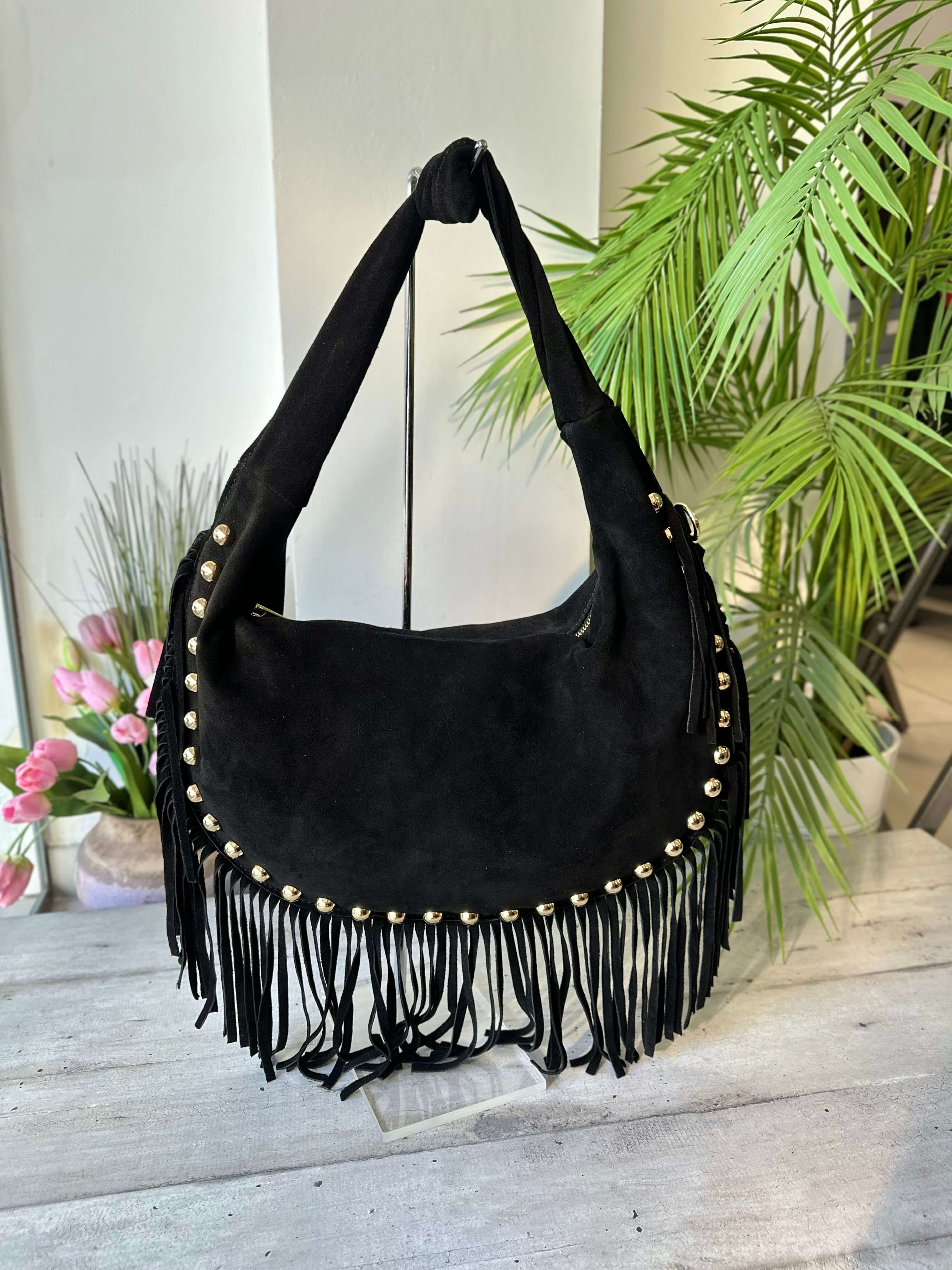 Borsa a Spalla con Borchie Dorate Frange Pelle Scamosciata Nera MARLA