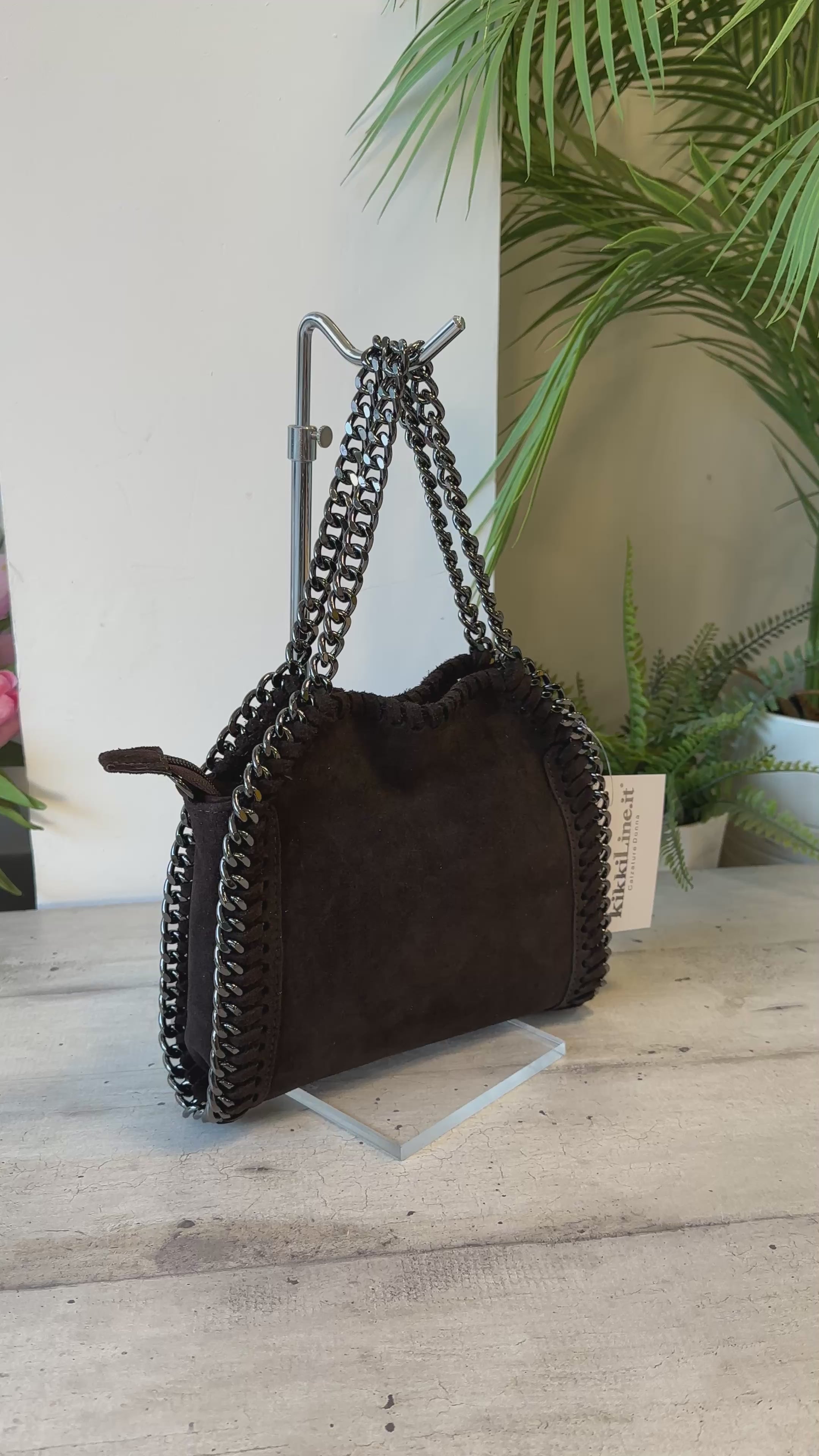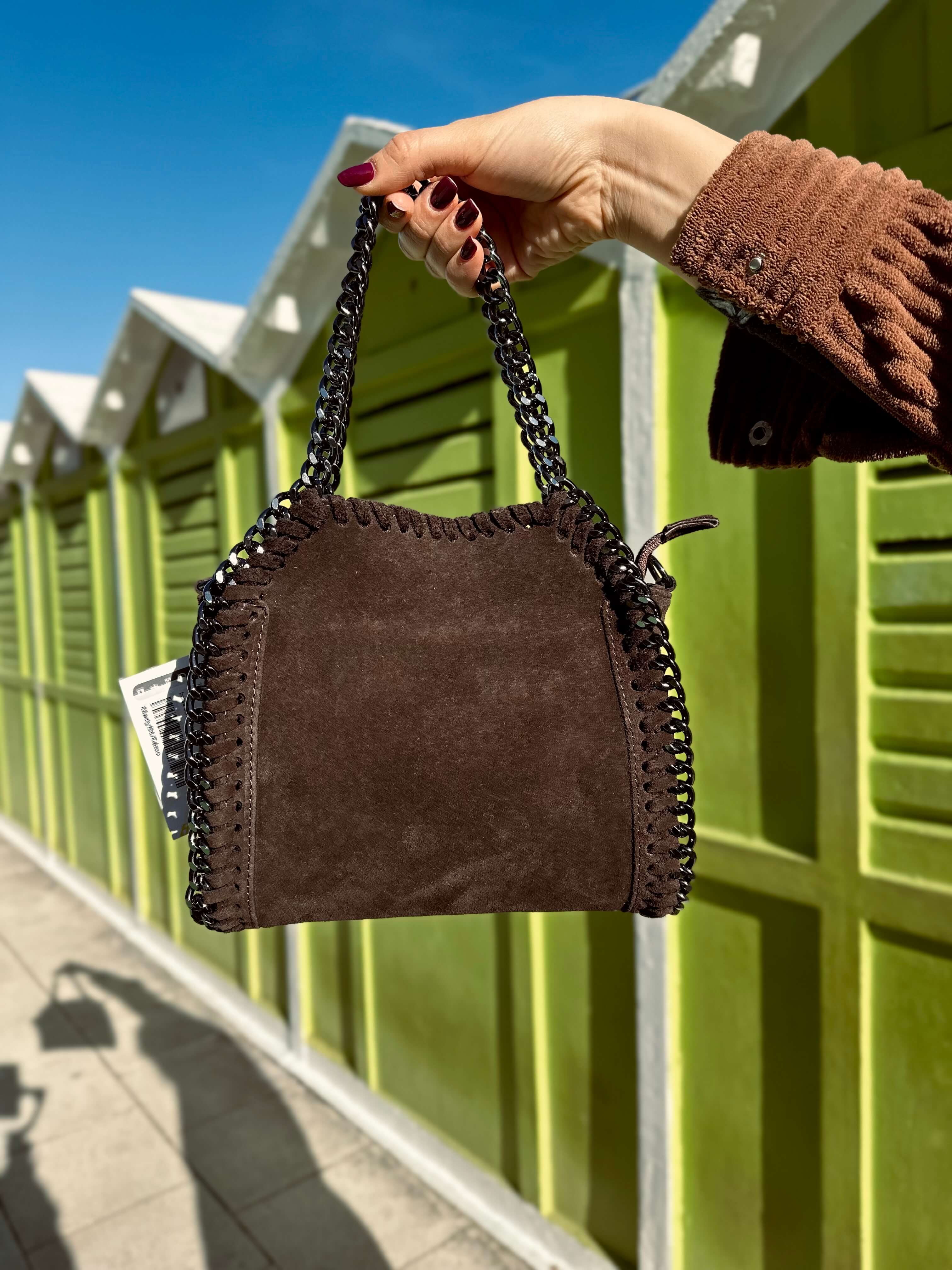 Borsa con Catena Dorata in Pelle Scamosciata Marrone Scuro Marty