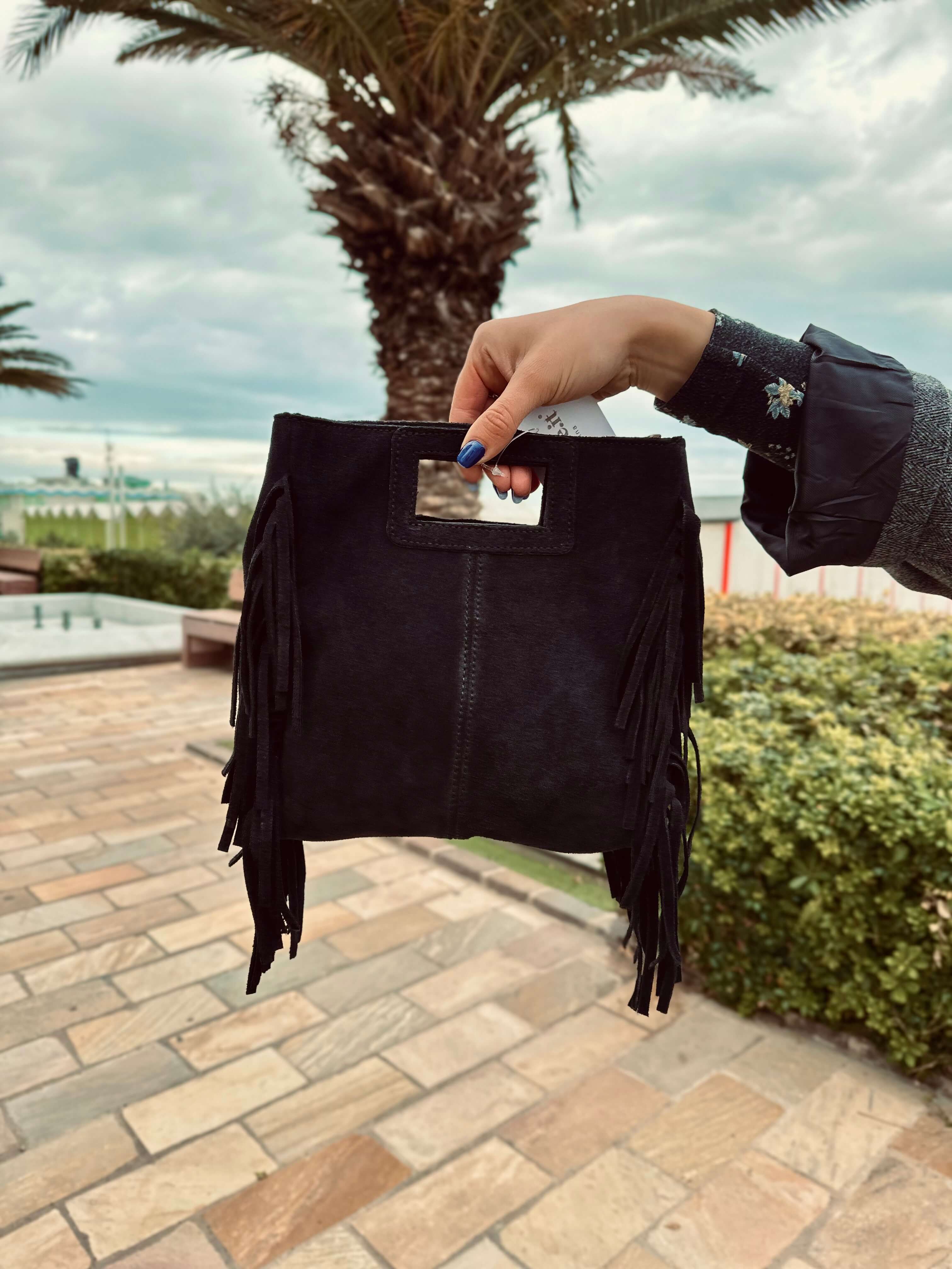 Borsettina a Mano Quadrata Vera Pelle Scamosciata Nera con traccola interna perfetta combo con Texani