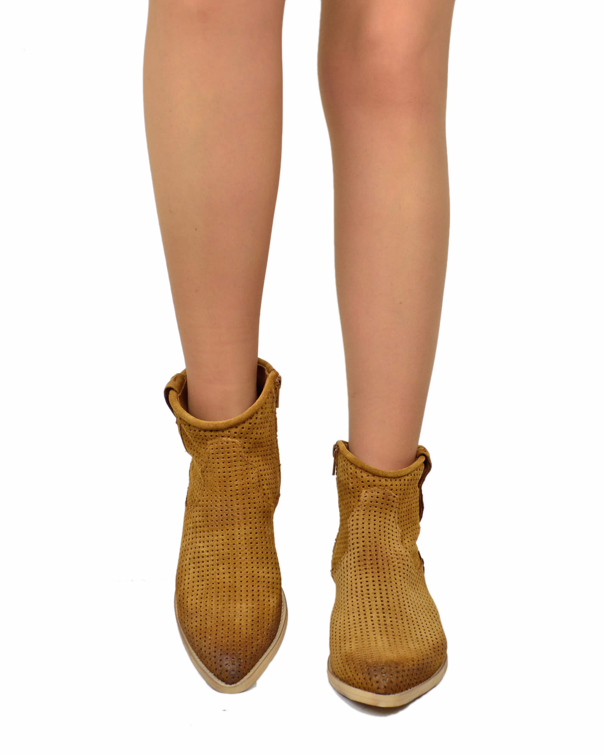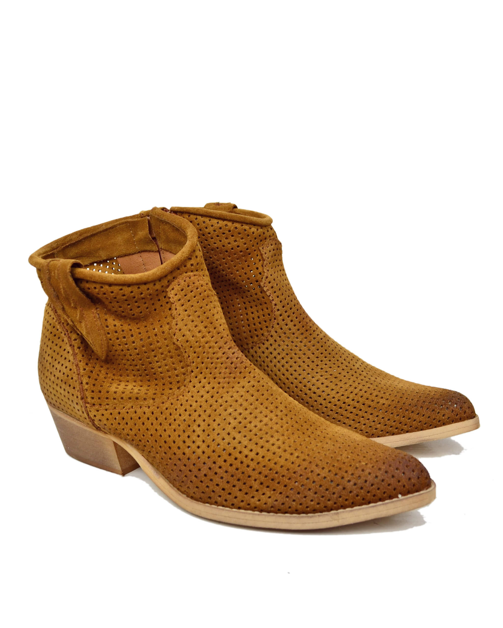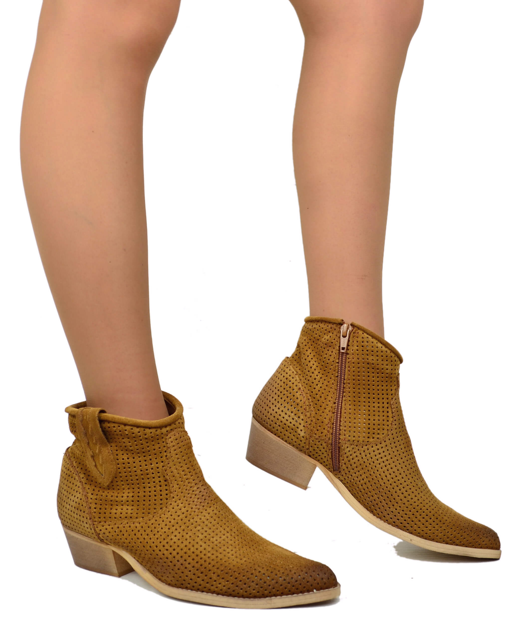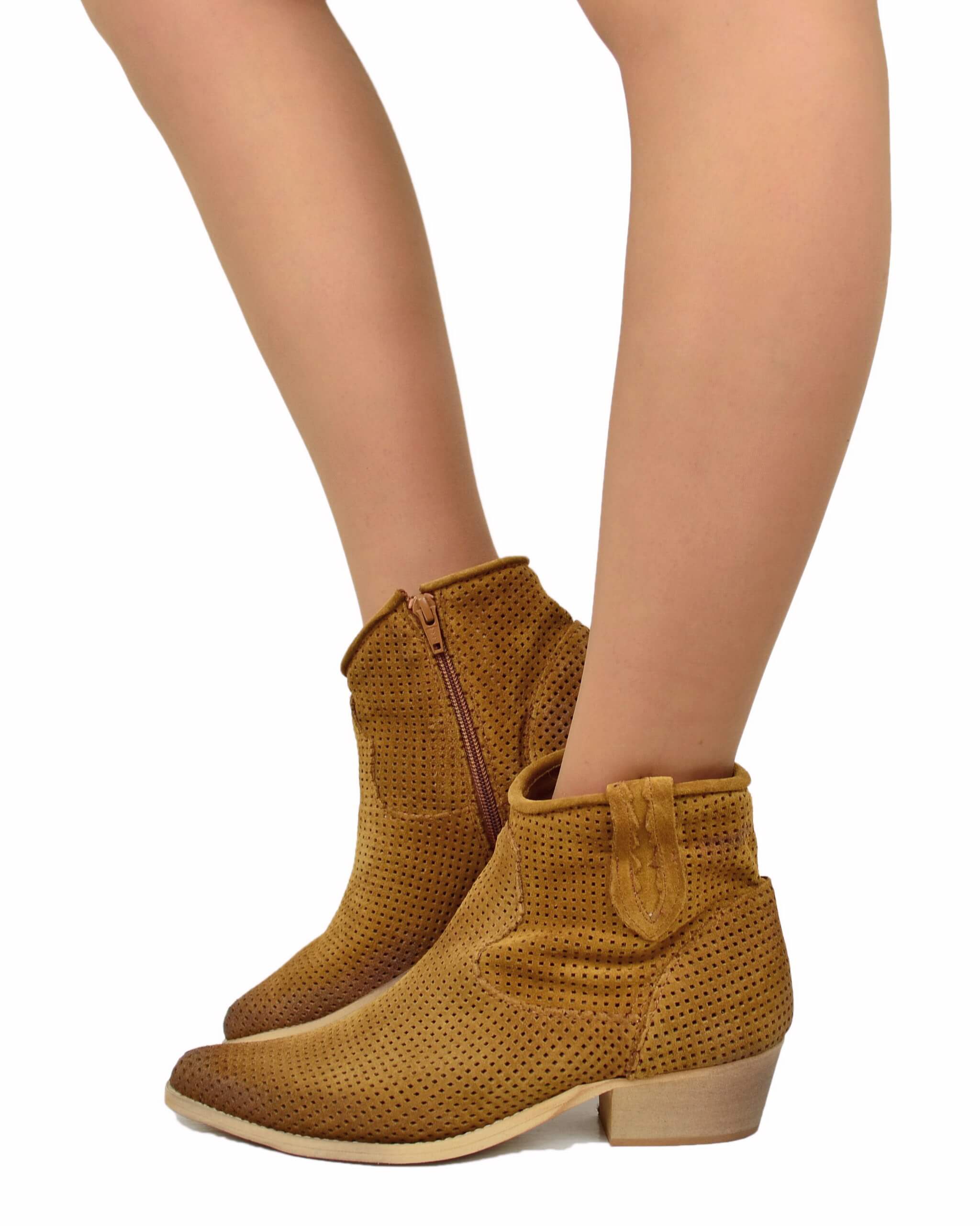 Stivaletti Estivi Traforati Texanini alla Caviglia in Pelle Scamosciata Cuoio Scuro