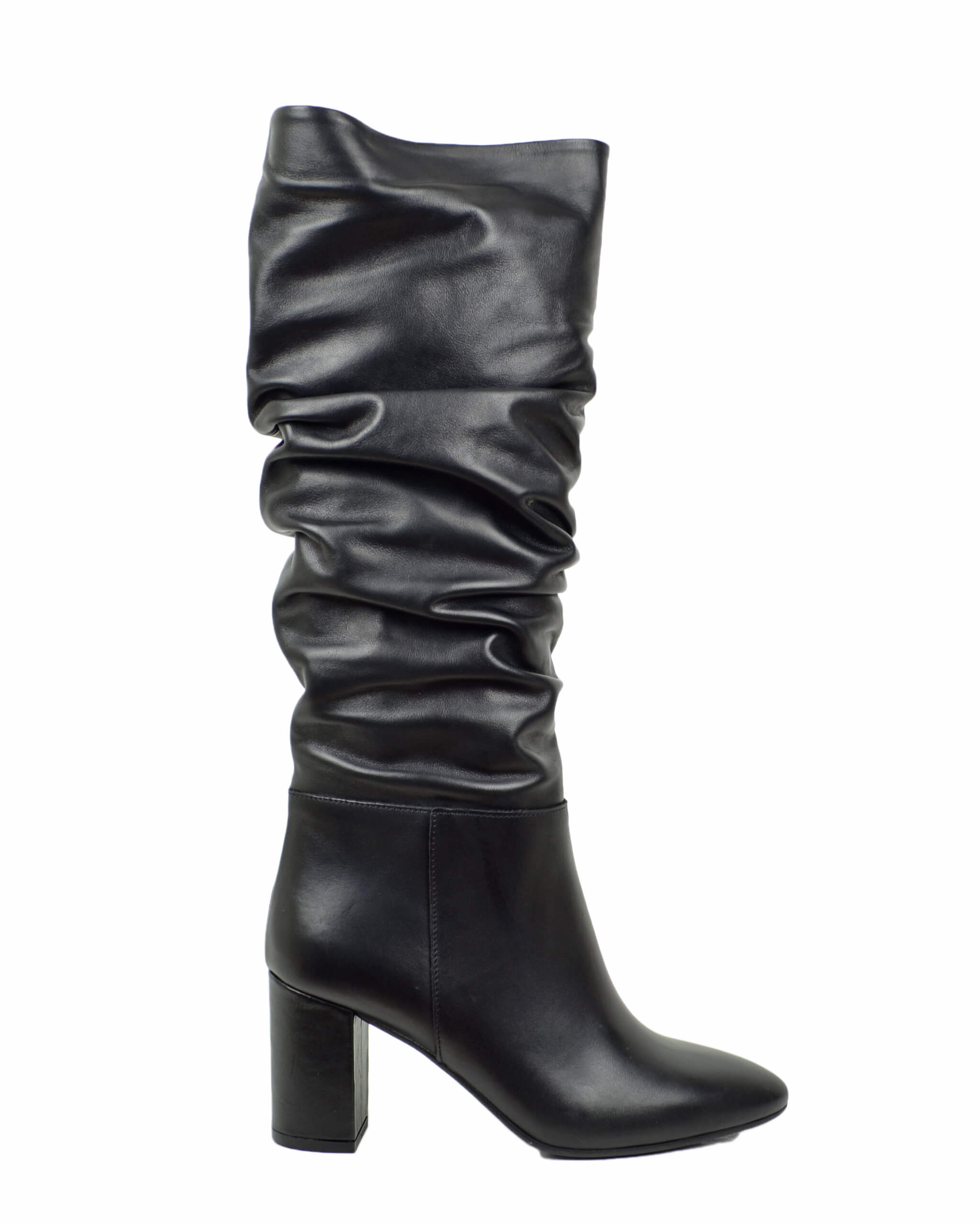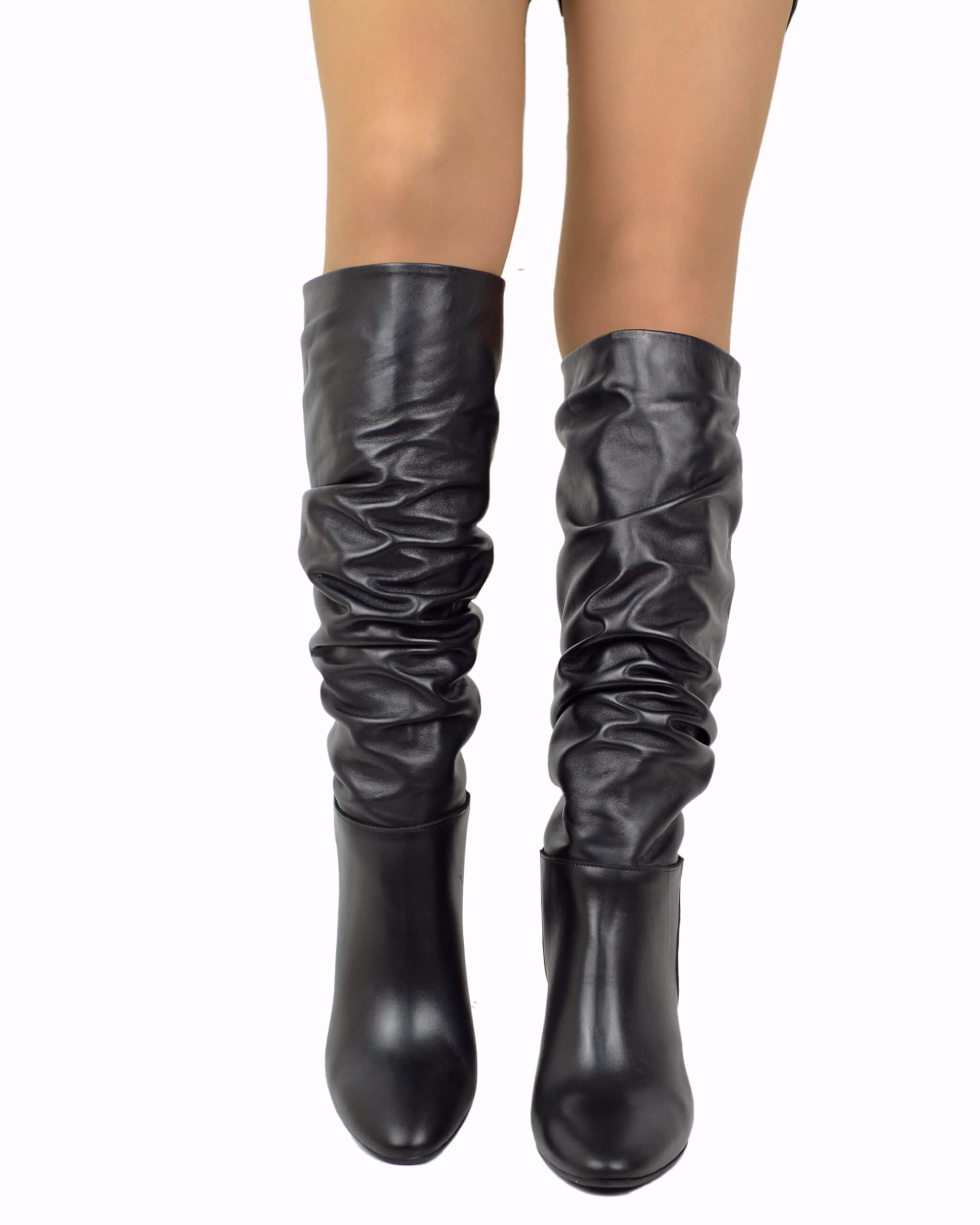 Stivali Alti in Pelle Plissettata con Tacco Alto 7 Centimetri Eleganti Pelle Nera