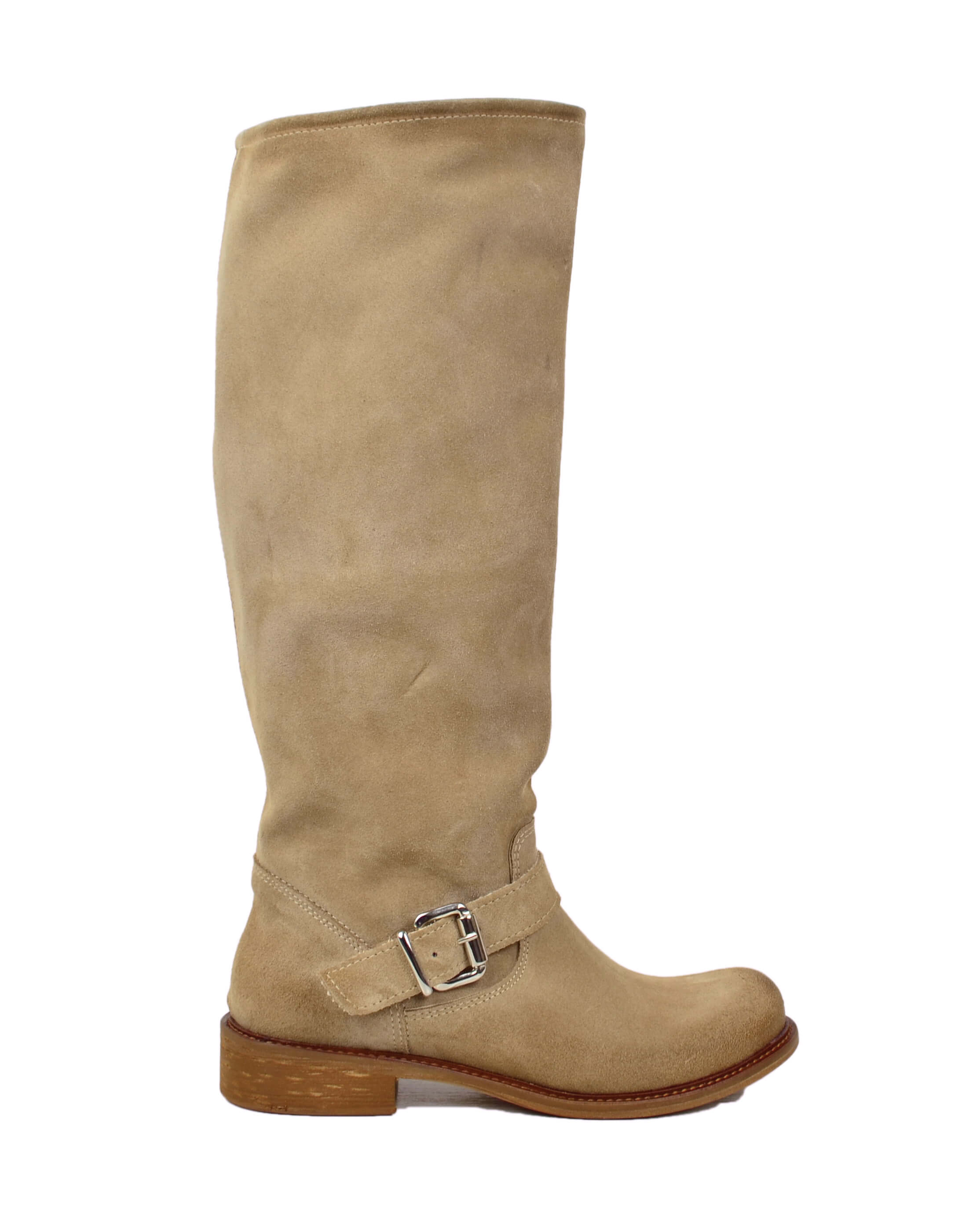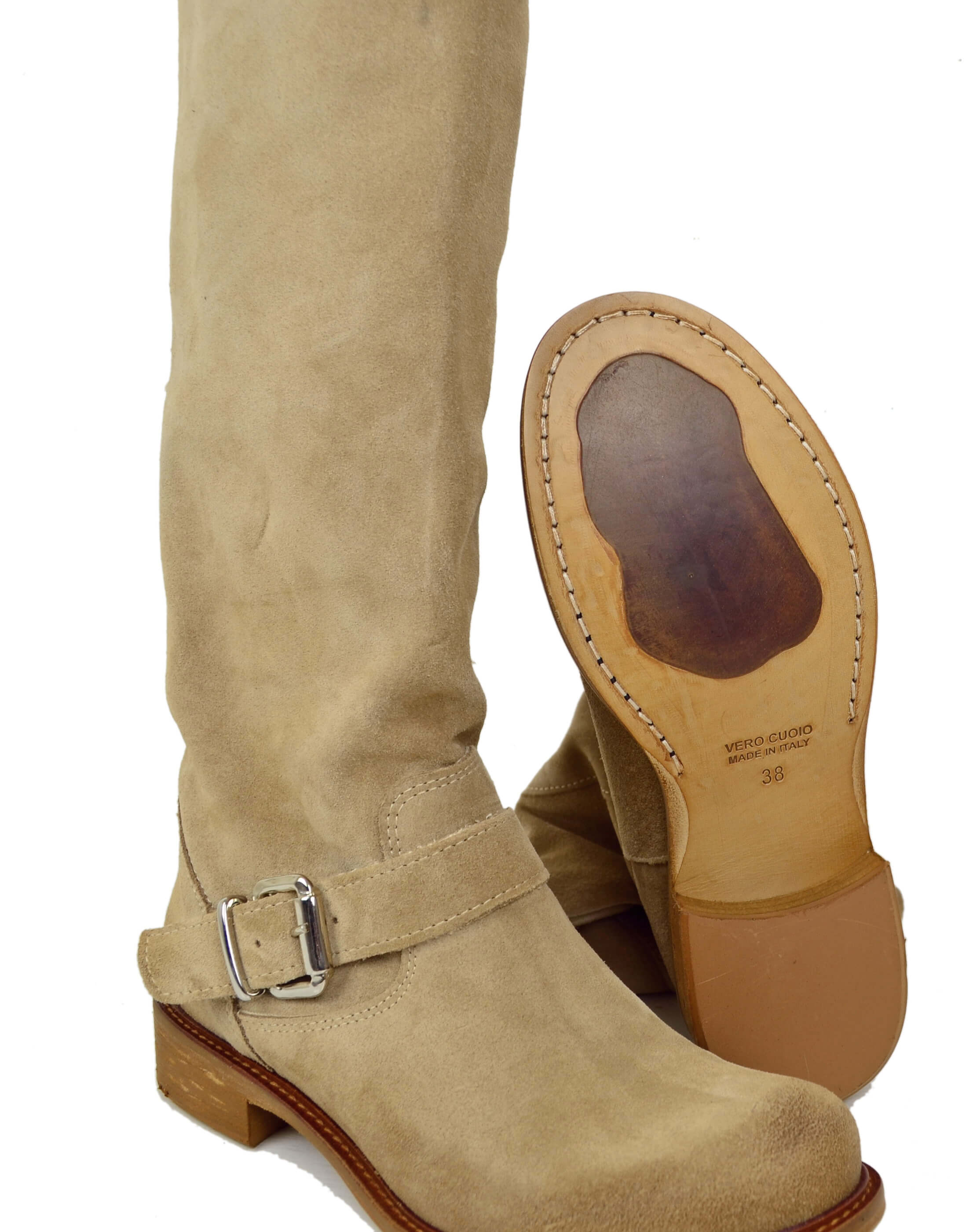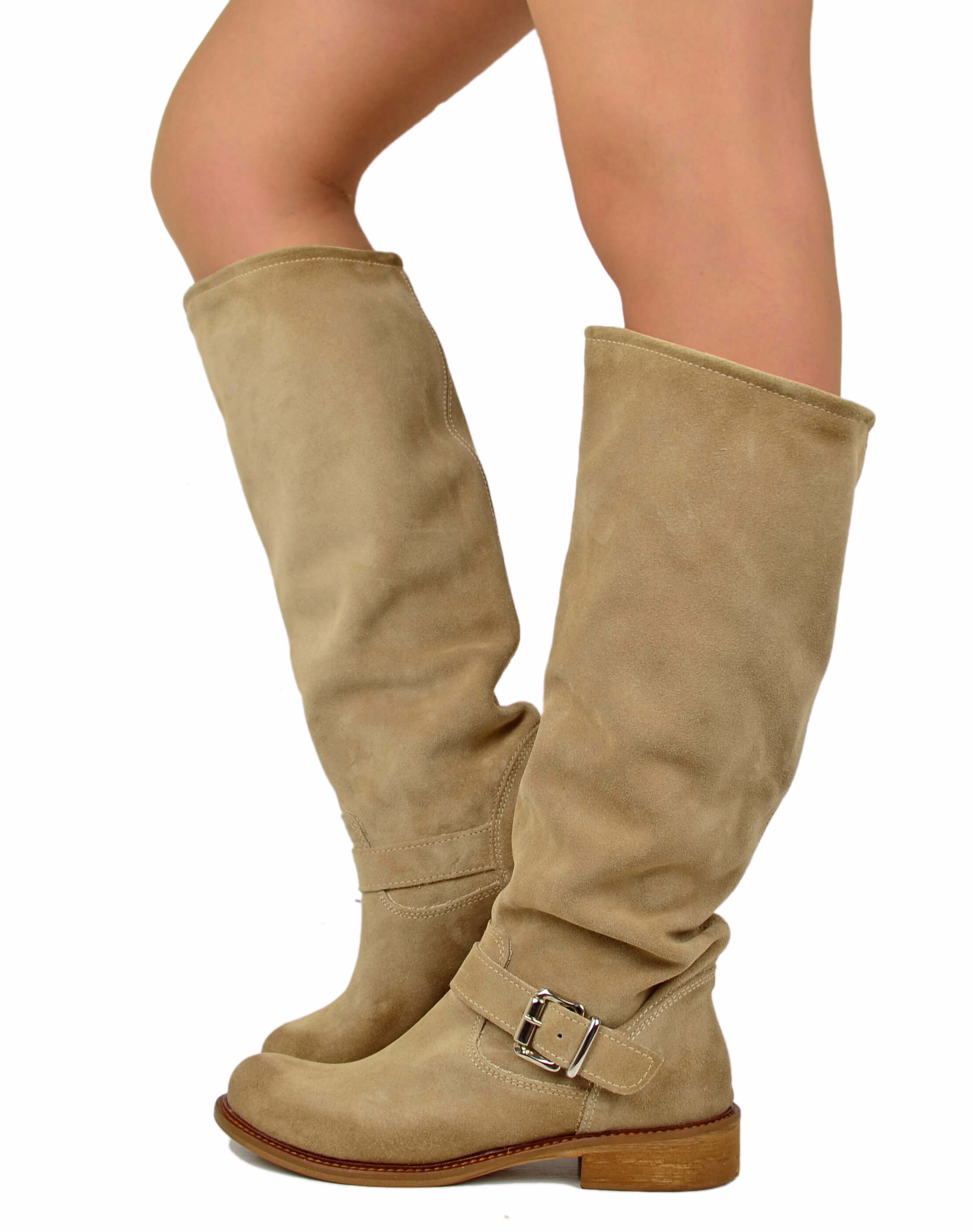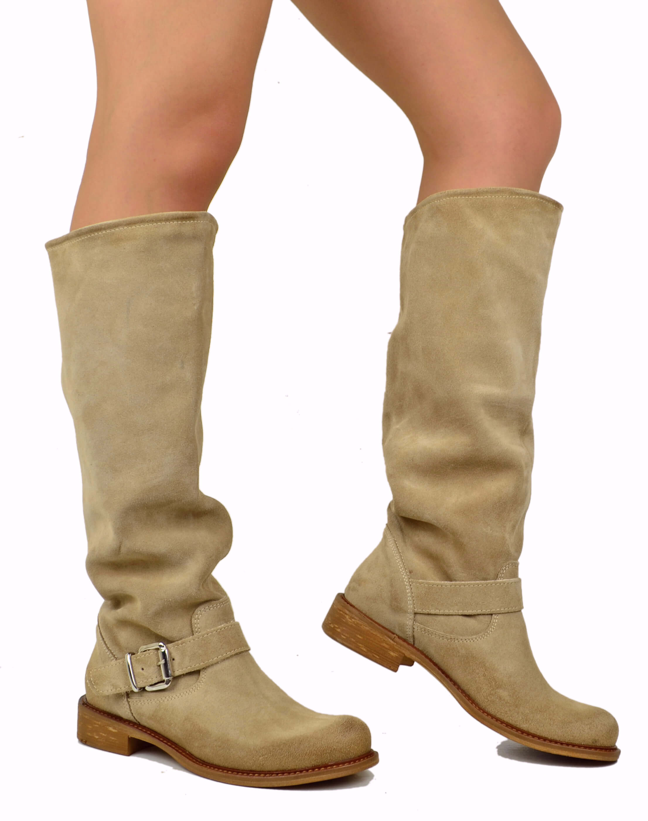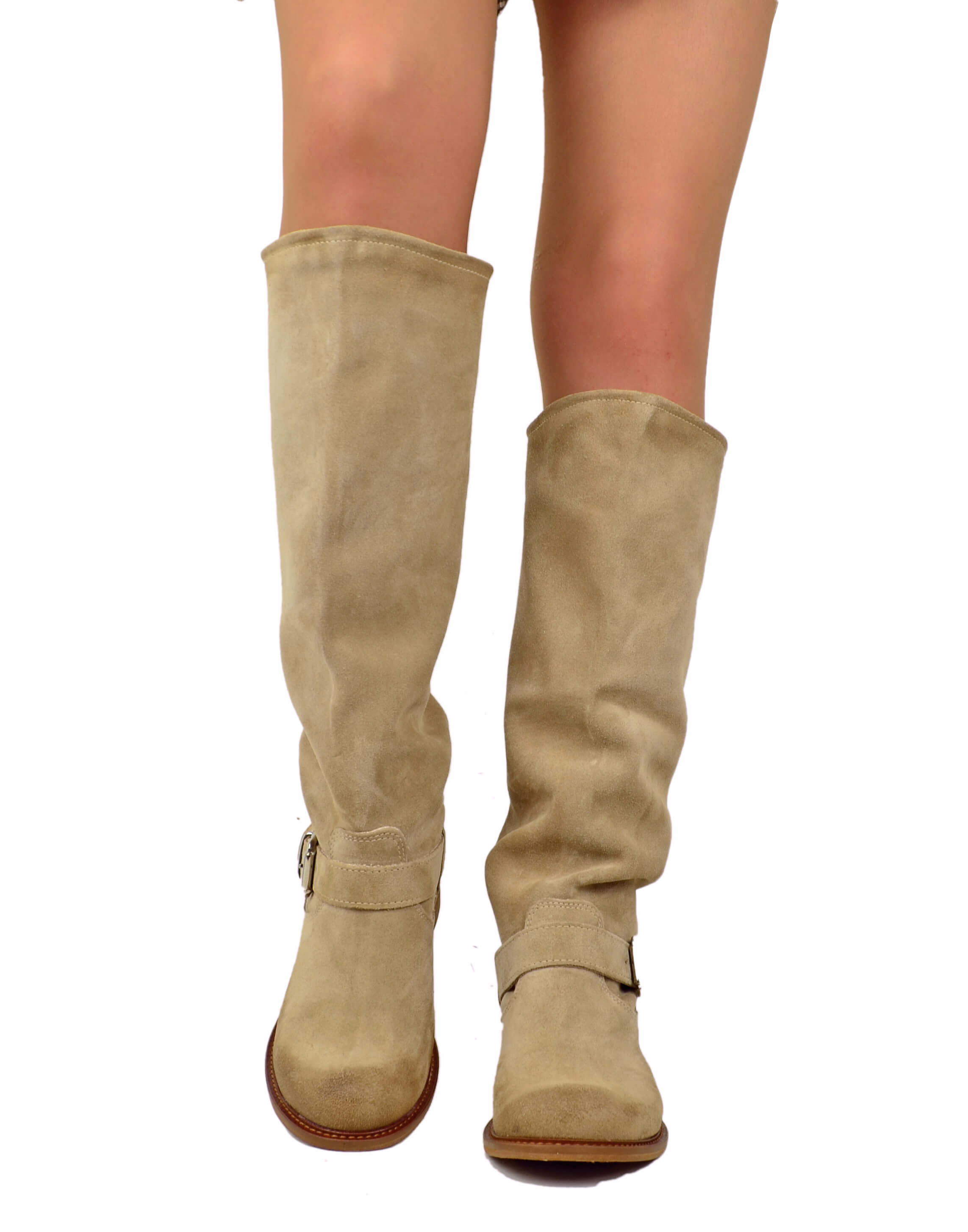 Stivali Biker Estivi Sfoderati Gambale a Fisarmonica Pelle Scamosciata Beige