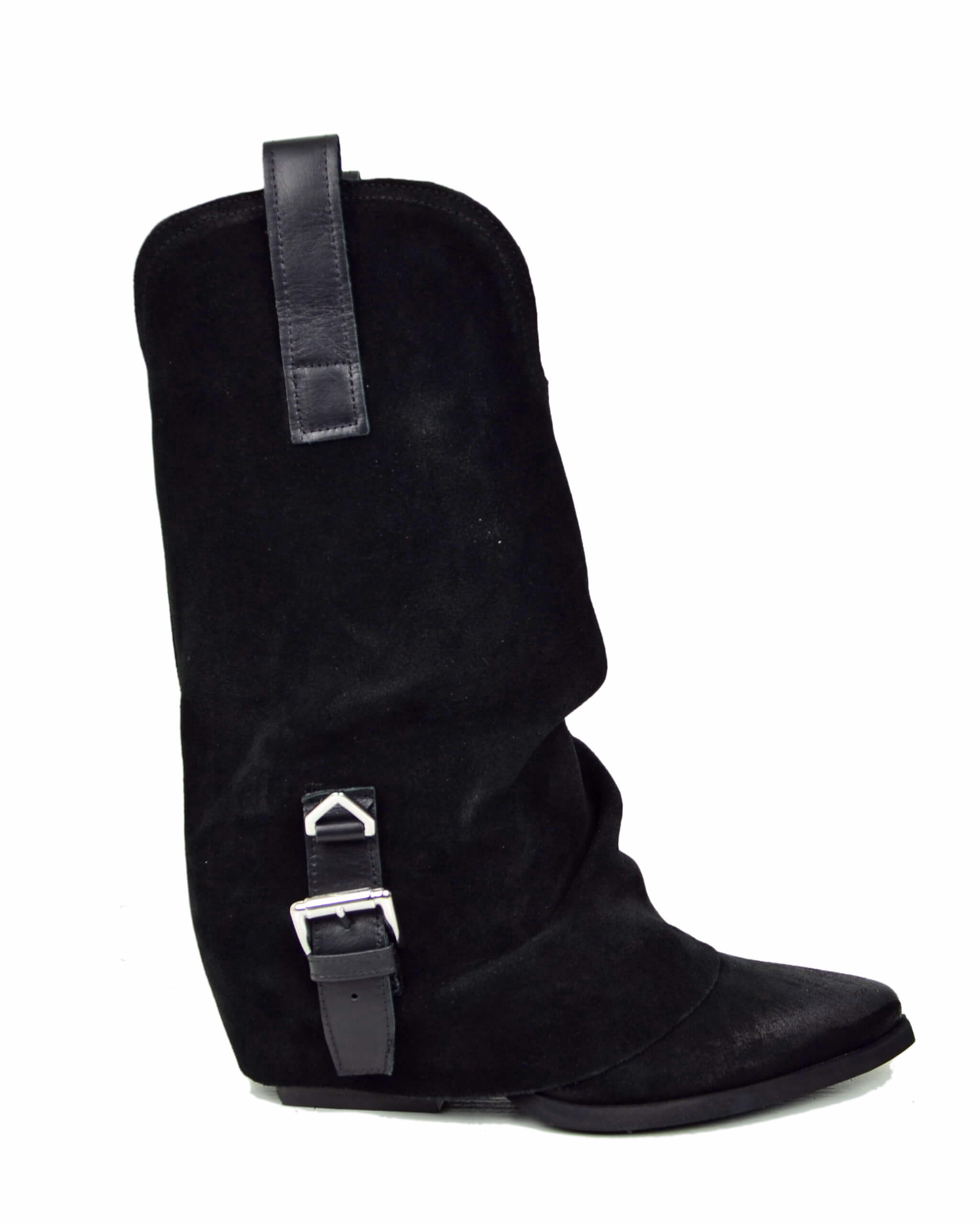 Stivali Texani da donna in morbida pelle scamosciata Neri, impreziosito da ghetta e fibbia laterale. Realizzato artigianalmente in Italia, unisce carattere e stile in un modello versatile e grintoso, perfetto per ogni look casual o boho.
