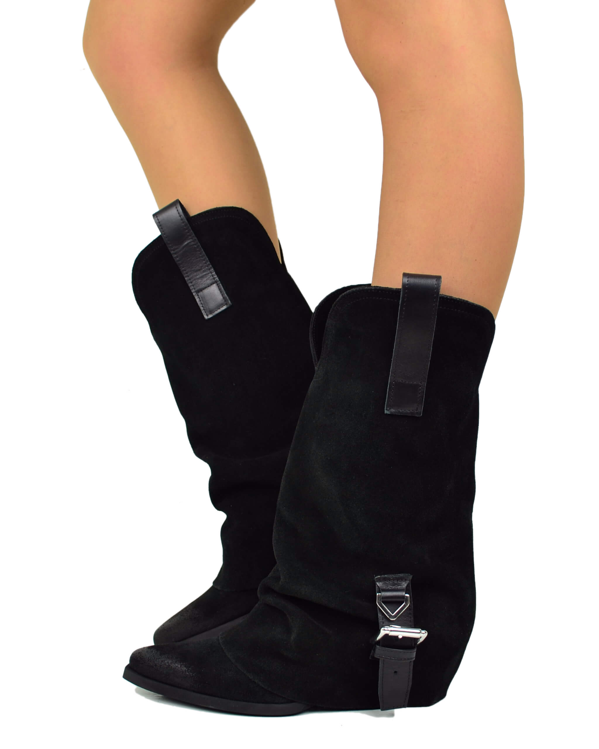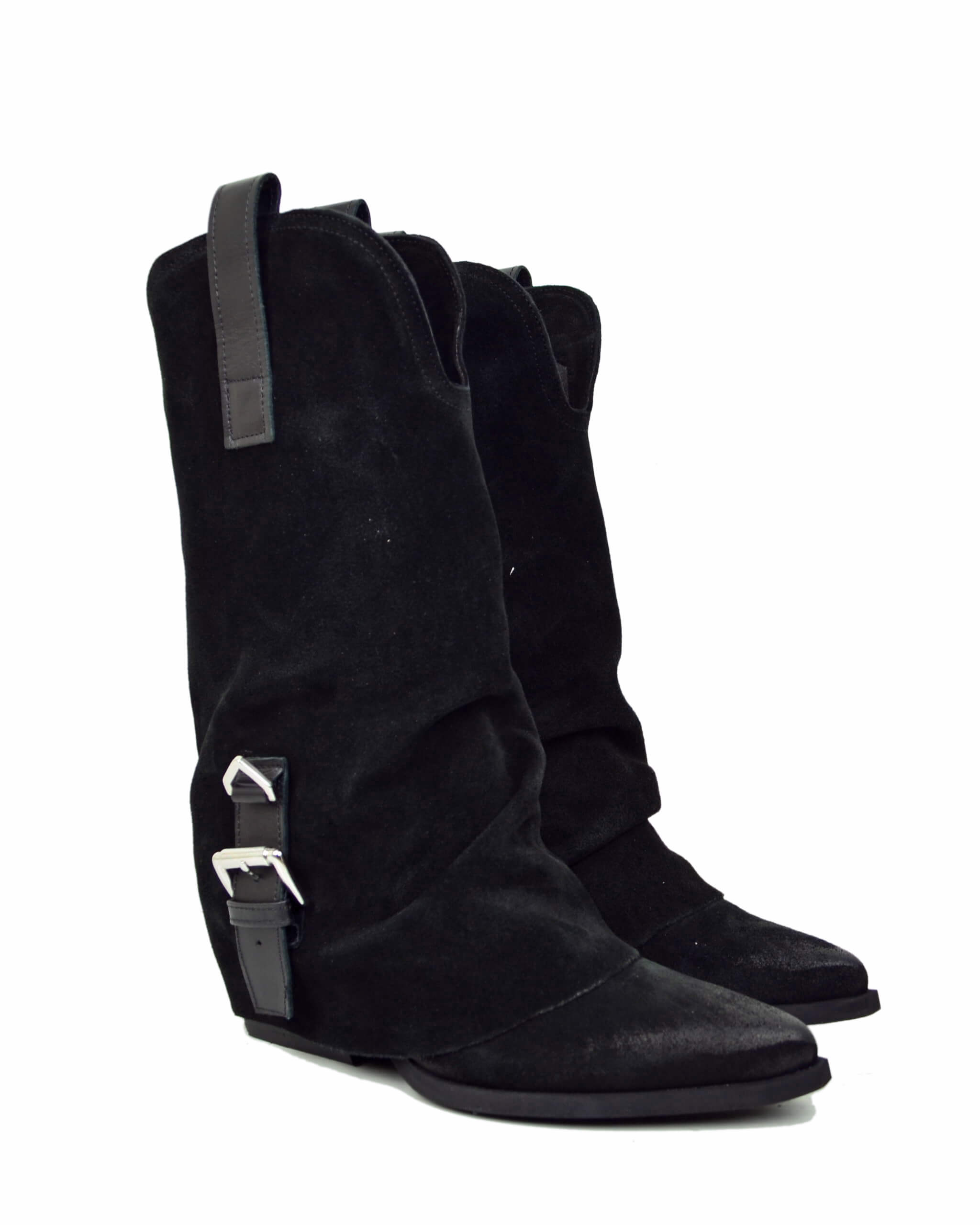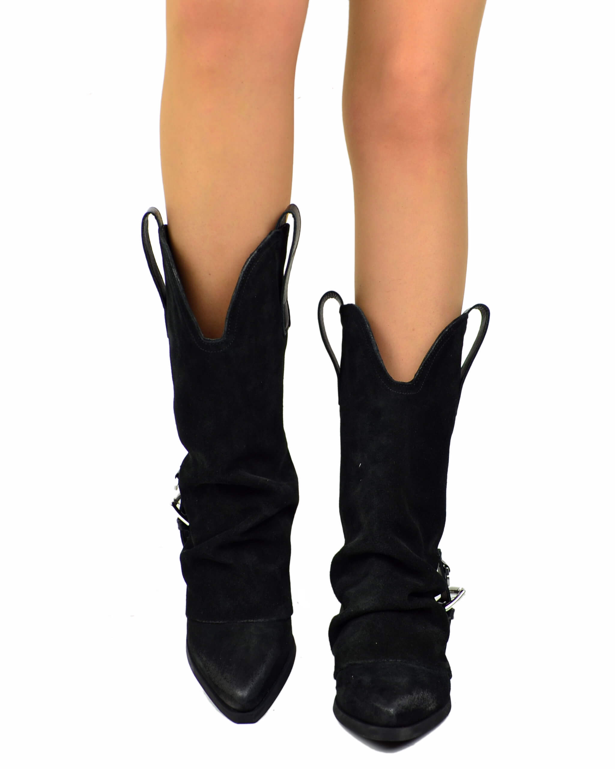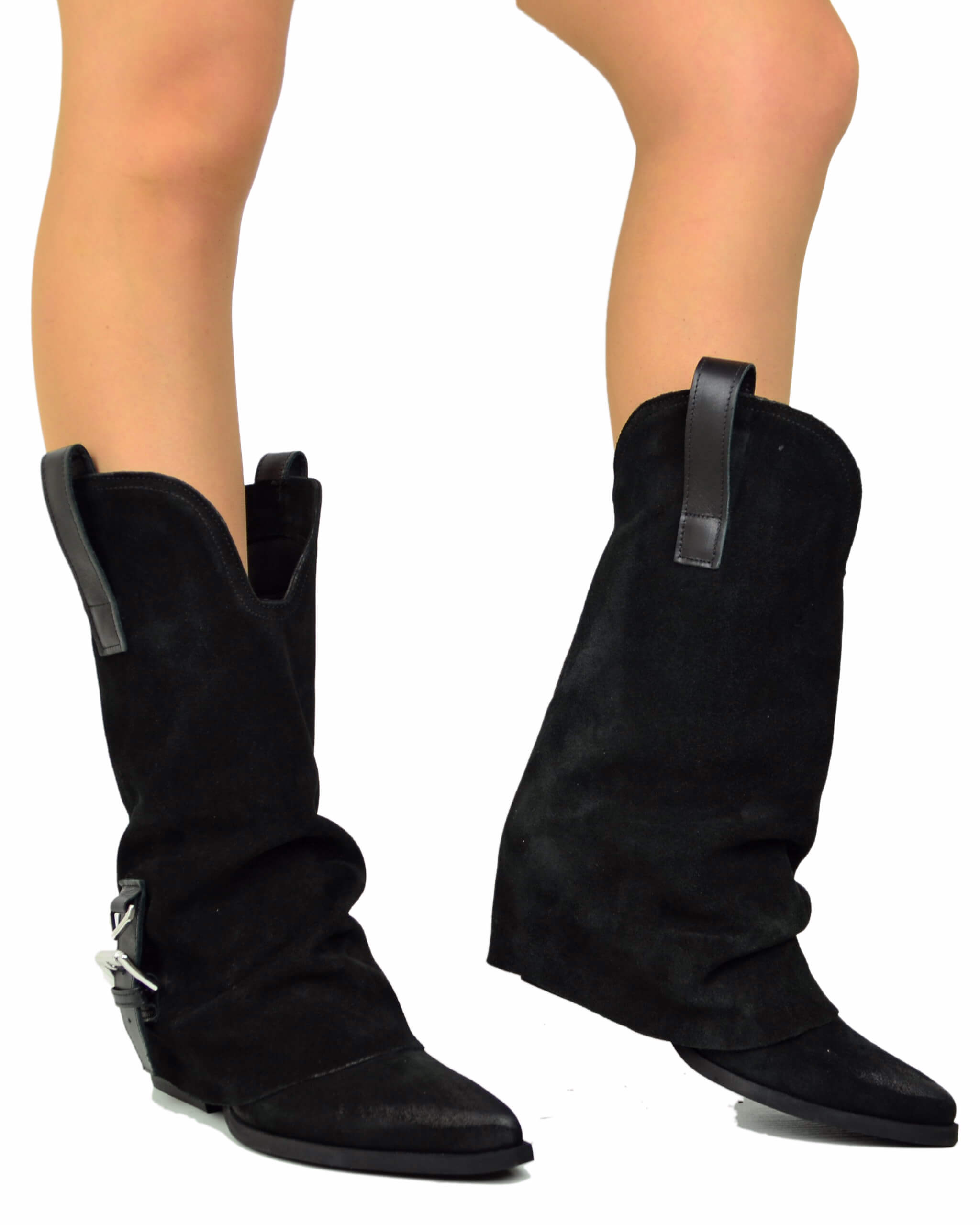 Stivali Texani Donna in Pelle Scamosciata Neri con Ghetta e Fibbia