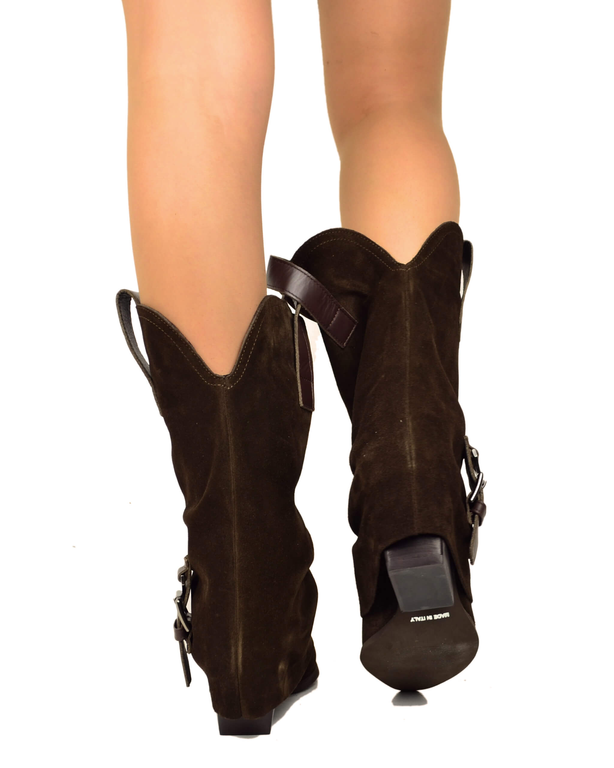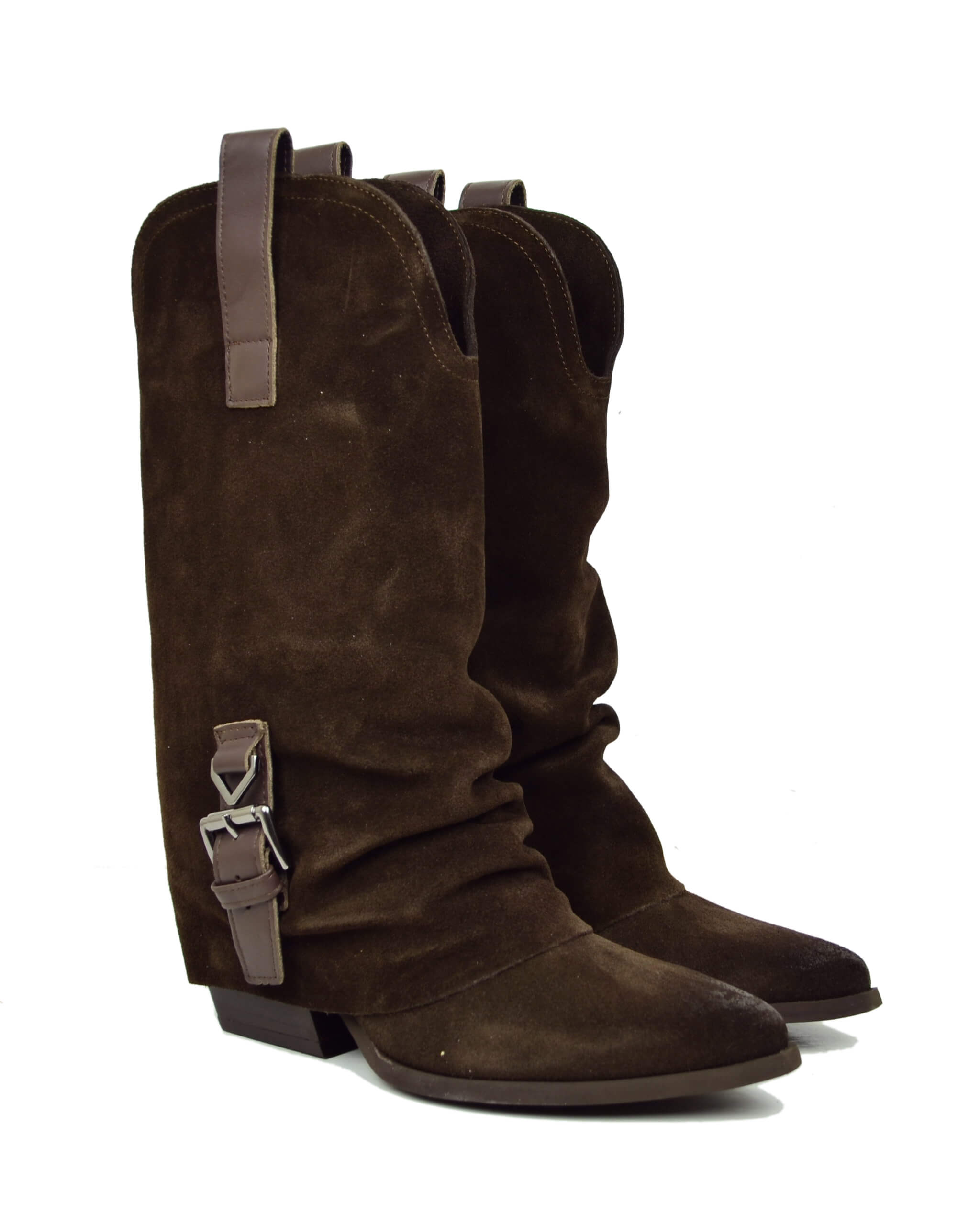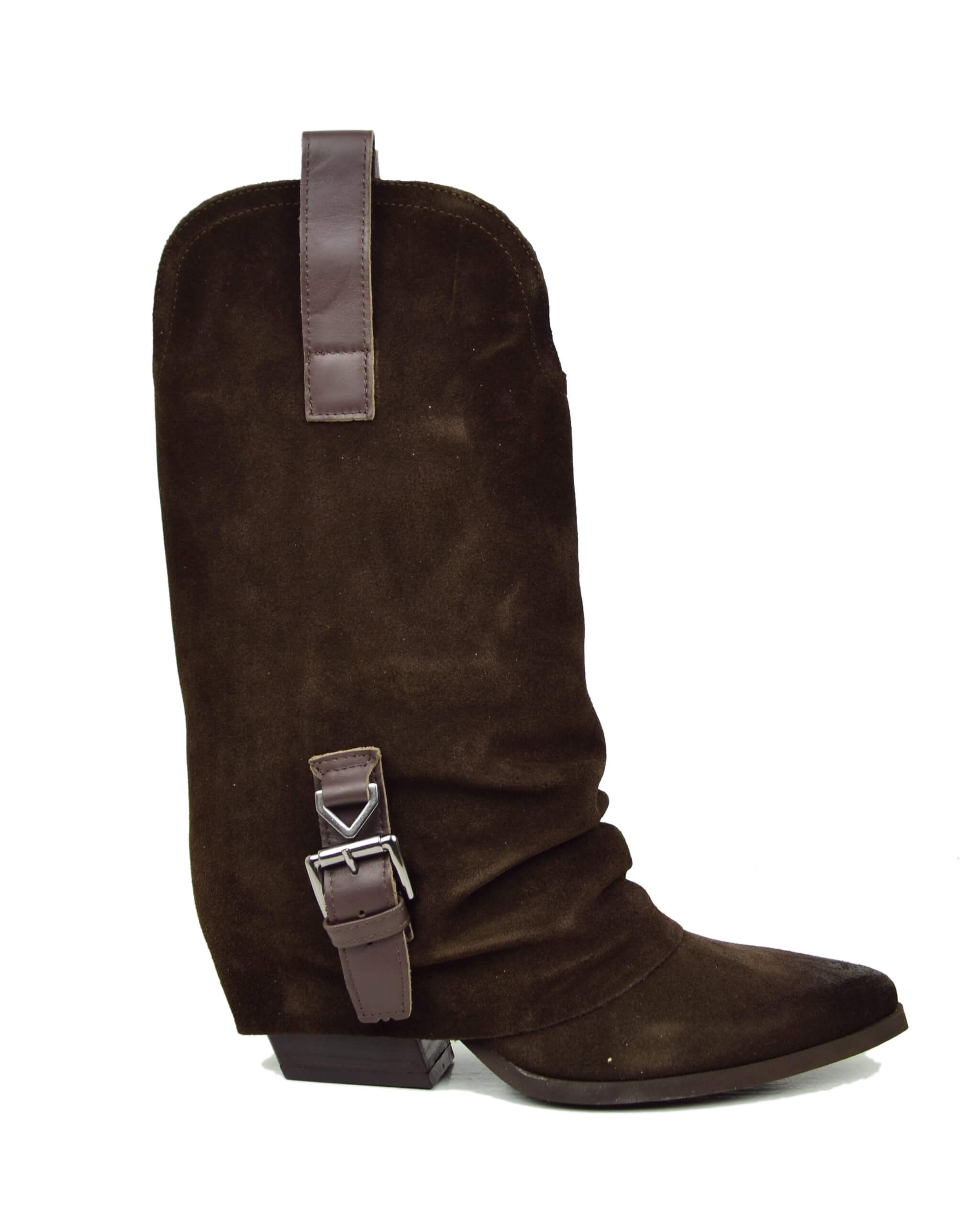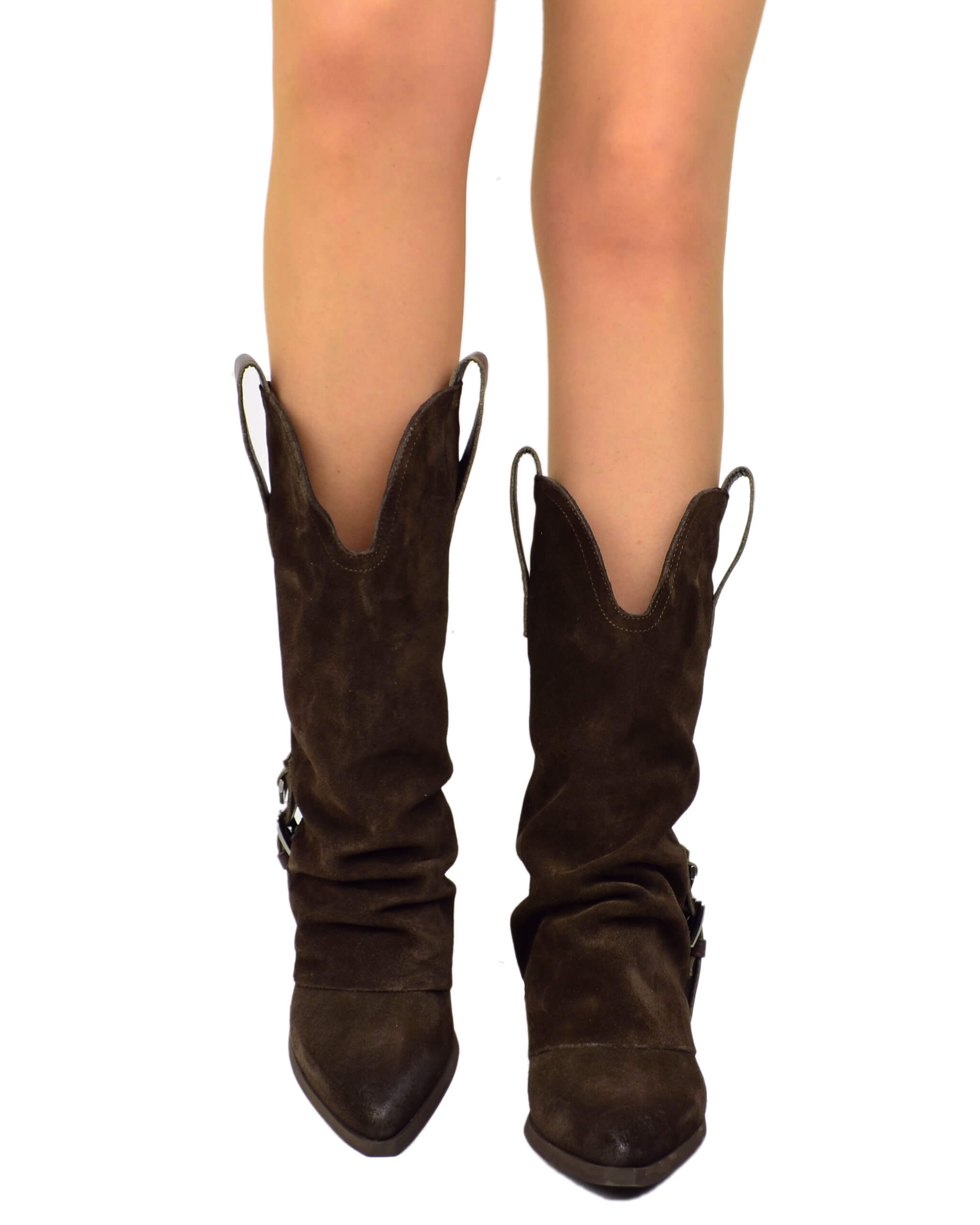 Stivali Texani Donna in Pelle Scamosciata Testa di Moro con Ghetta e Fibbia