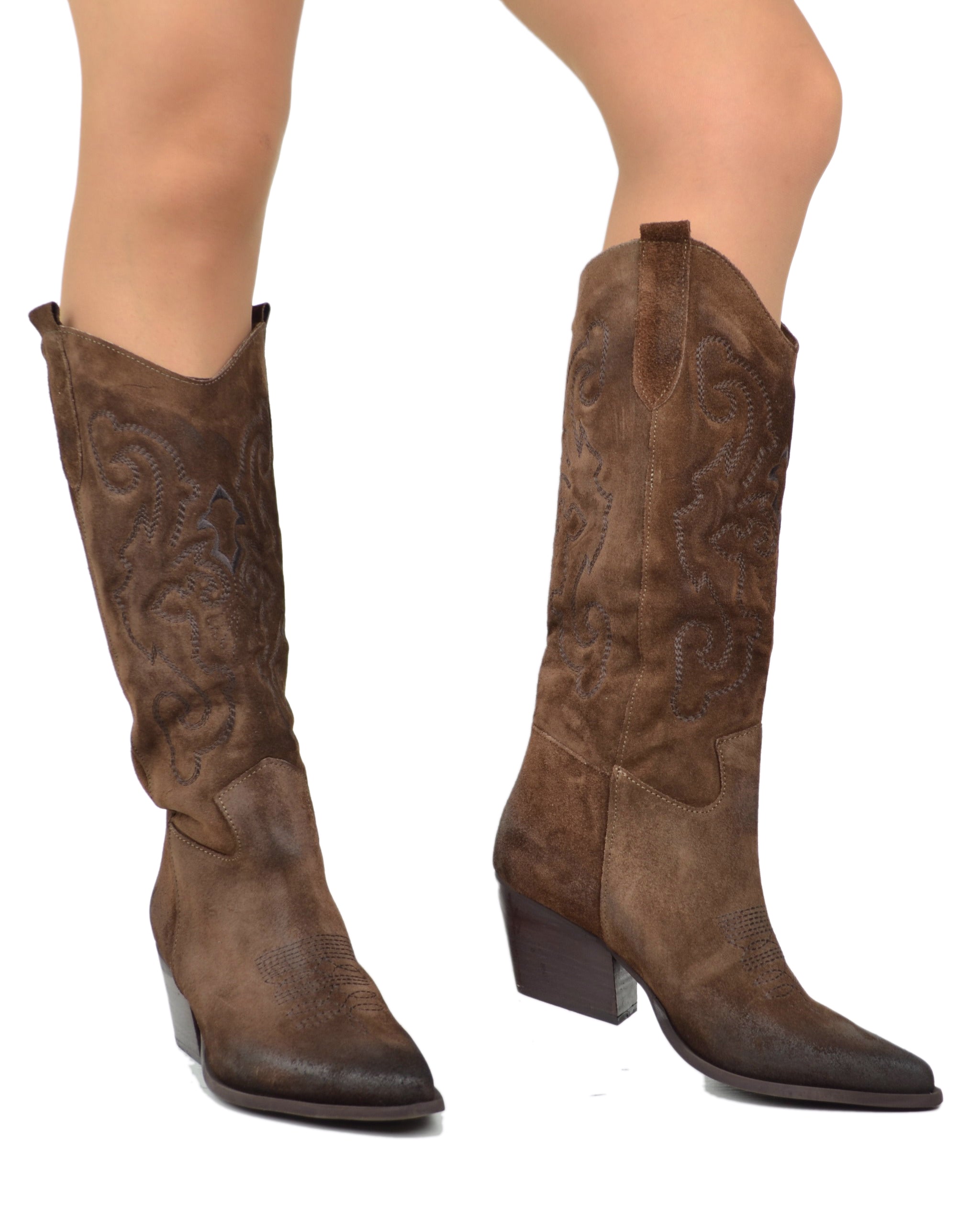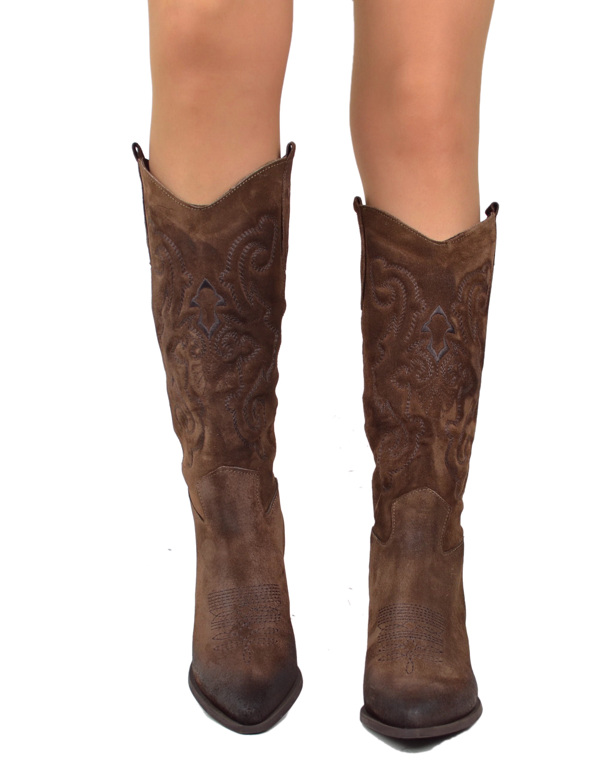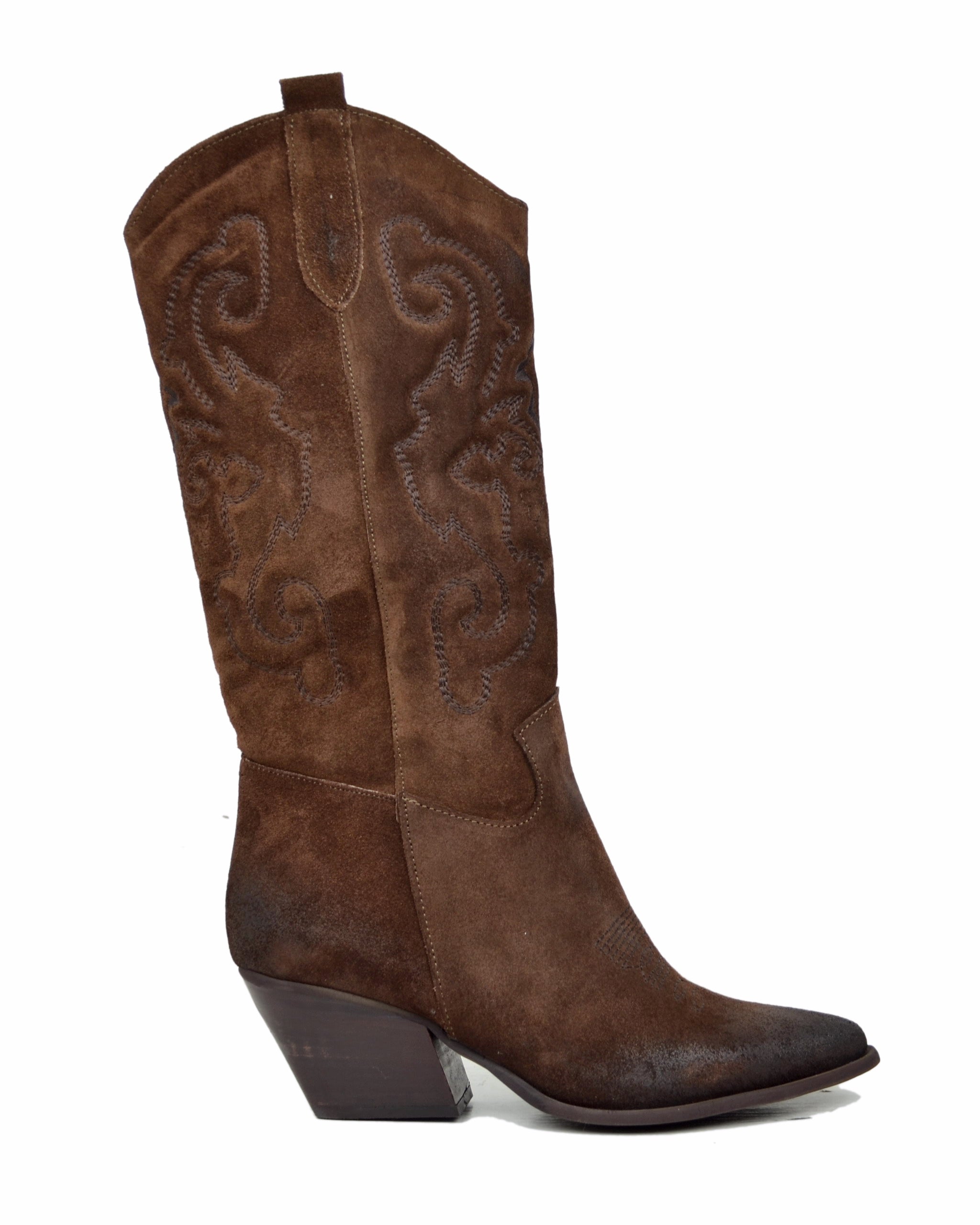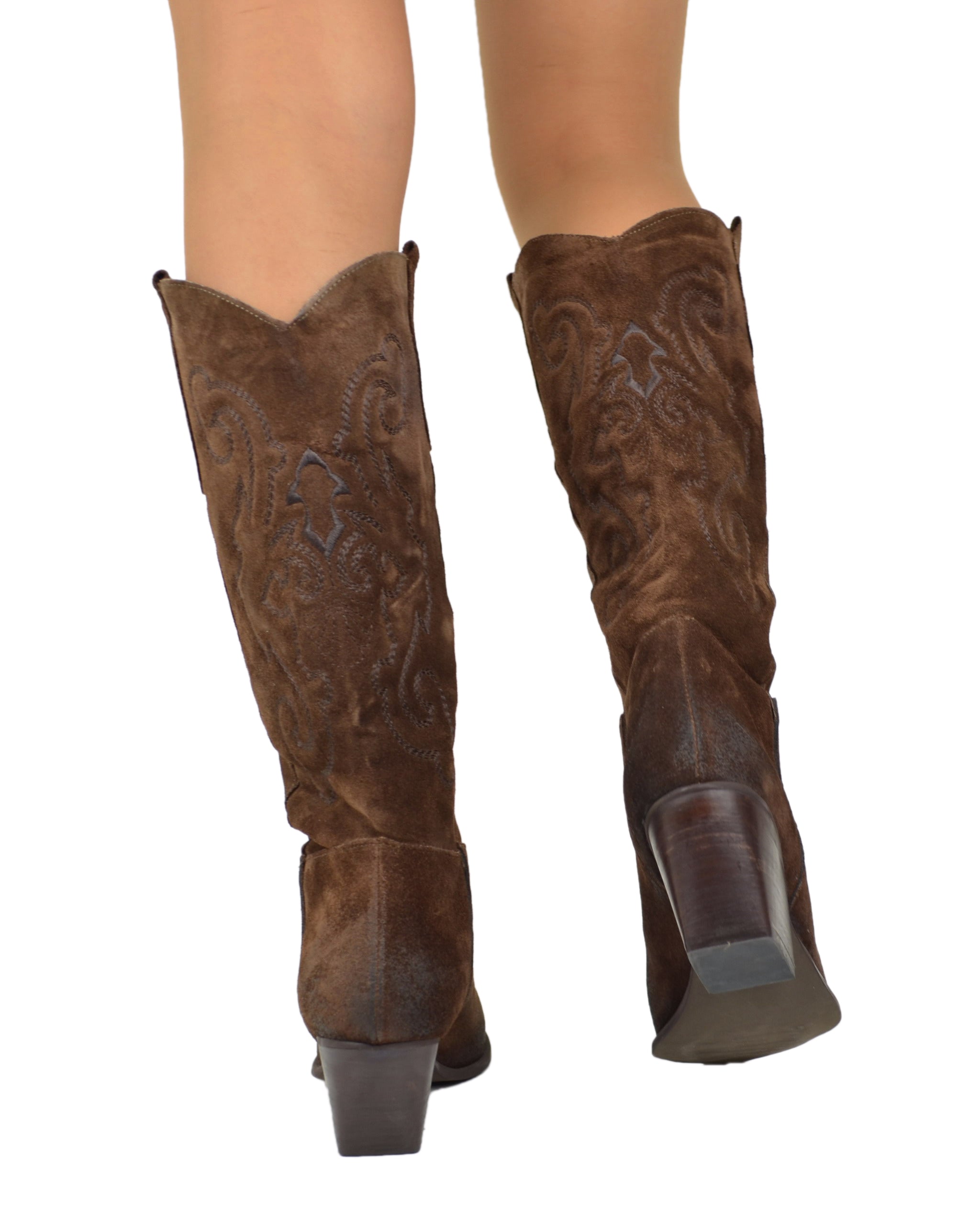 Stivali Texani Marrone Vera Pelle Scamosciata Gambale Trapuntato Tacco Medio