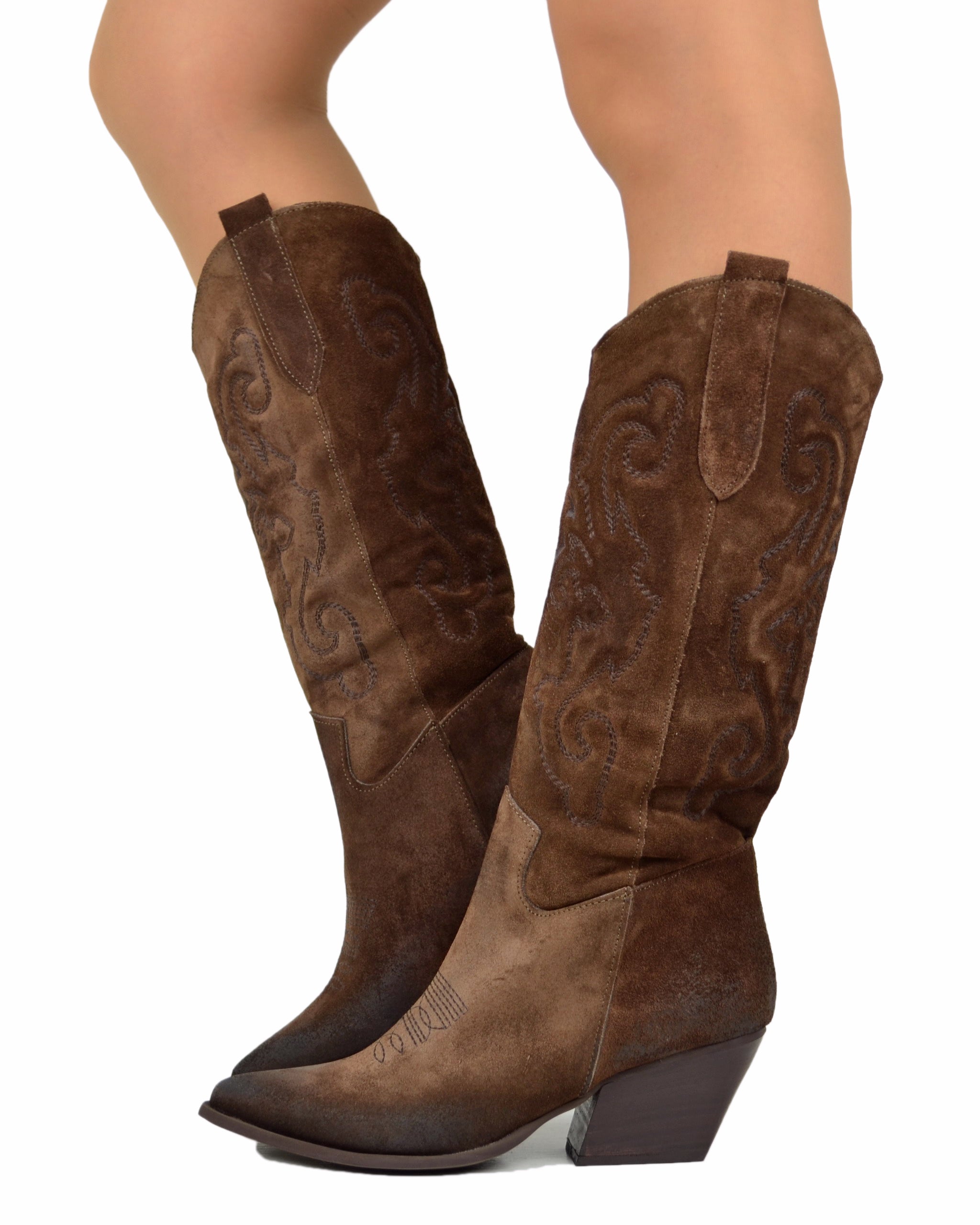 Scopri il fascino irresistibile degli stivali texani in vera pelle scamosciata marrone! Il gambale trapuntato aggiunge un tocco di stile unico, mentre il tacco medio garantisce comfort e un’allure decisa. Perfetti per chi ama un look audace ma senza rinunciare alla praticità. Indossali e lascia che il tuo passo racconti storie di avventure e libertà!